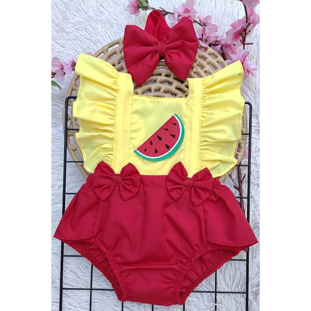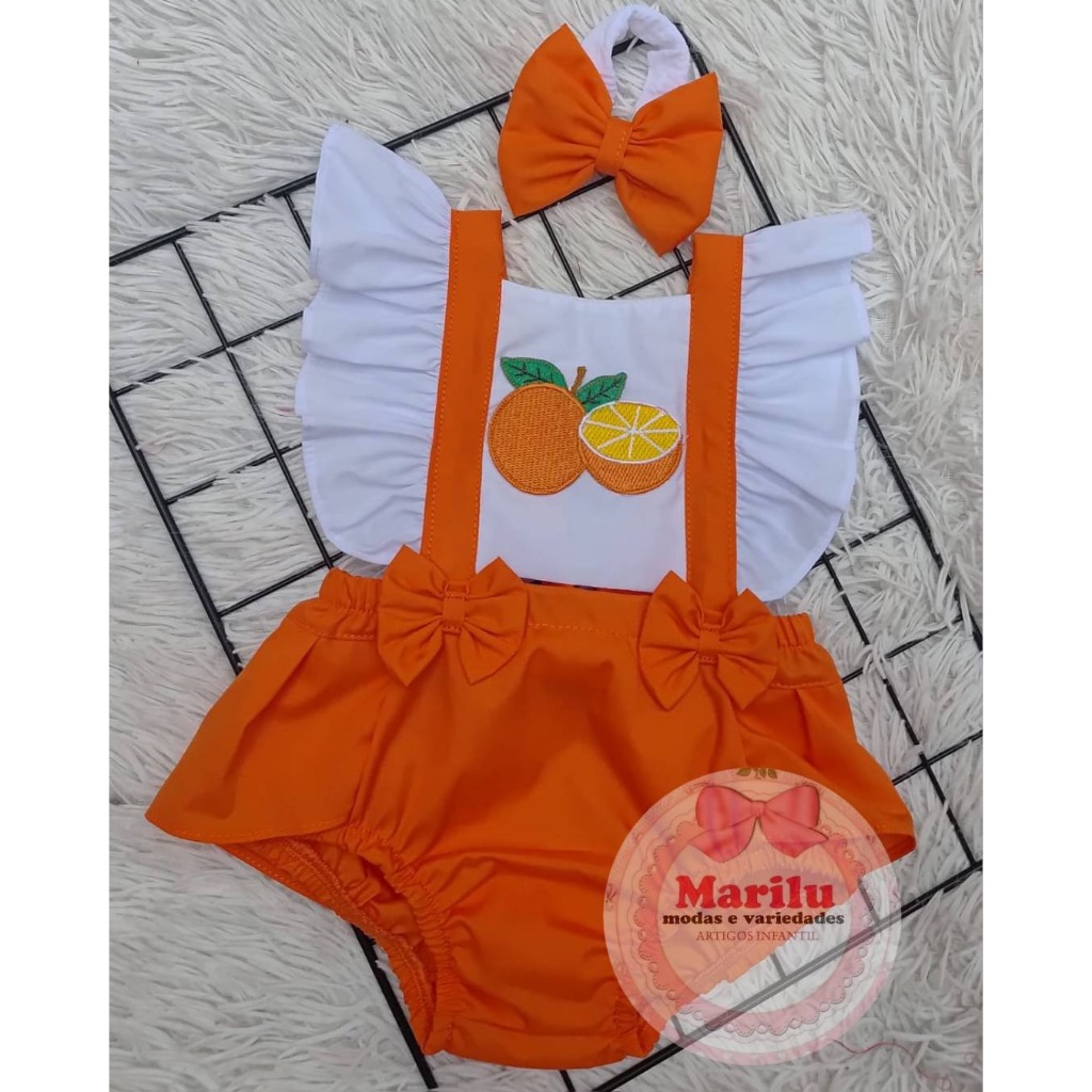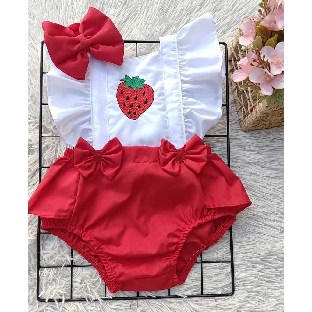 Jardineira romper temático, coleção frutinhas bordadas.