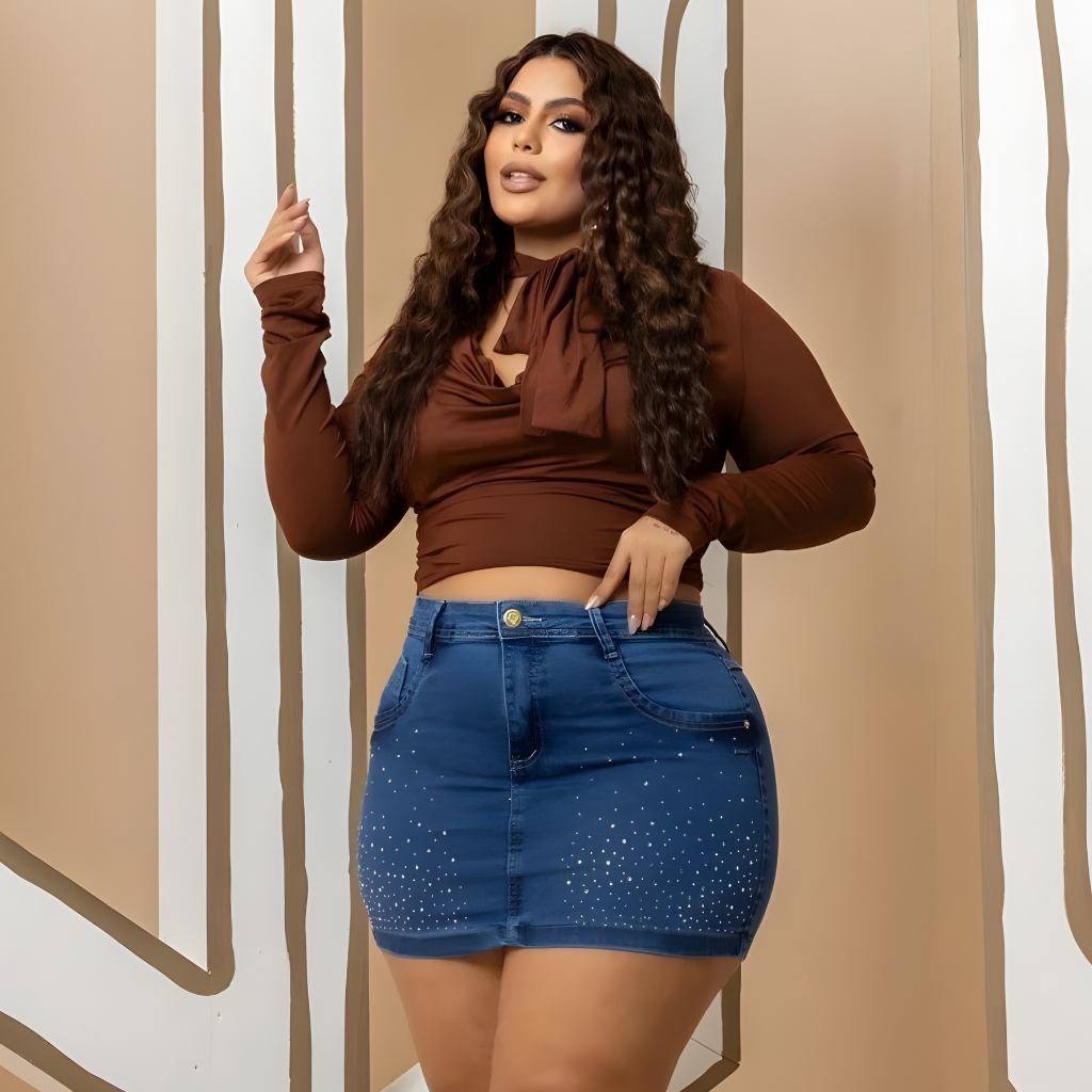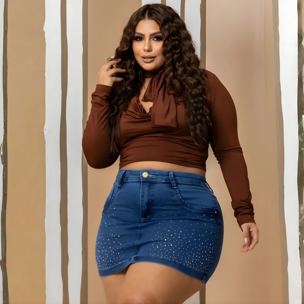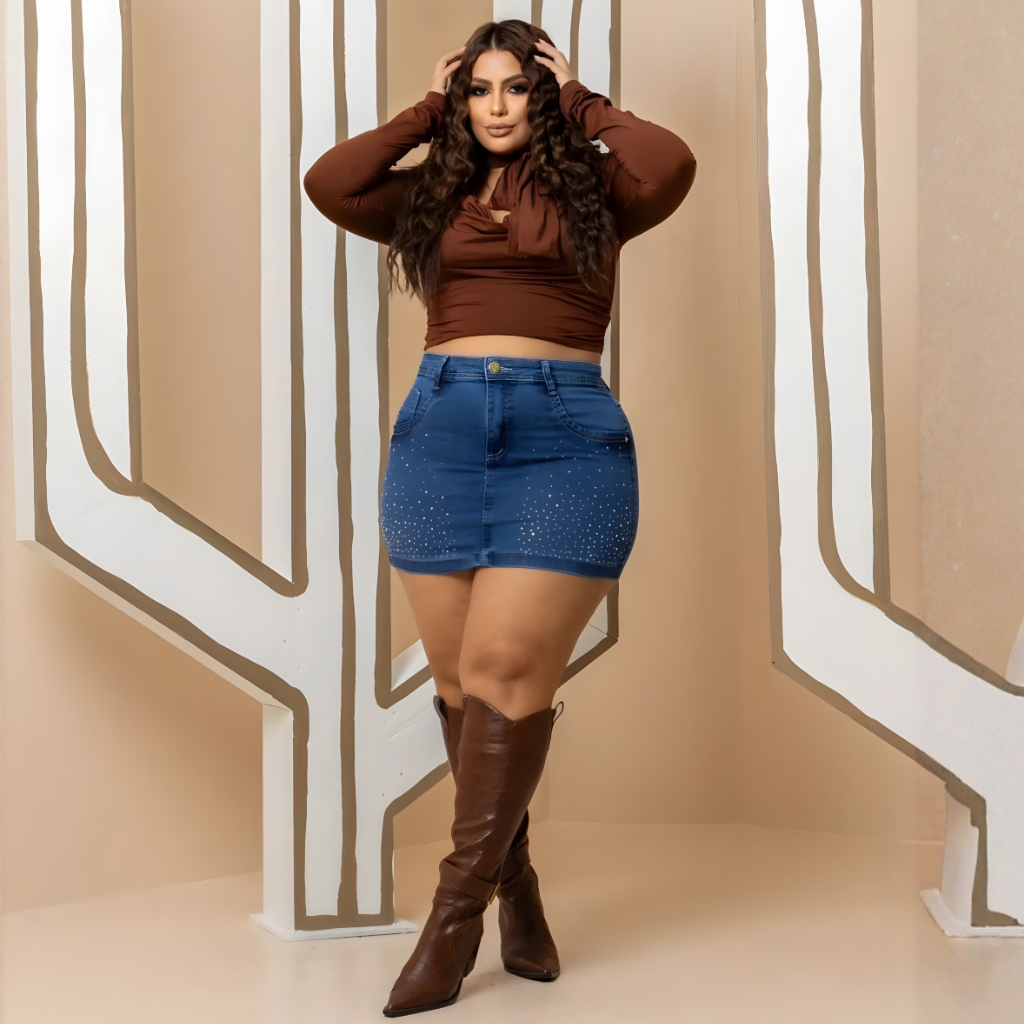 Saia Jeans Feminina Plus Size Curta com brilhos e Lycra Cintura Alta Do 46 ao 56