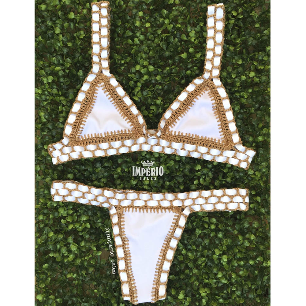 Biquíni Boho Chic Crochê Branco Nude Bege Cappuccino Super Tendência Moda Praia Verão 2025 / 2026