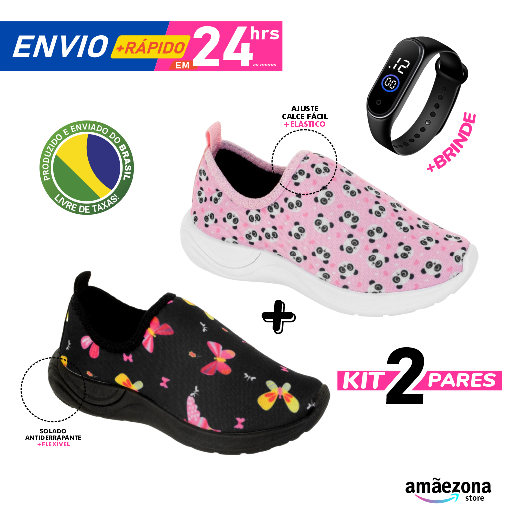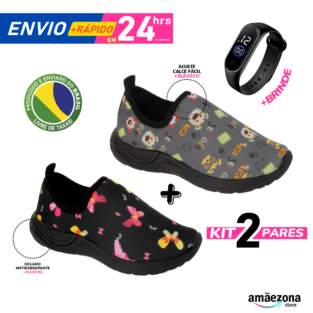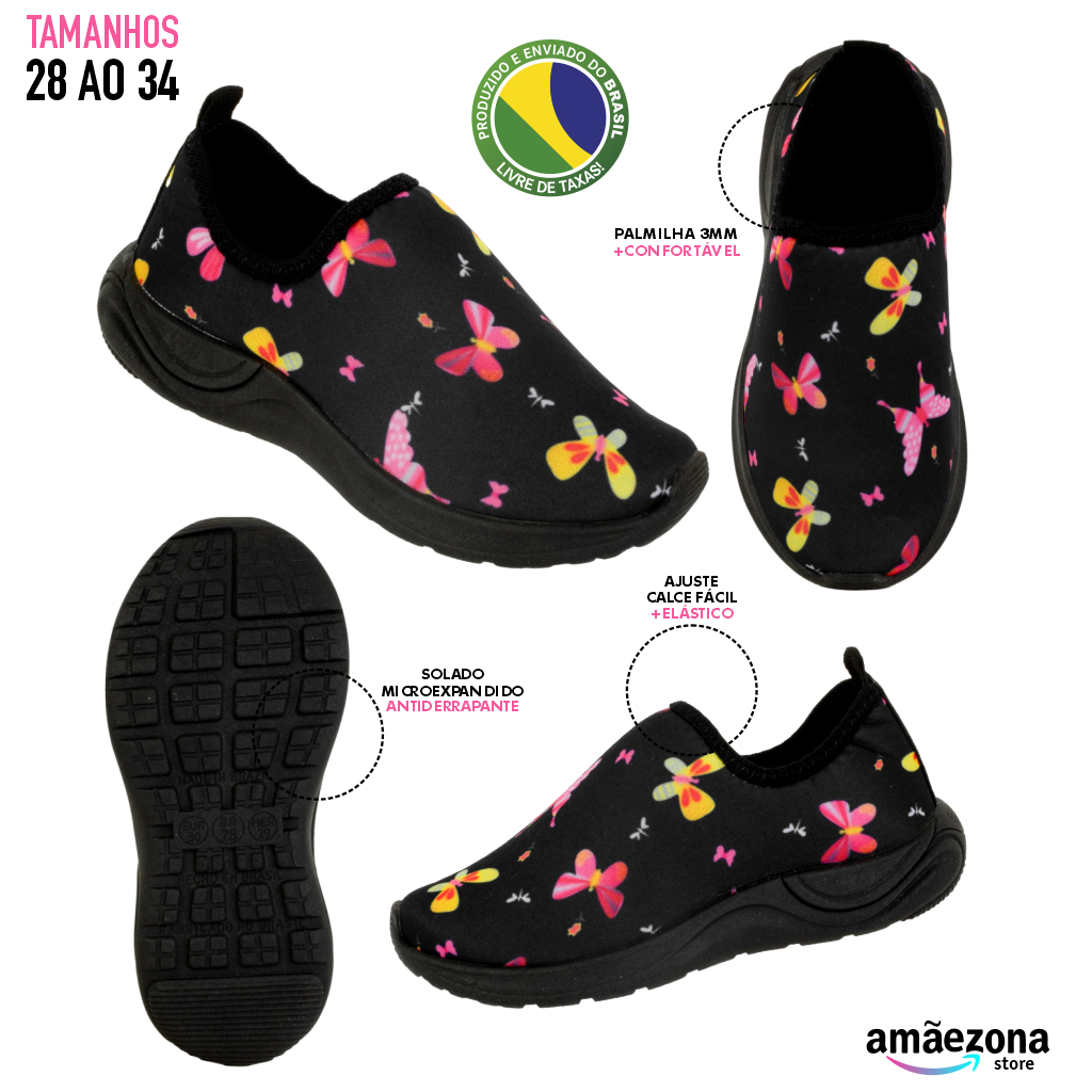 Kit 2 Tênis menina feminino estampa borboleta sola preta solado escuro confortável enfiar o pé