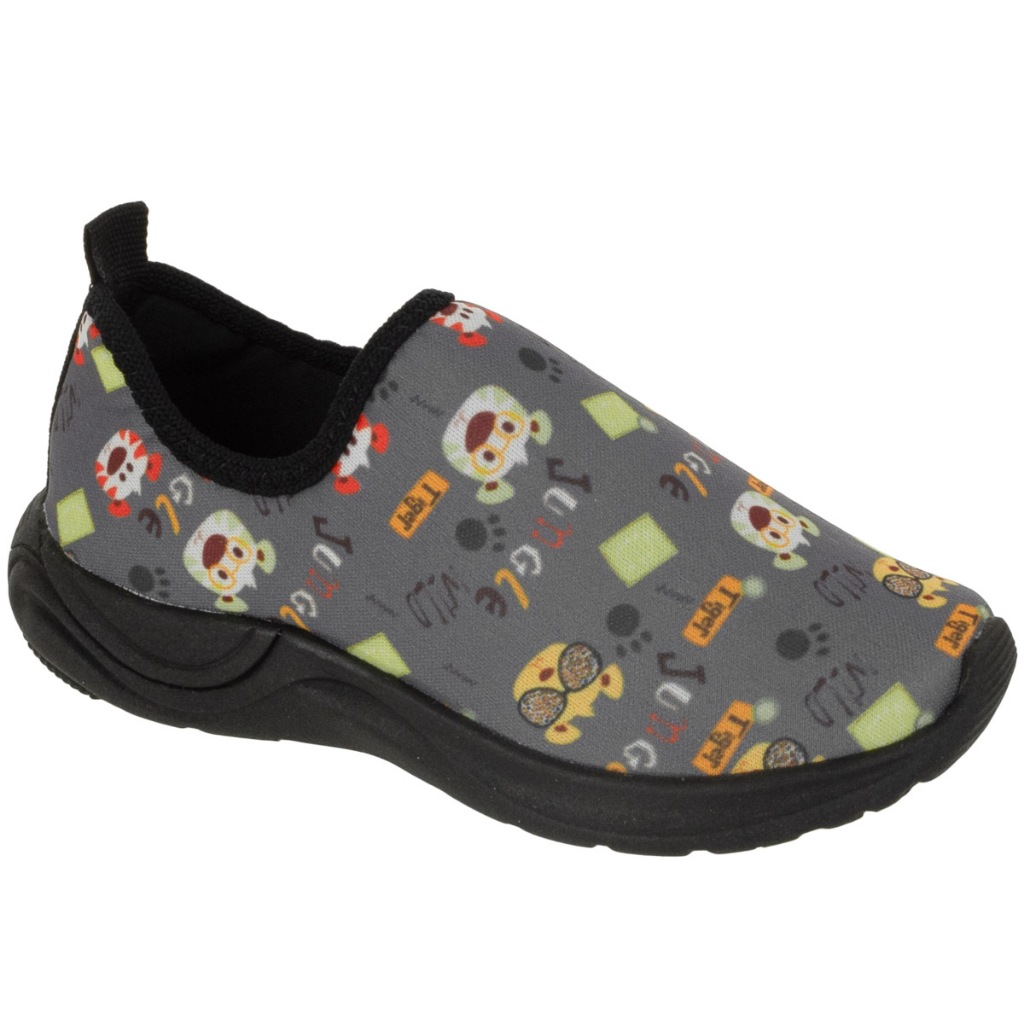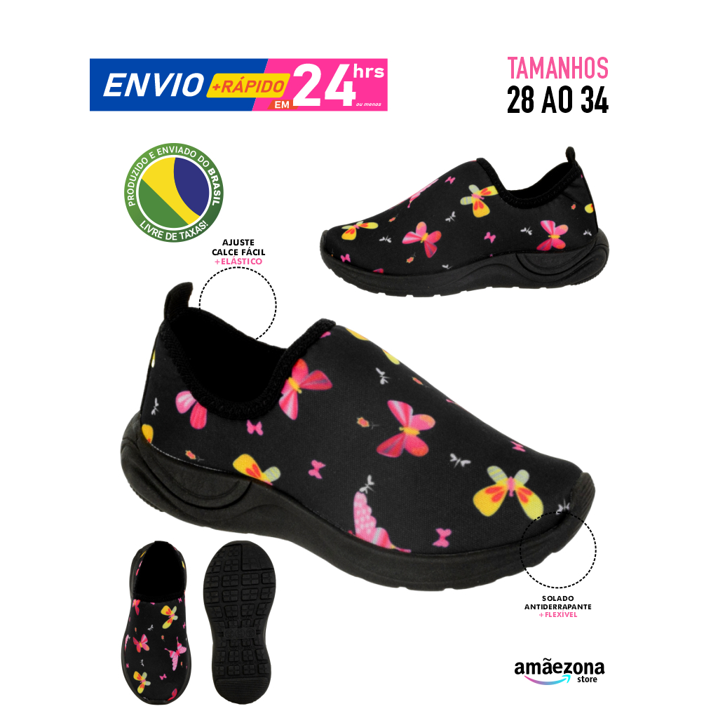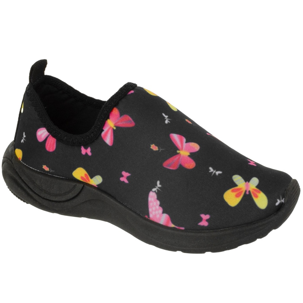 Tênis menina feminino estampa borboleta sola preta solado escuro sem cadarço enfiar o pé