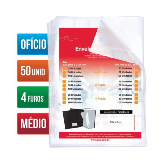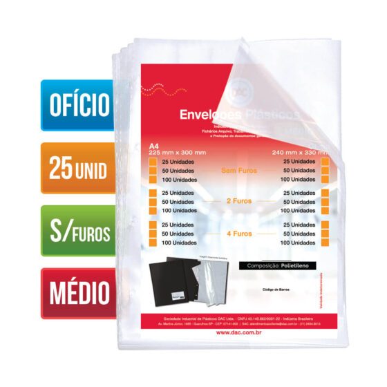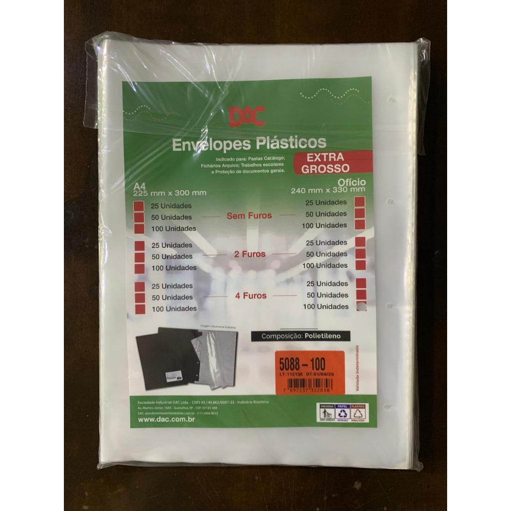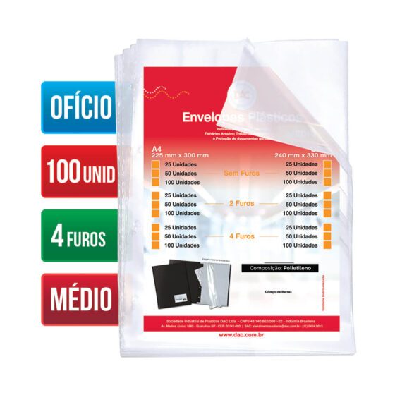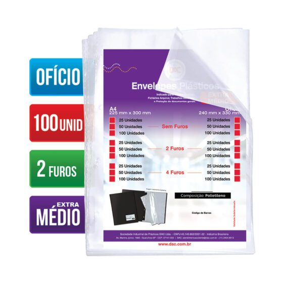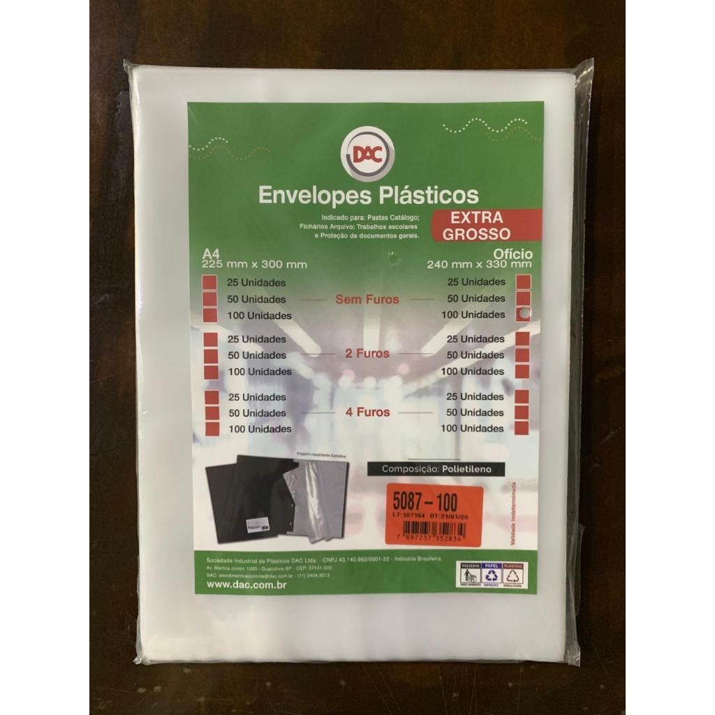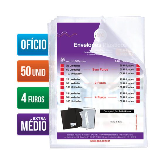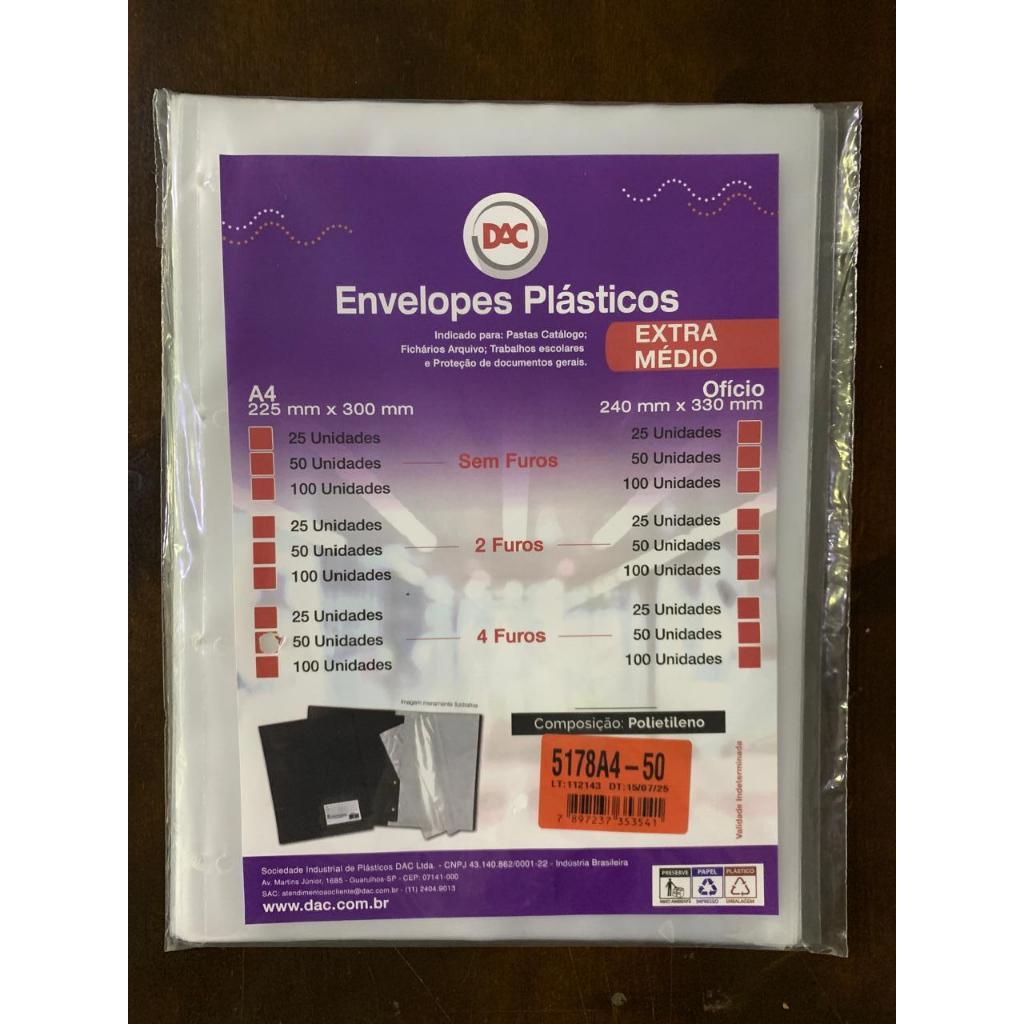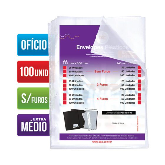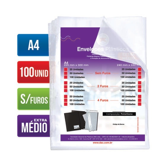 Saco Plástico PE Transparente A4 / Ofício Simples C/ Furos ou Aba Adesiva