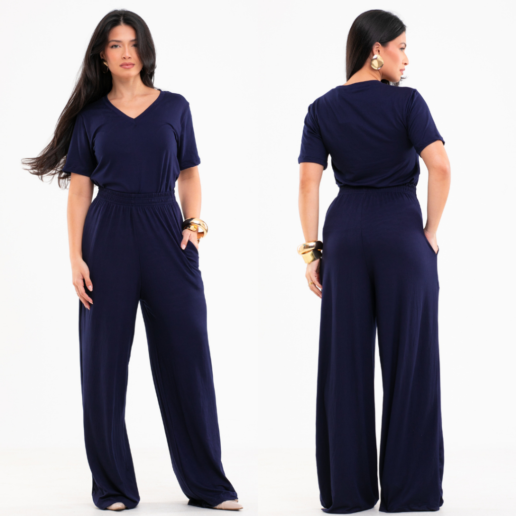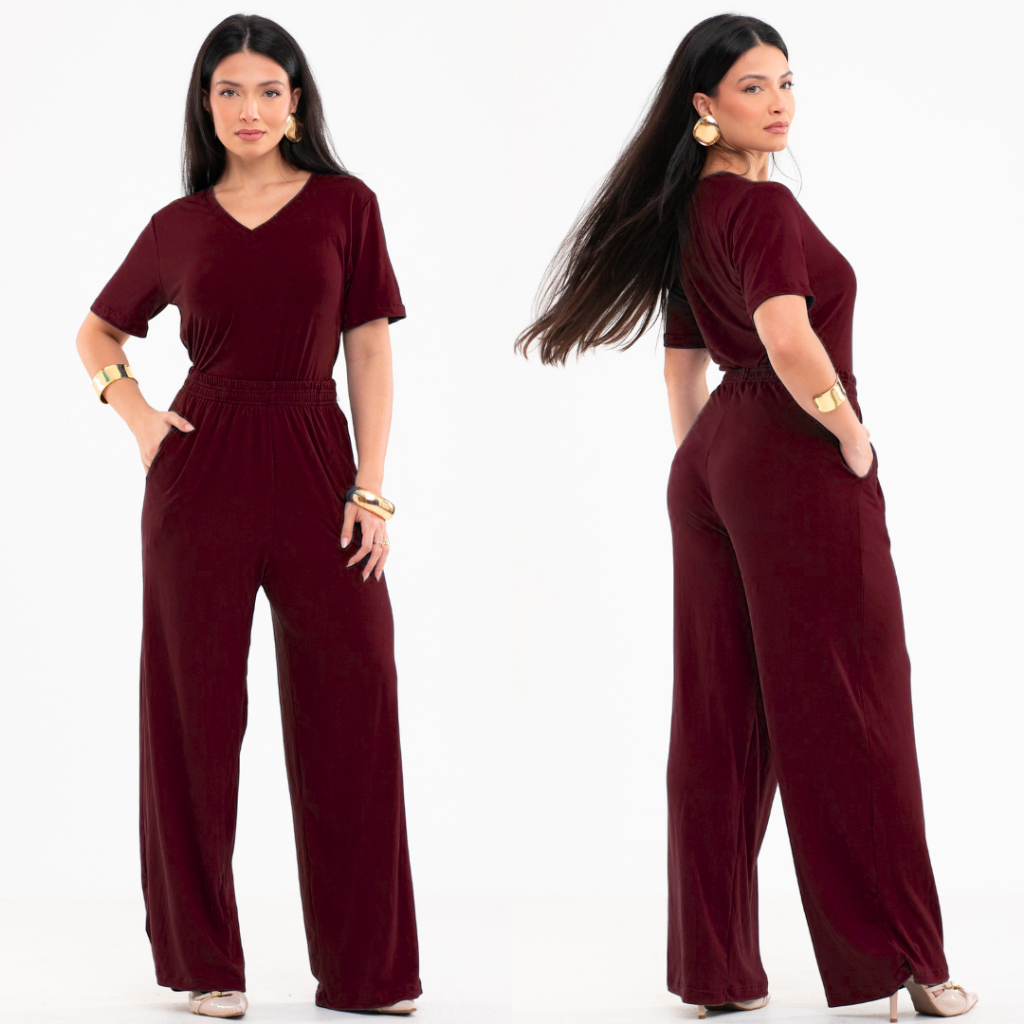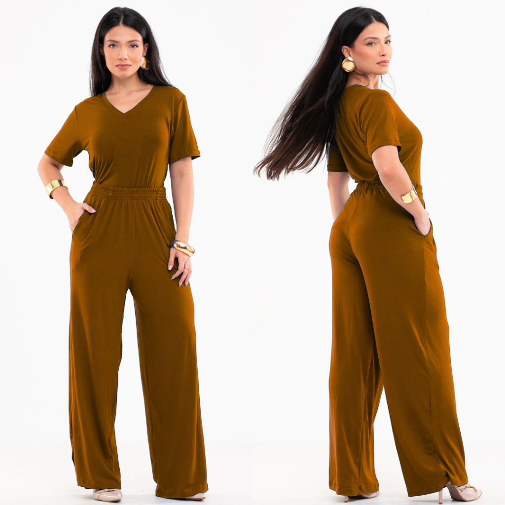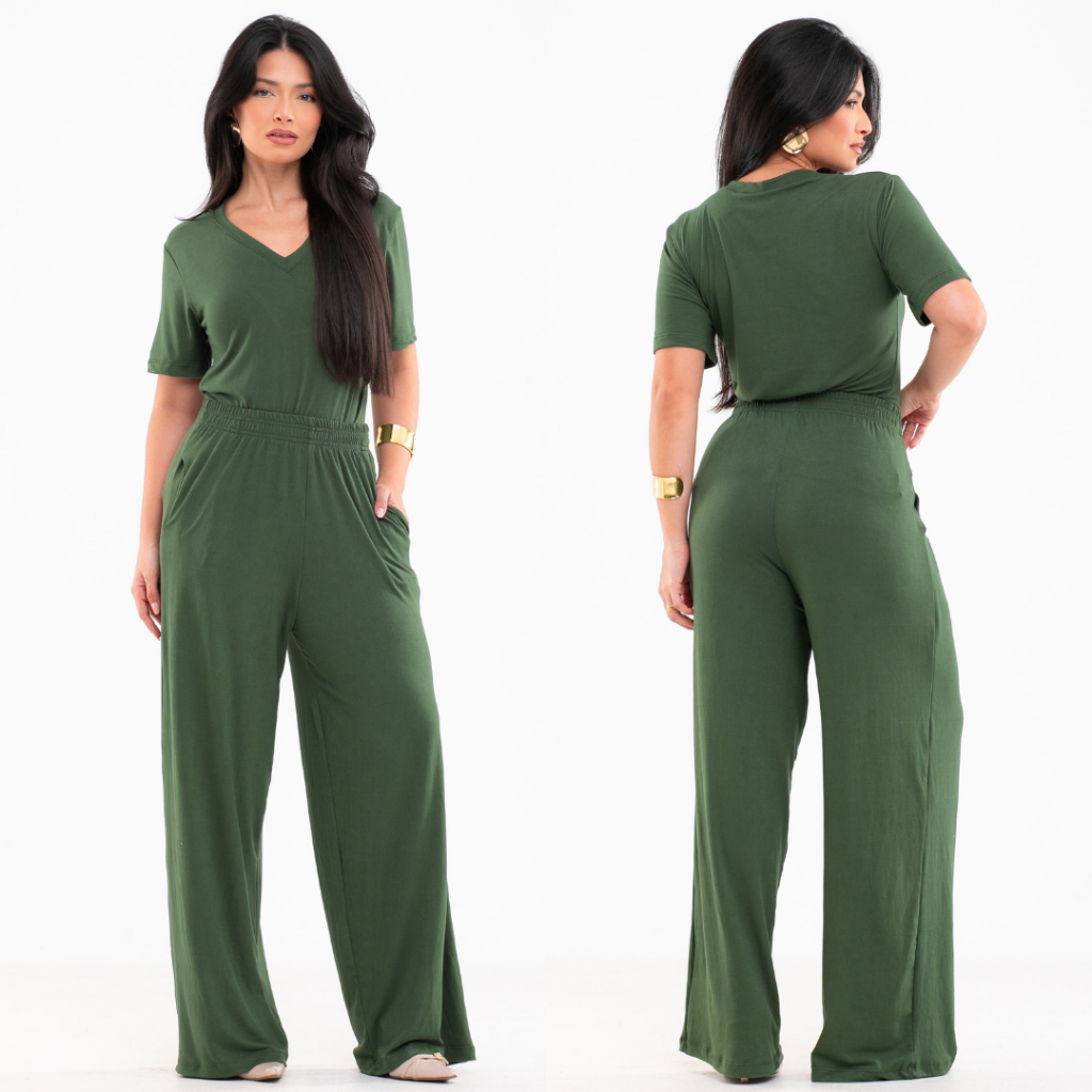 Conjunto Blusa e Pantalona em Malha Suede Light Leve e Macia Calça com Bolsos Blusa Gola V Fardamento Confortável
