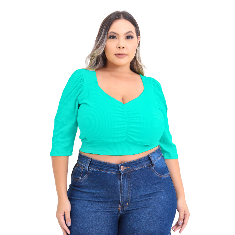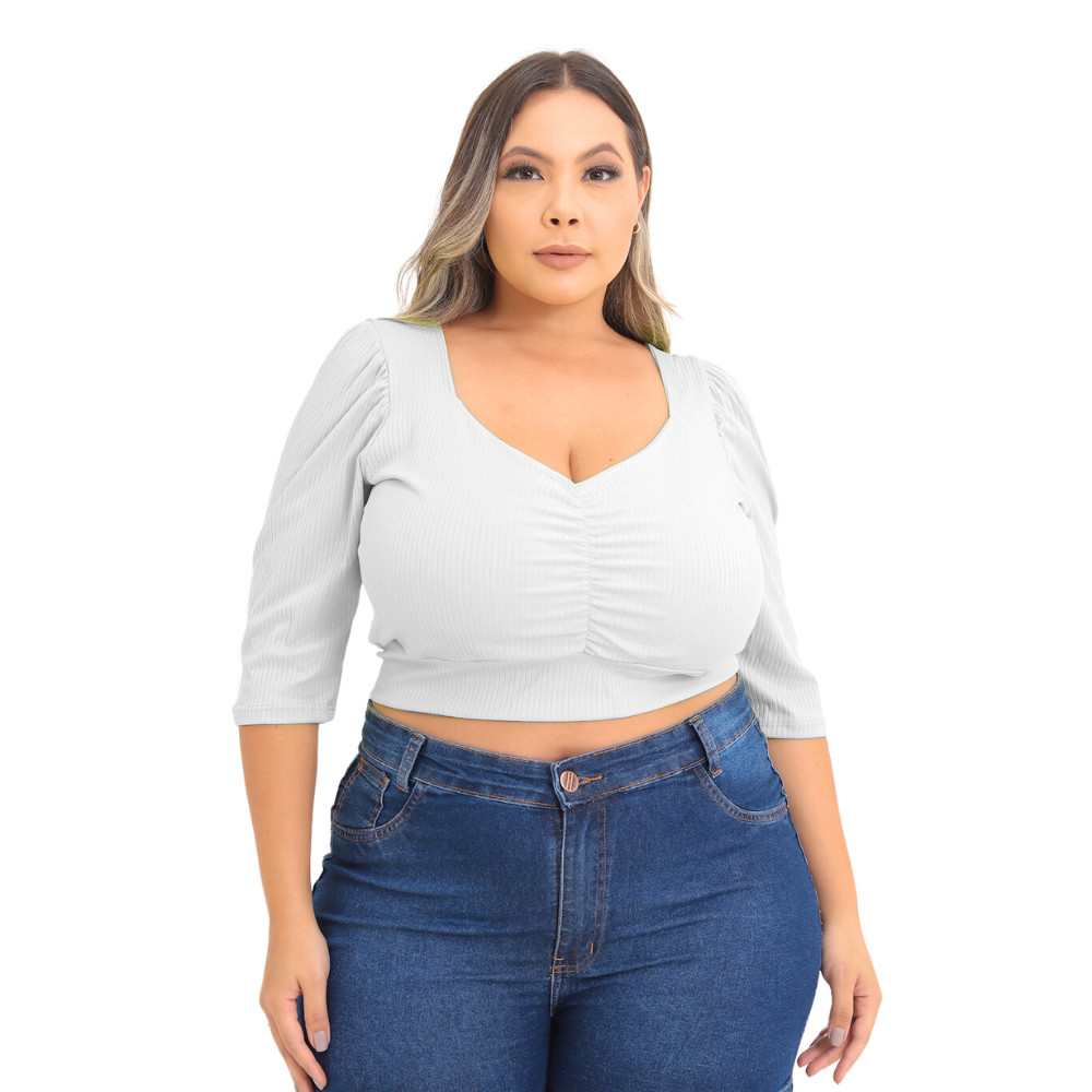 Cropped com Decote Franzido em Malha Canelada Plus Size Moda Grande Manga Princesa Bufante