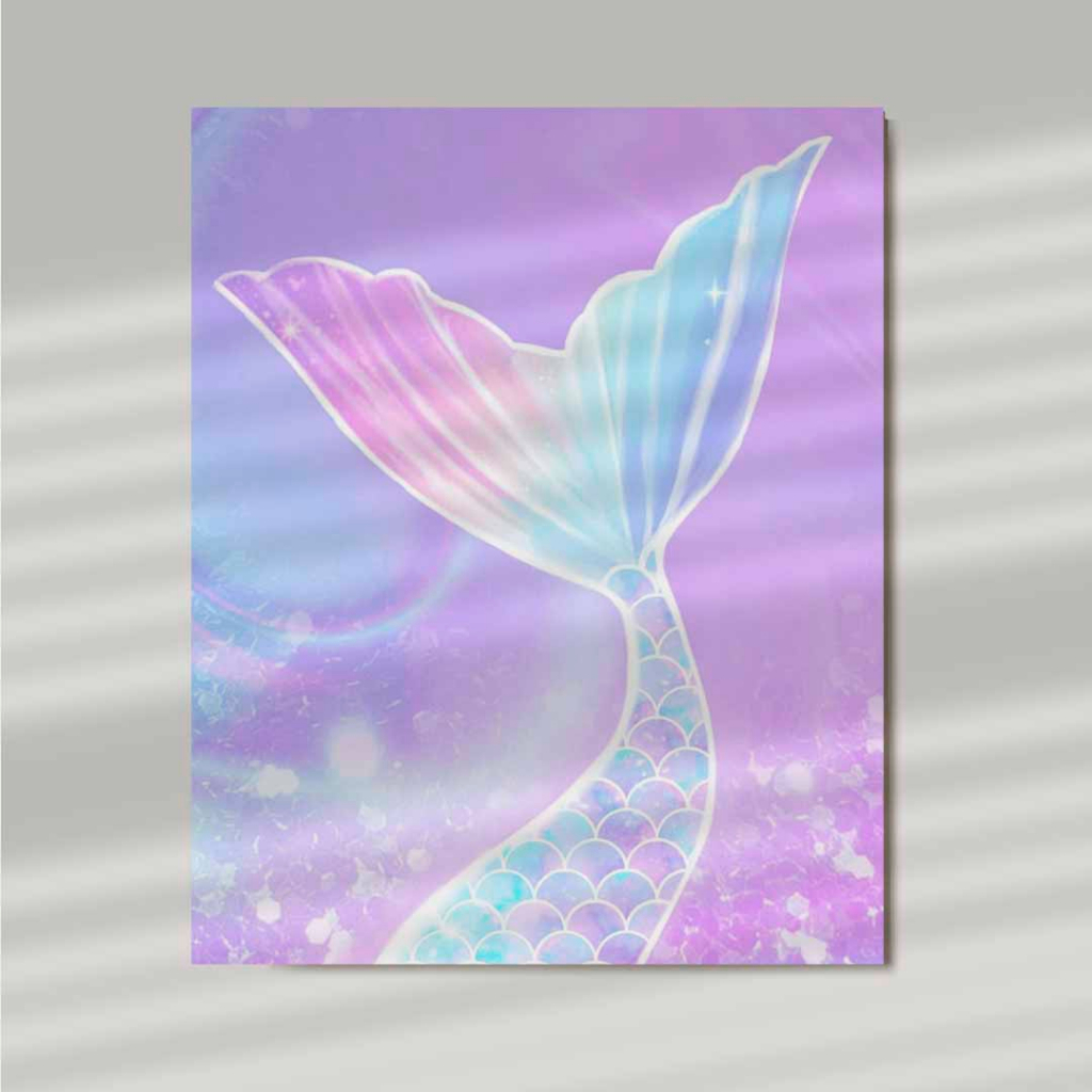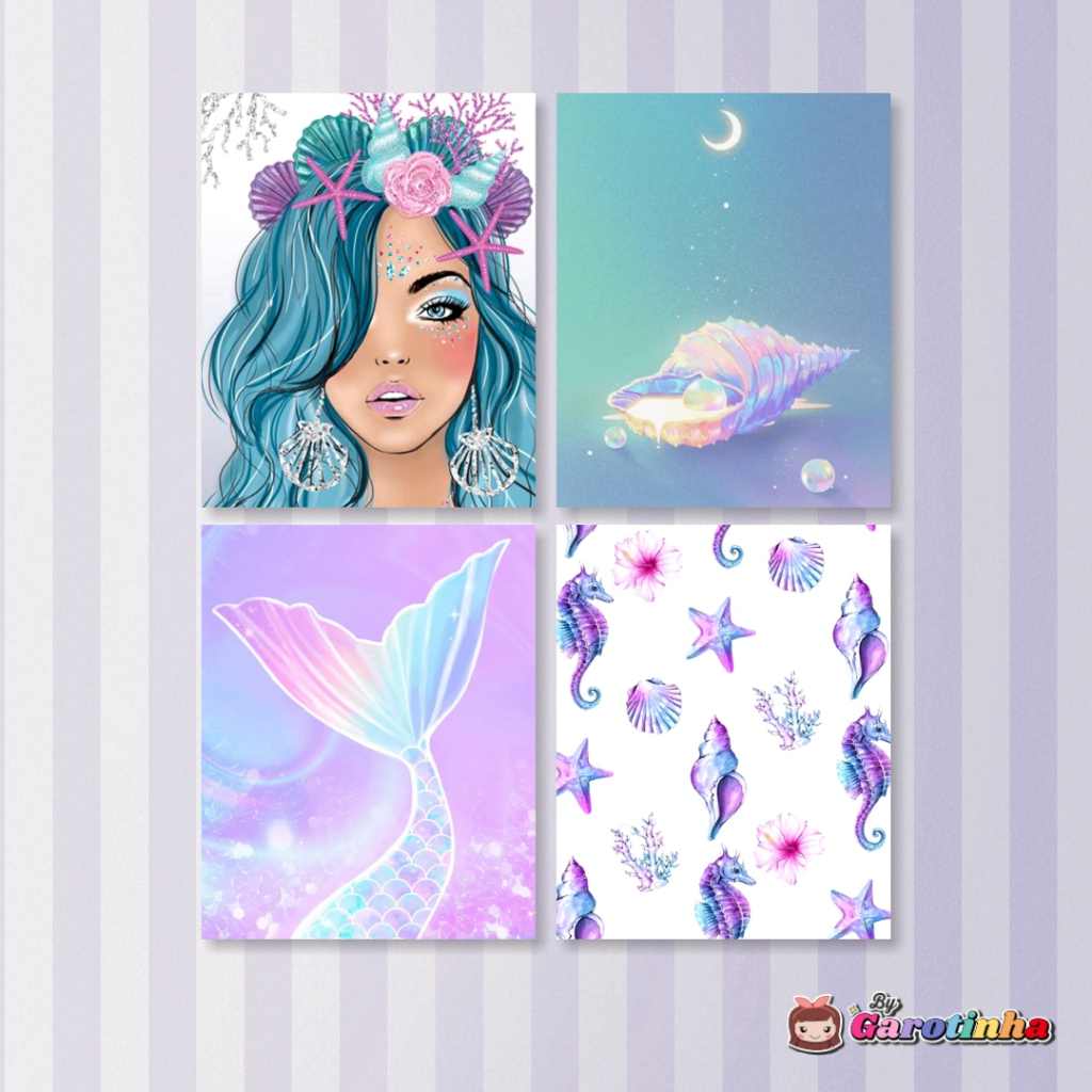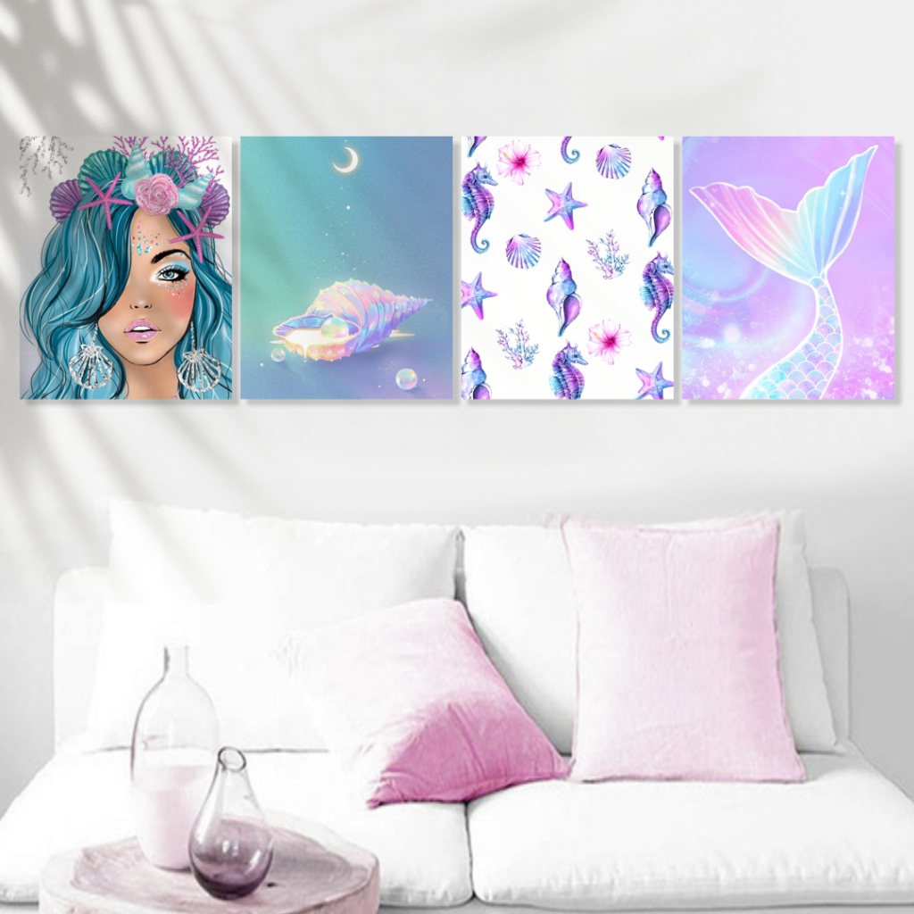 Quadros Decorativos Sereia Concha Calda de Sereia Kit com 4 Placas para Decoração de Quarto Parede Casa