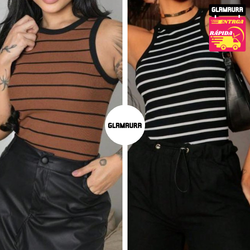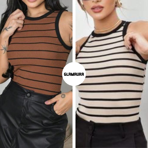 Kit 2 Camiseta Regata Feminina Listradas Canelada Nadador – Blusa Básica Ribana