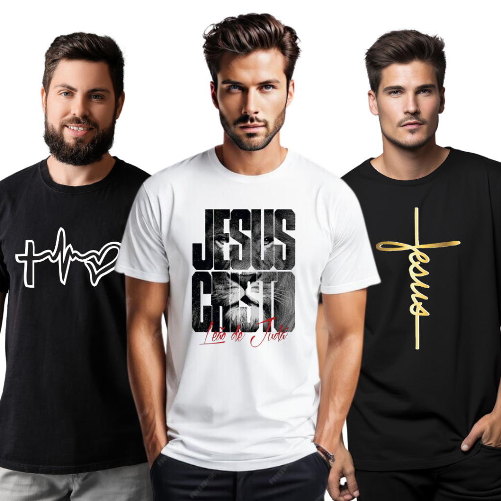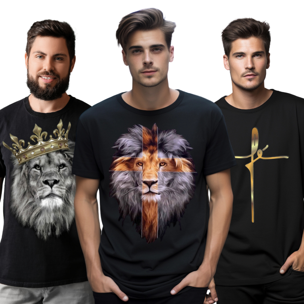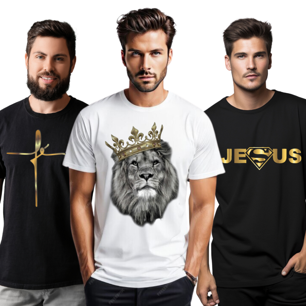 Kit 3 Camisetas Gospel Masculinas Jesus Leão de Judá Fé Cristã Love Estampas Religiosas