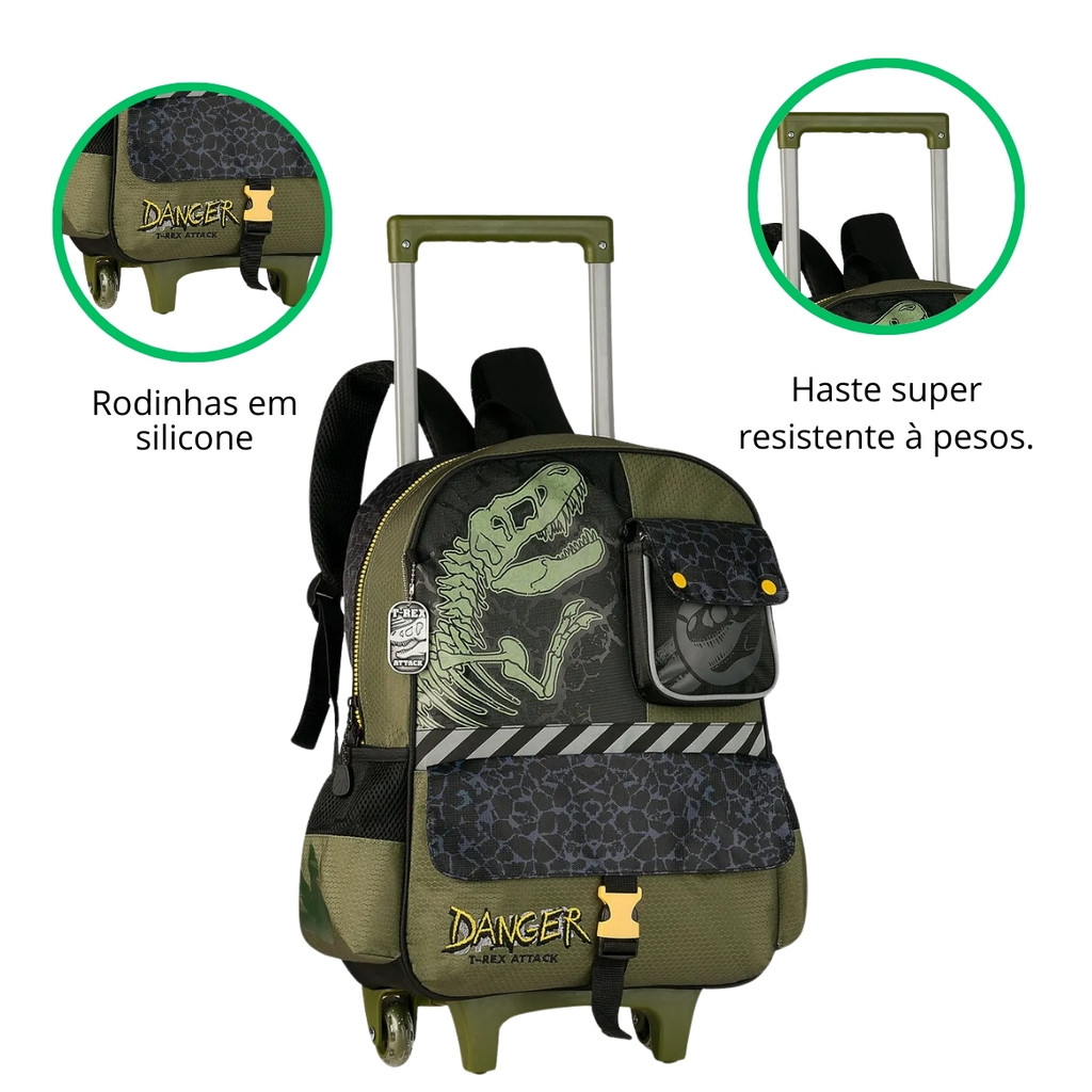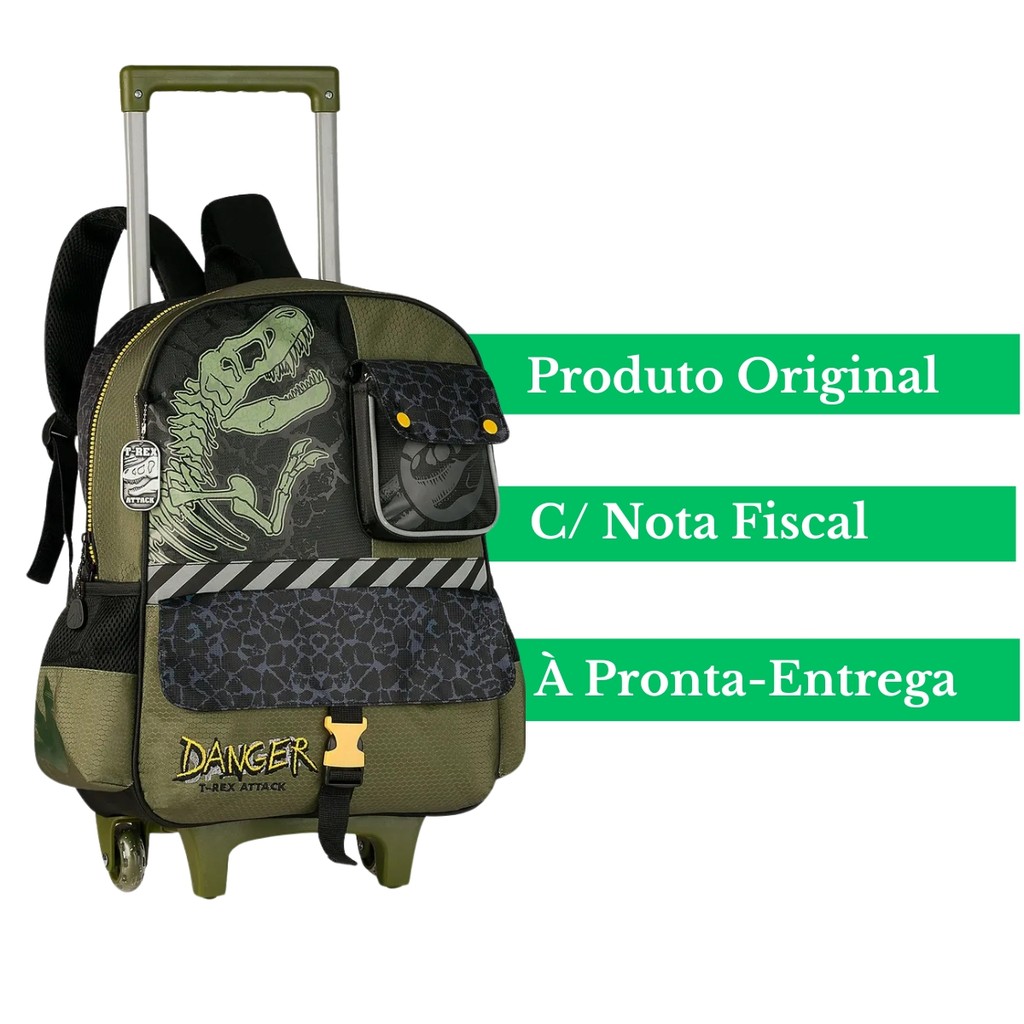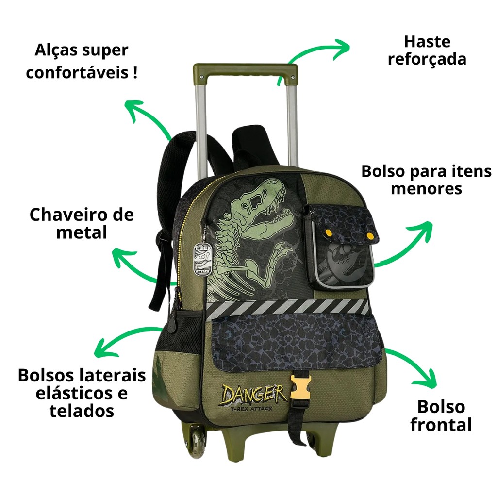 Mochila De Rodinhas Infantil Dinossauro T-Rex Ideal Para Escola E Passeios Com Chaveiro De Metal Volta ás Aulas - Clio
