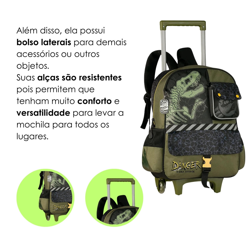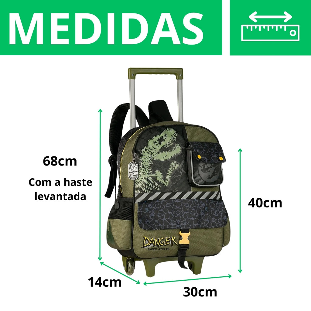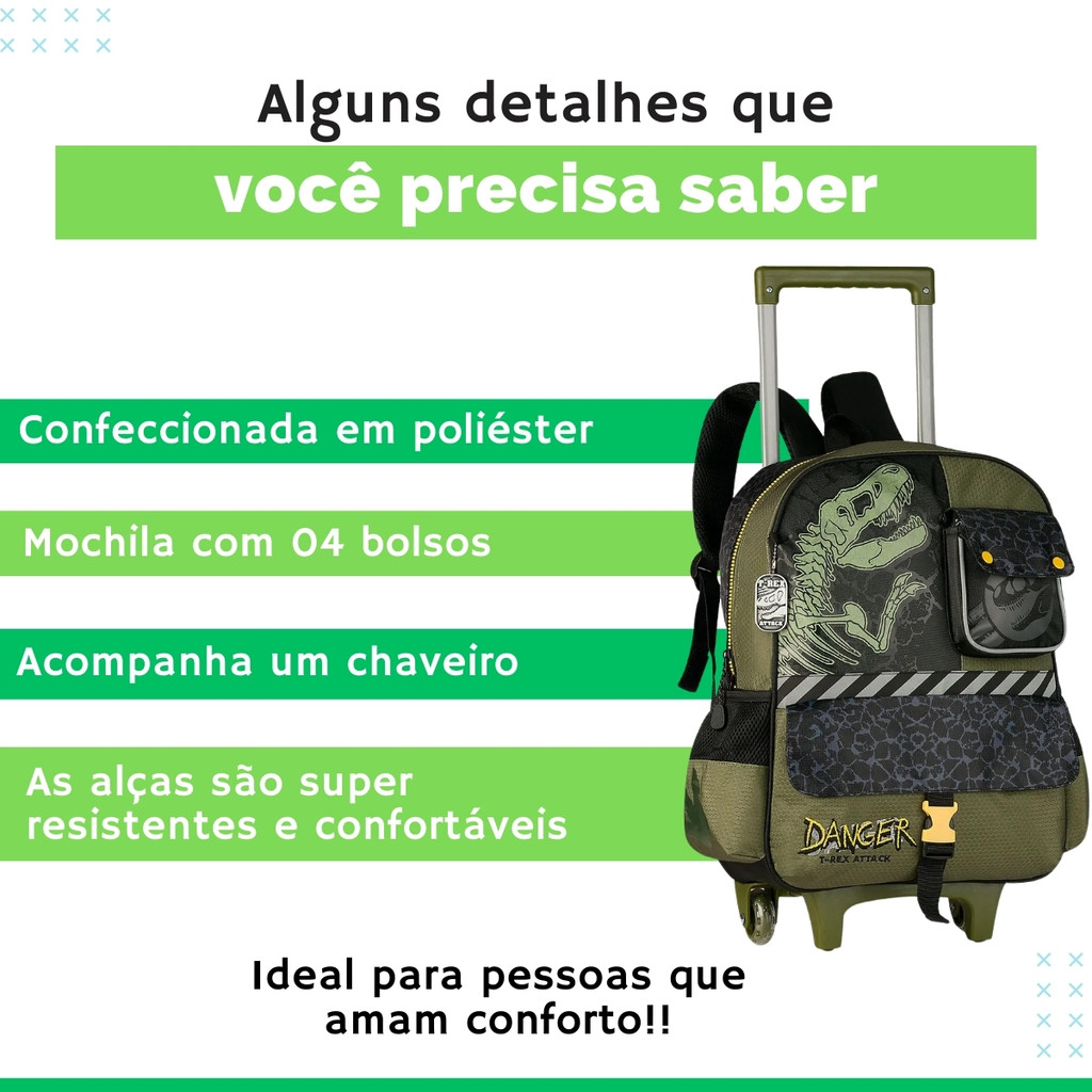 Mochila De Rodinhas Infantil Dinossauro T-Rex Ideal Para Escola E Passeios Com Chaveiro De Metal Volta ás Aulas - Clio