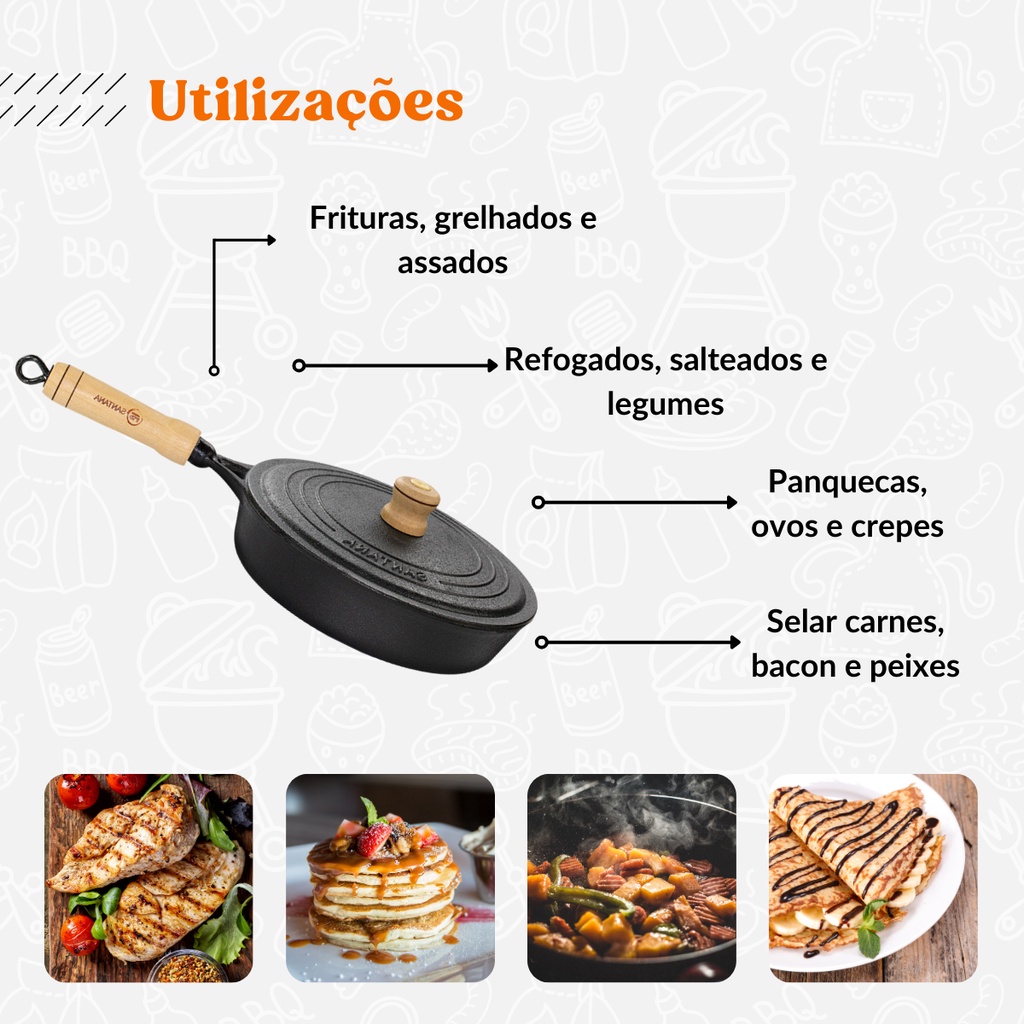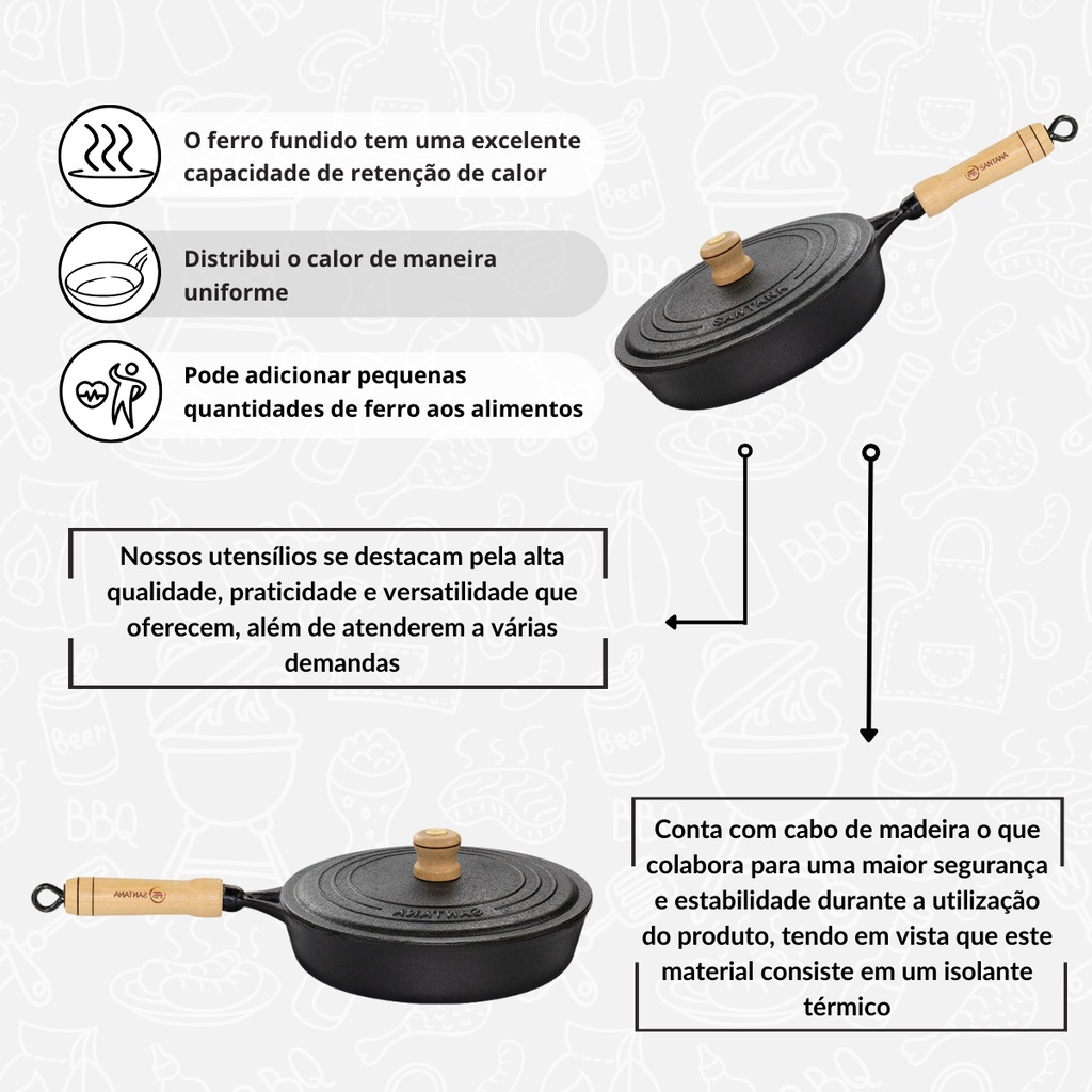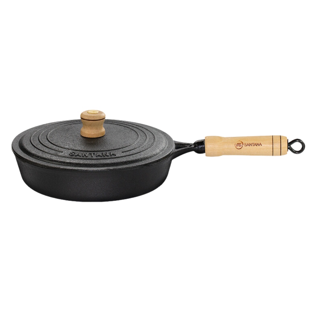 Frigideira De Ferro Fundido Com Tampa 22 cm Cabo Madeira