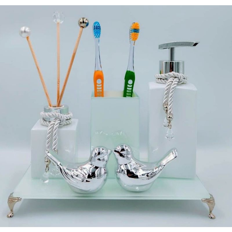 Kit Lavabo Branco/Prata Luxo, Difusor de Ambiente, Saboneteira, Bandeja Espelhada 22 x 12 cm, 2 Passarinhos, Porta Escova Vidro