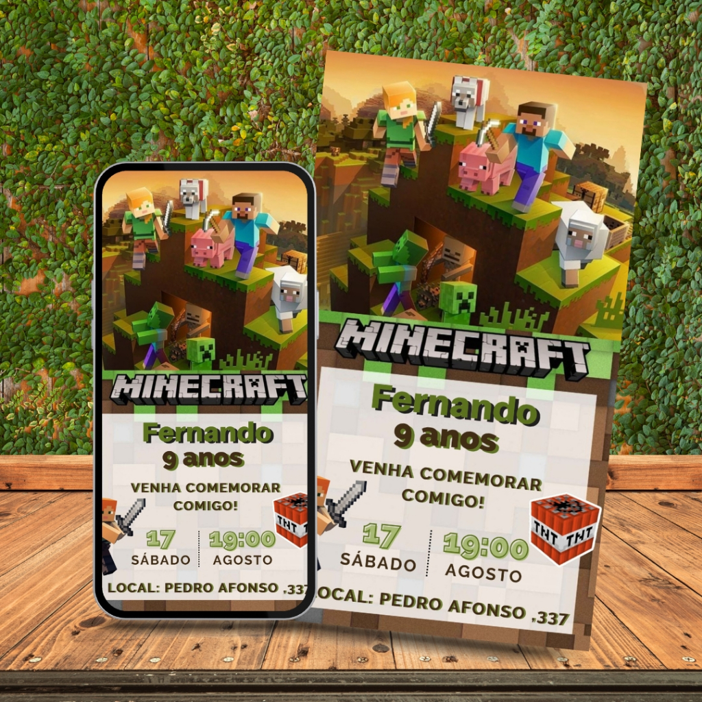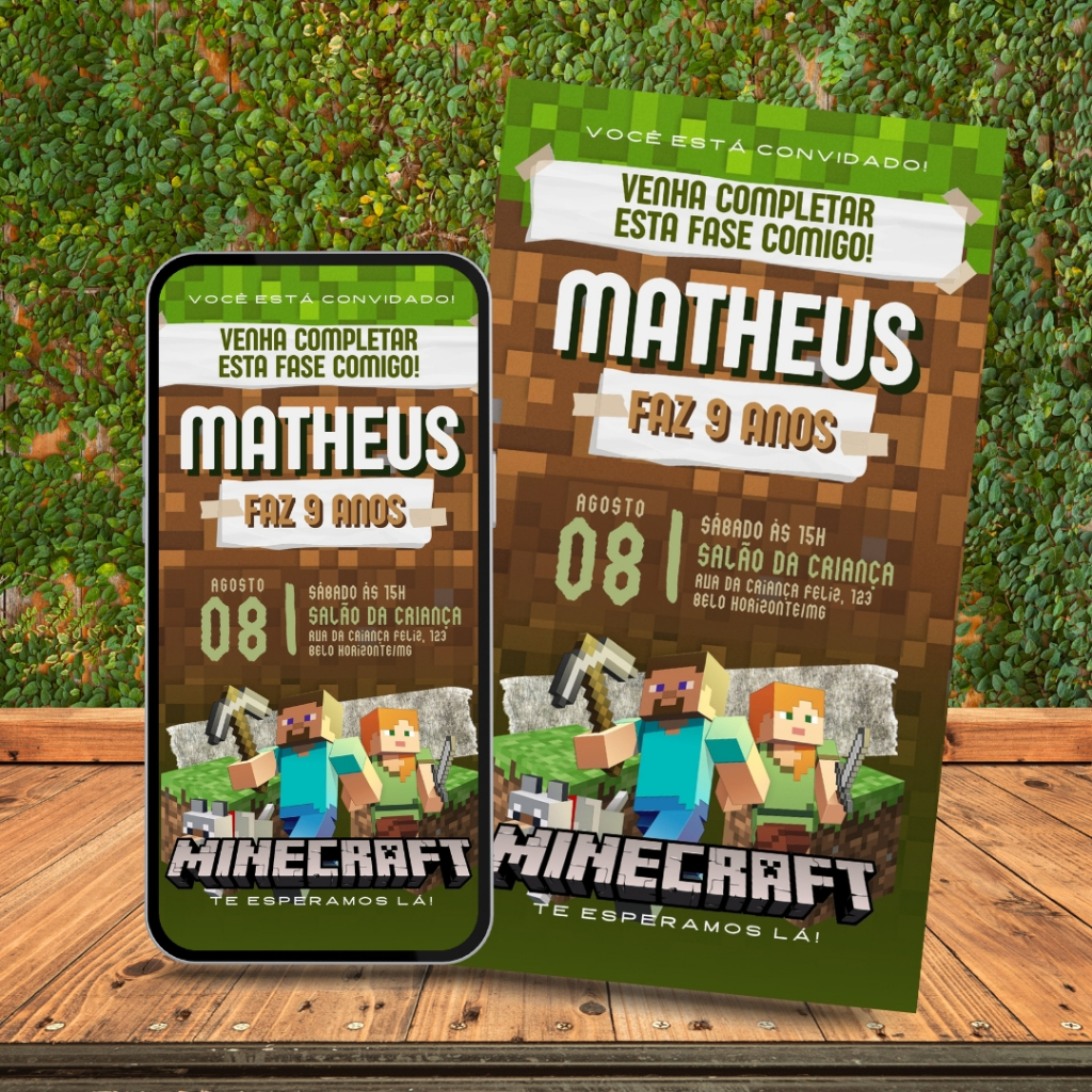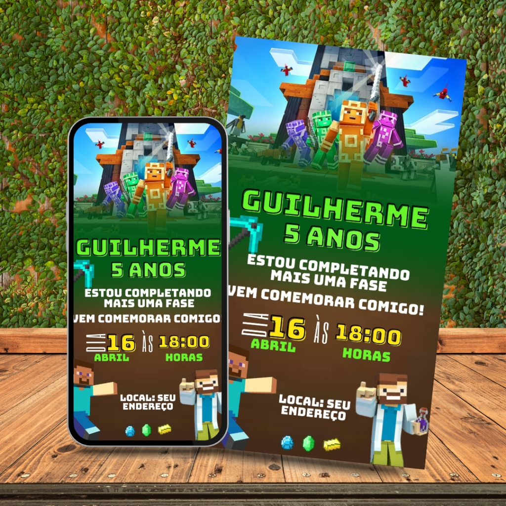 Convite De Aniversário Infantil Personalizado | Tema Minecraft + Outros Temas Disponíveis