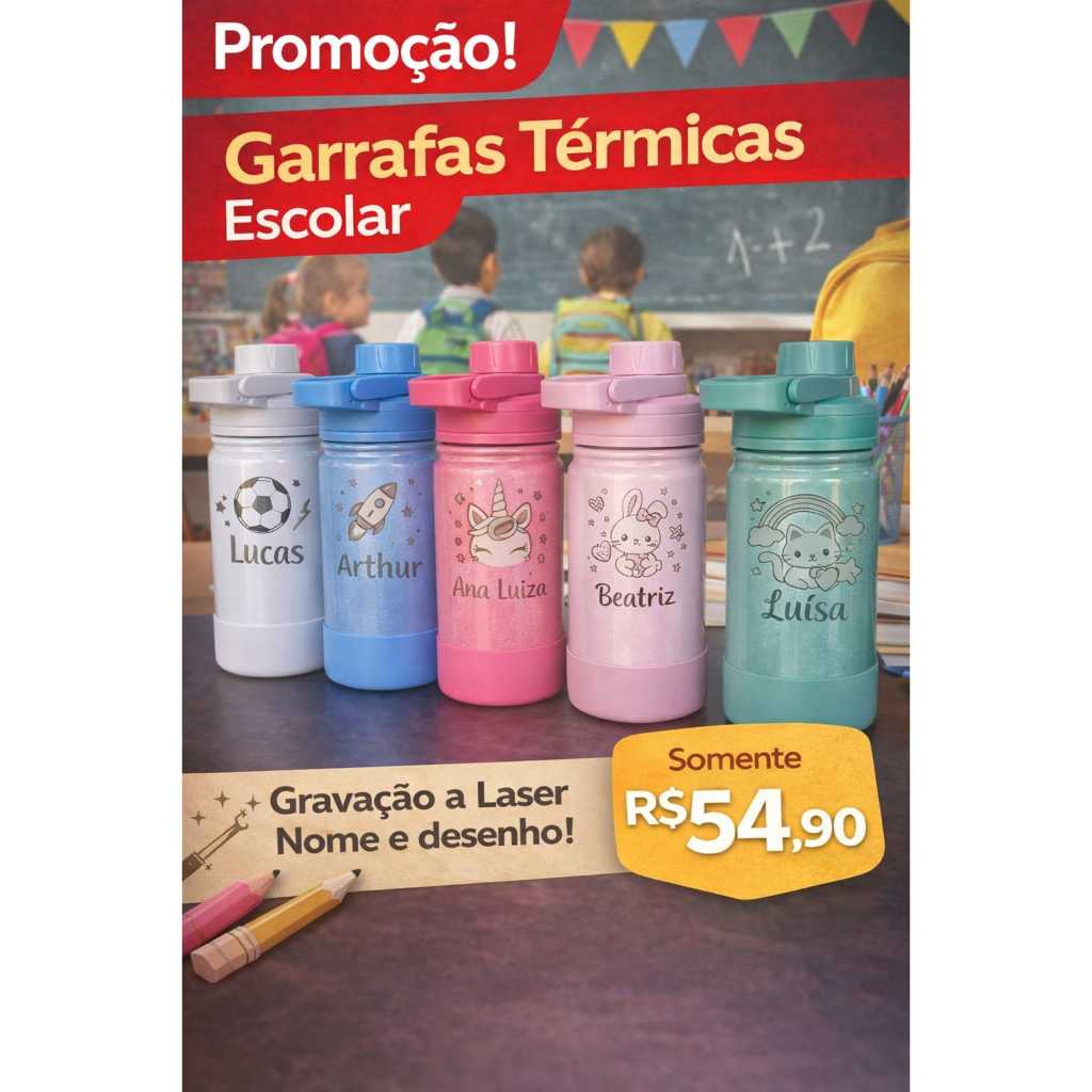 Garrafa Térmica 350ml + Protetor - Personalizada com nome, + desenho, time ou logo, enviamos no mesmo dia 😀