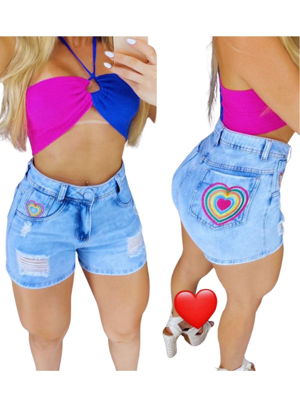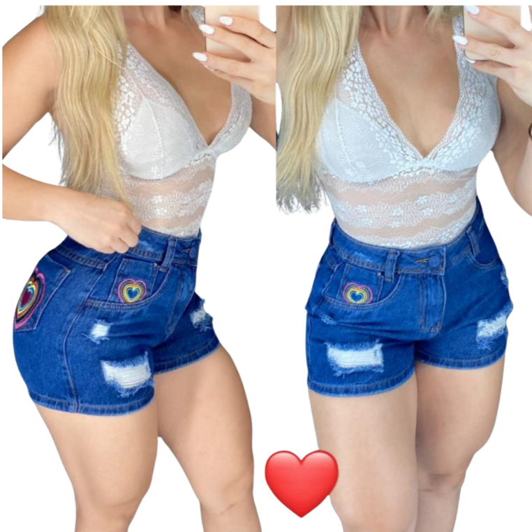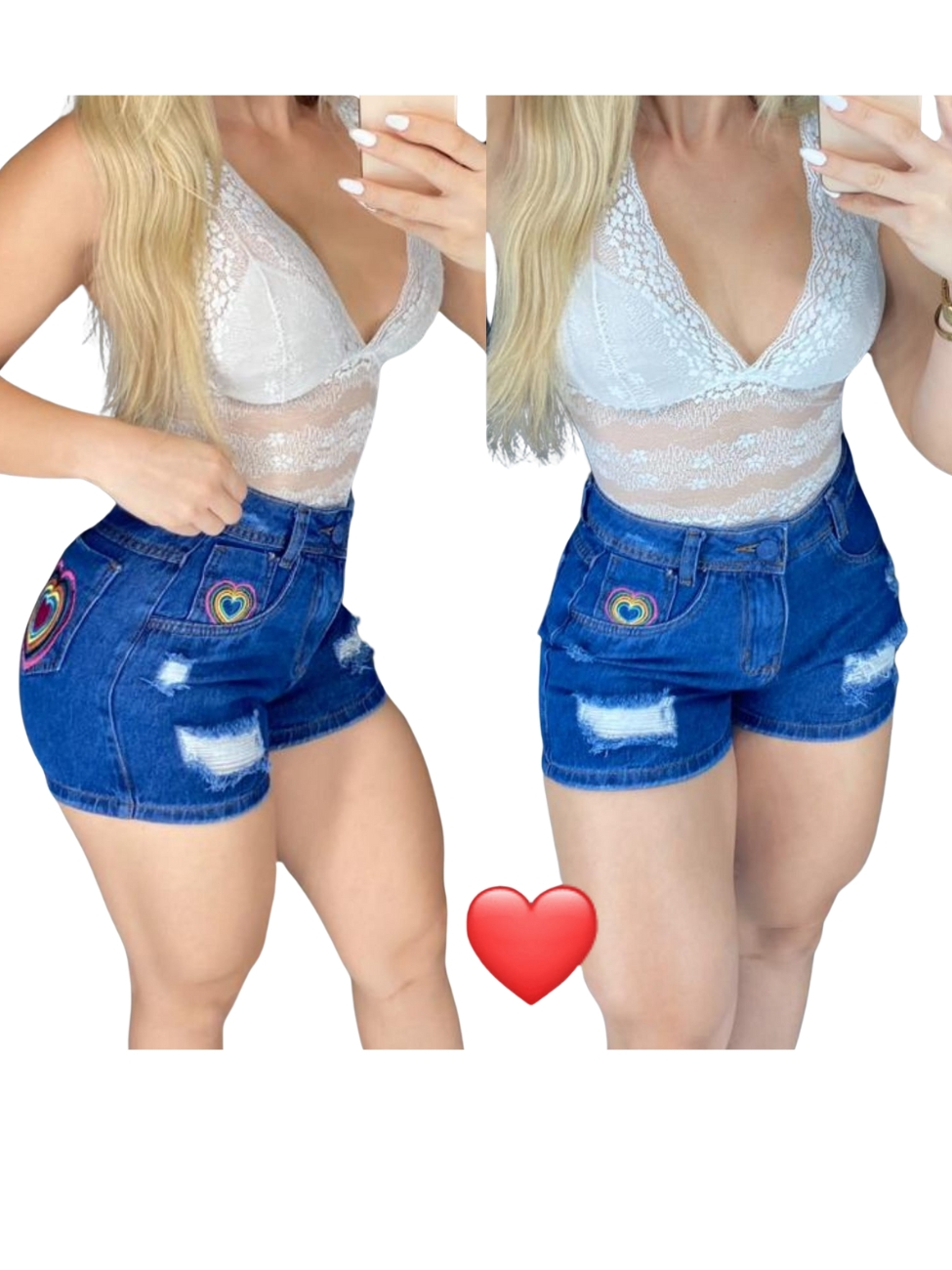 Short Jeans Feminino Meia Coxa Sem Lycra Bordado Coração