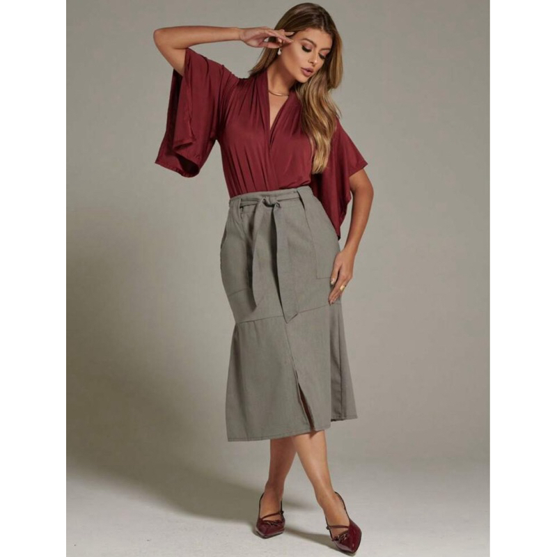 Saia Feminina Midi Linho Moda Evangélica Com Cinto no Material do Tecido Cintura Alta