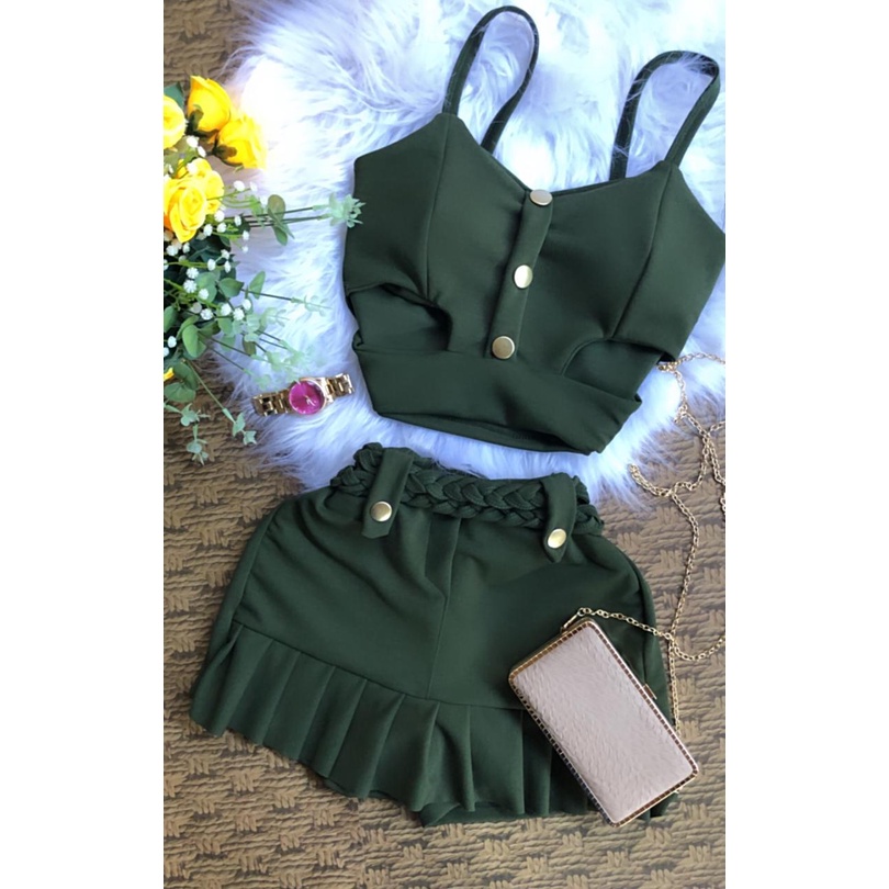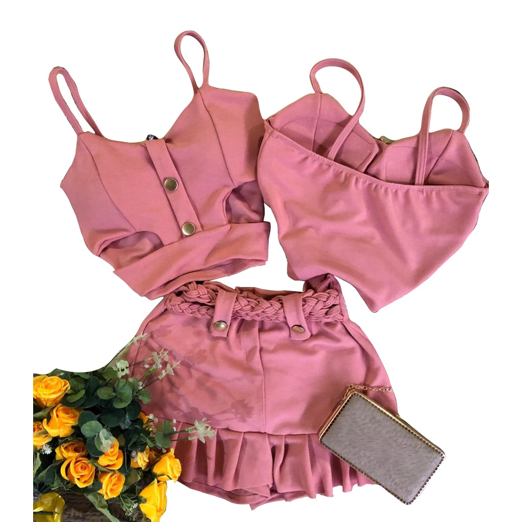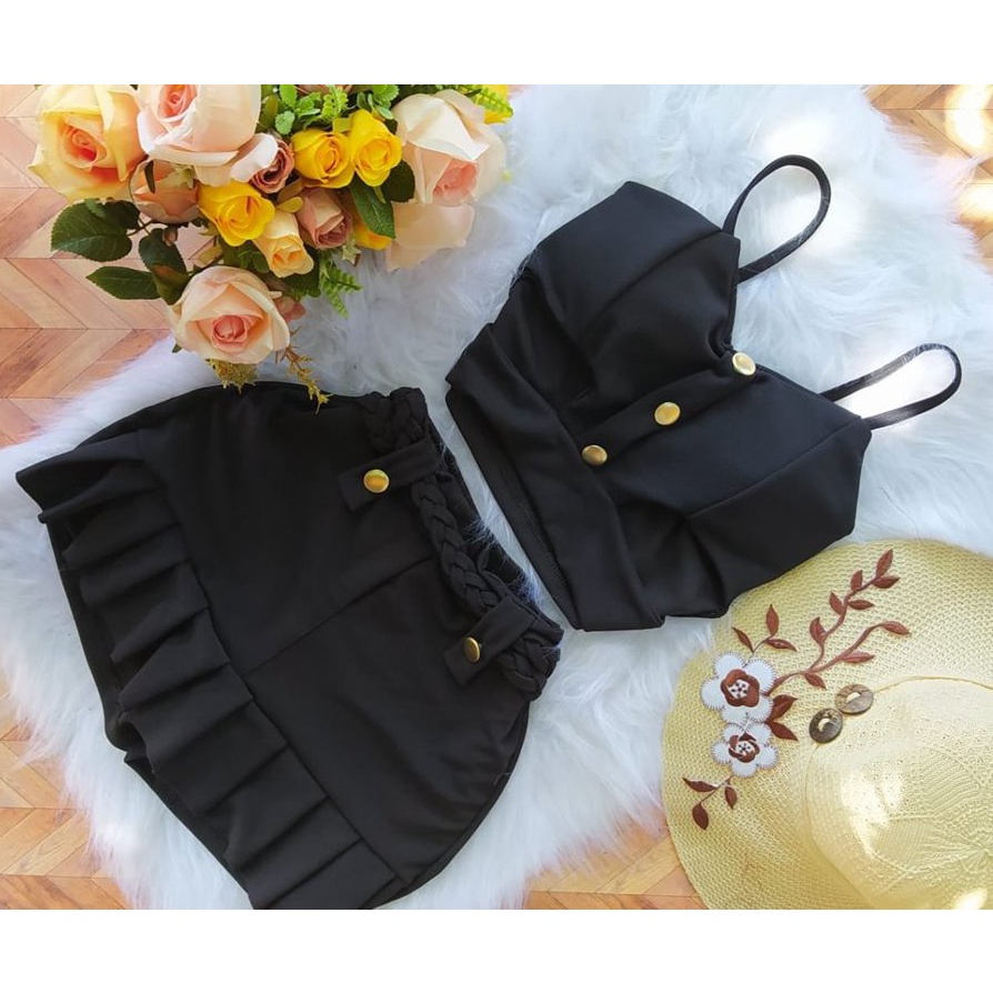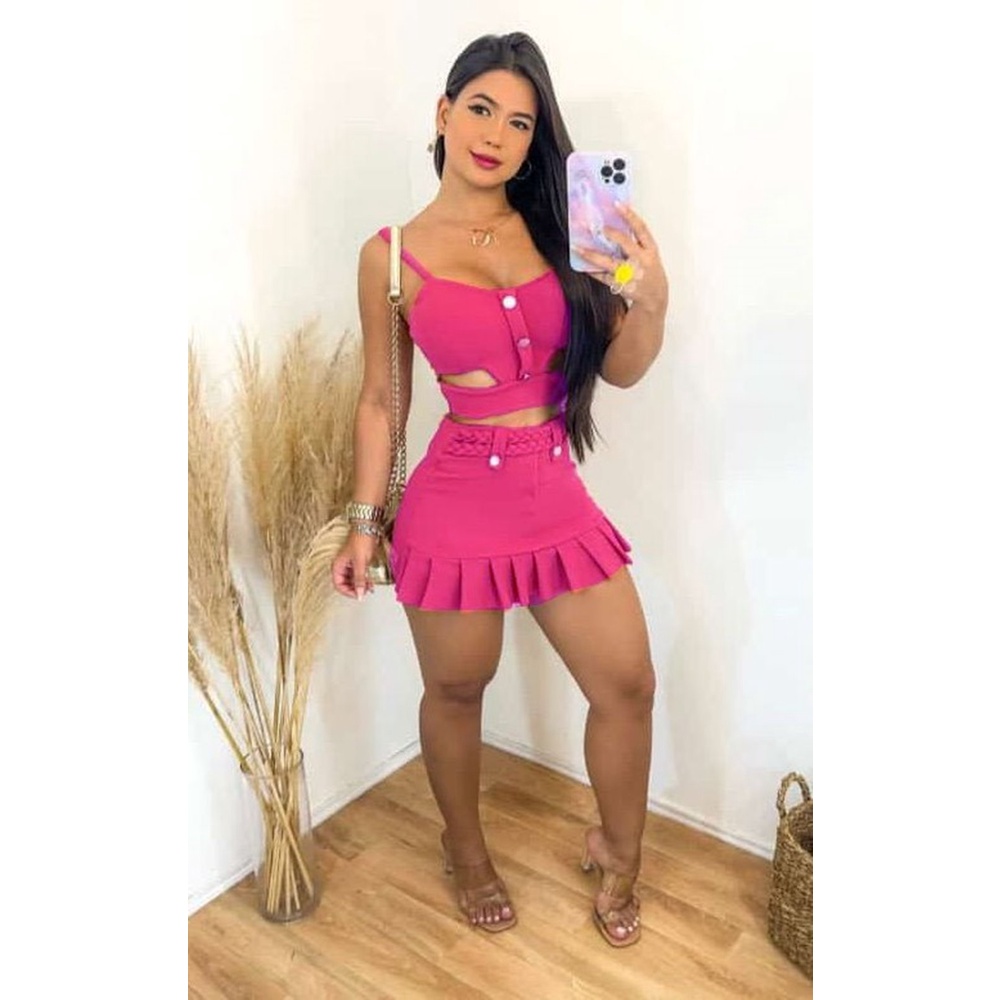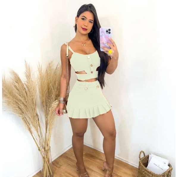 Conjunto Cheio de estilo Short Saia Cós Alto Top Com Bojo C02