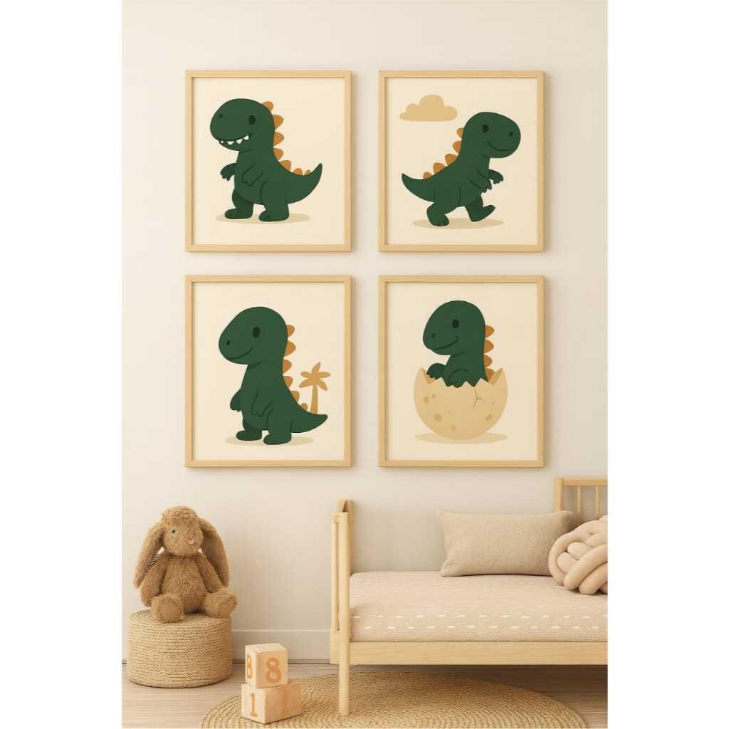 QUADRO DECORATIVO 4 PEÇAS DINOSSAURO VERDE NUVEM