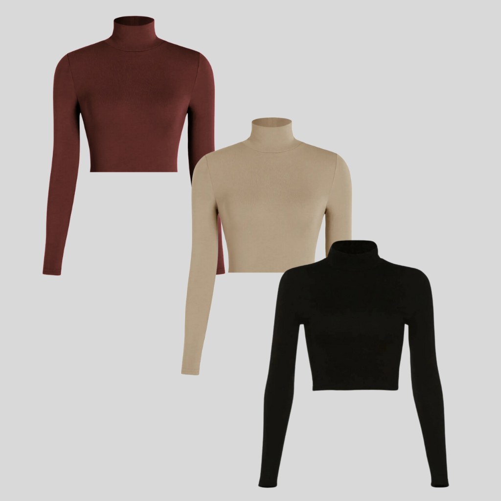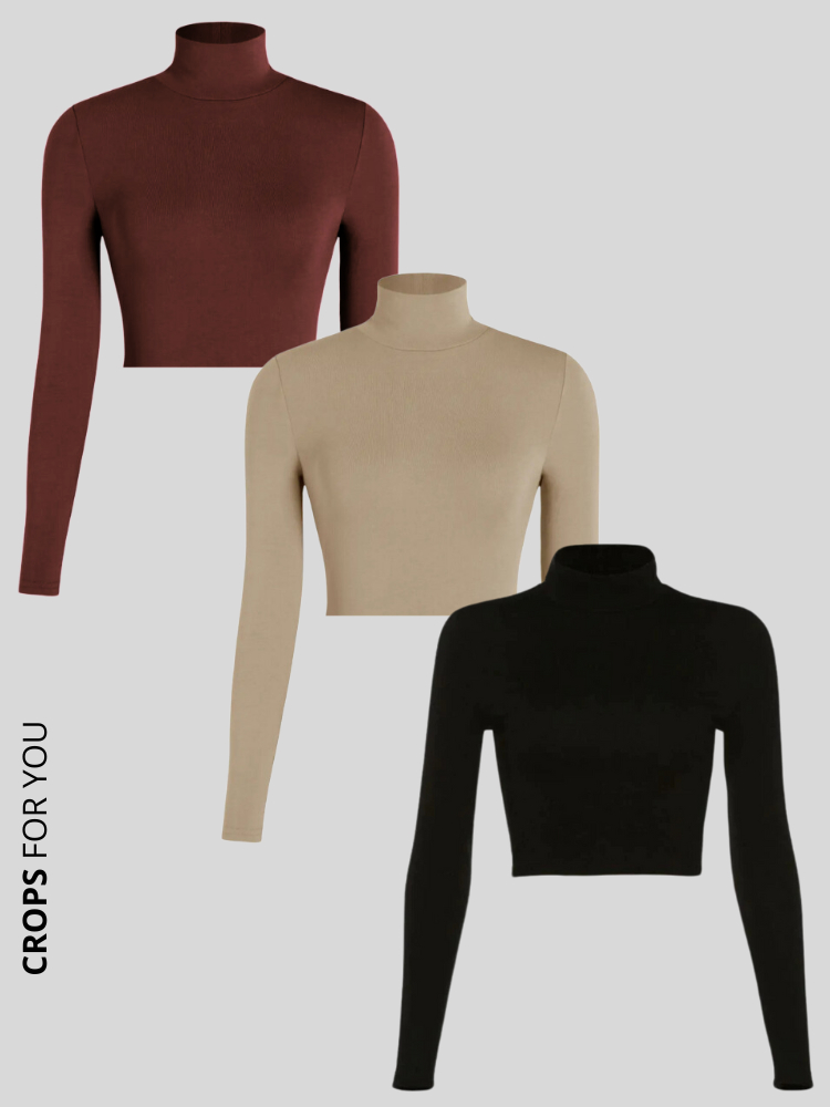 Kit 3 Croppeds Canelados Gola Alta Manga Longa Feminina Moda Gringa Elegante Mulher