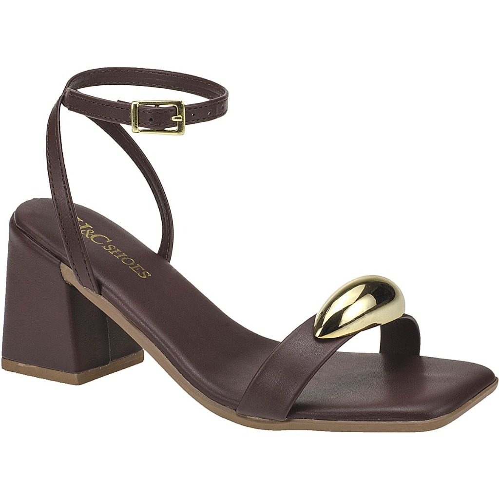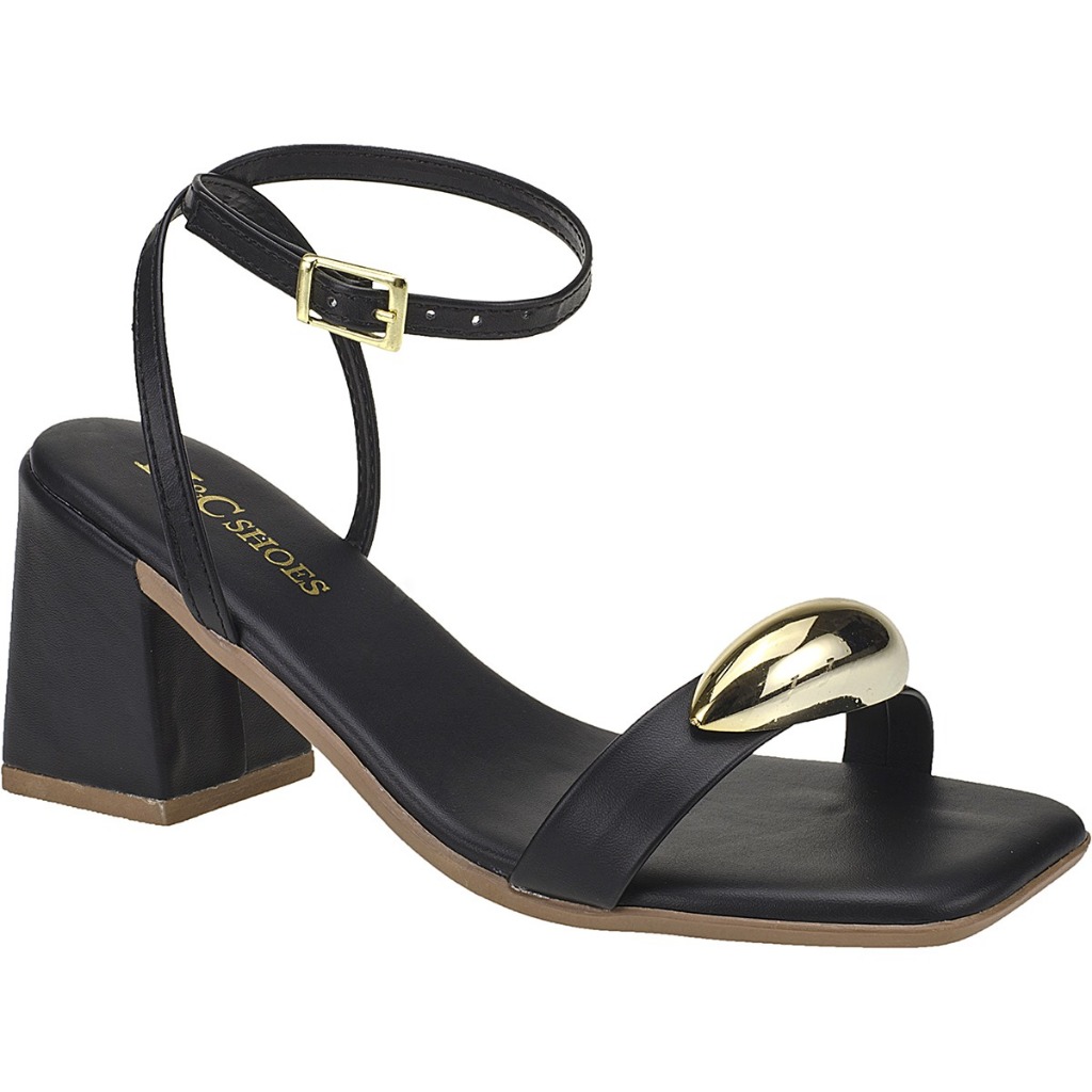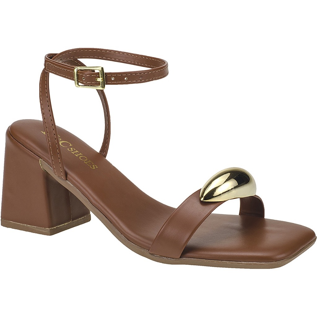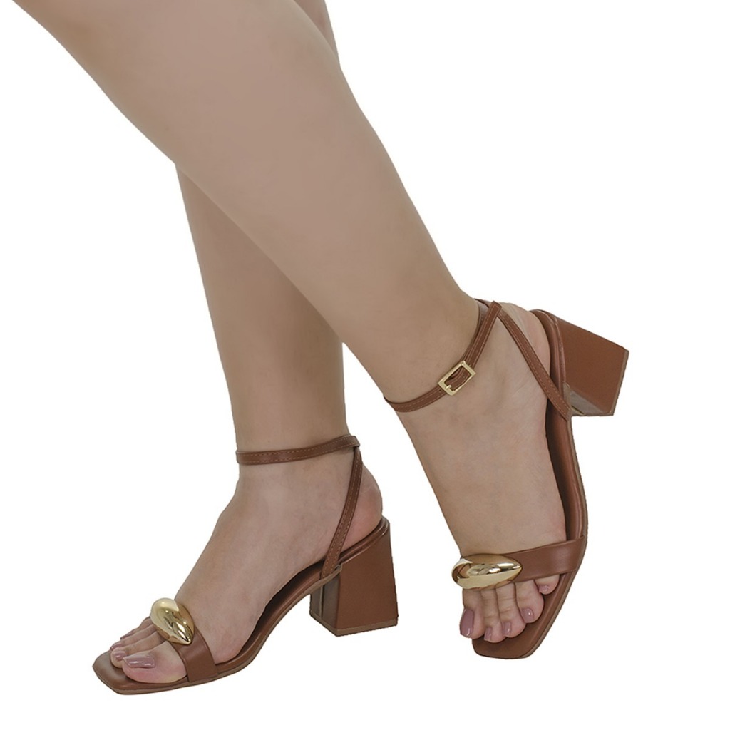 Sandália Feminina Enfeite Dourado Metalizado Salto Médio Bloco Blogueira Influencer Confortavel Luxo Moderna Envio já