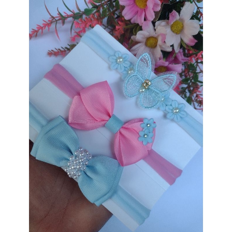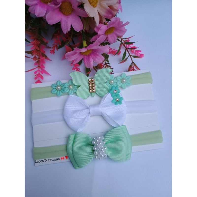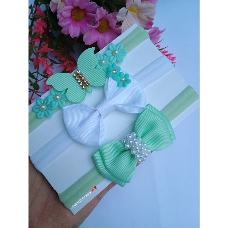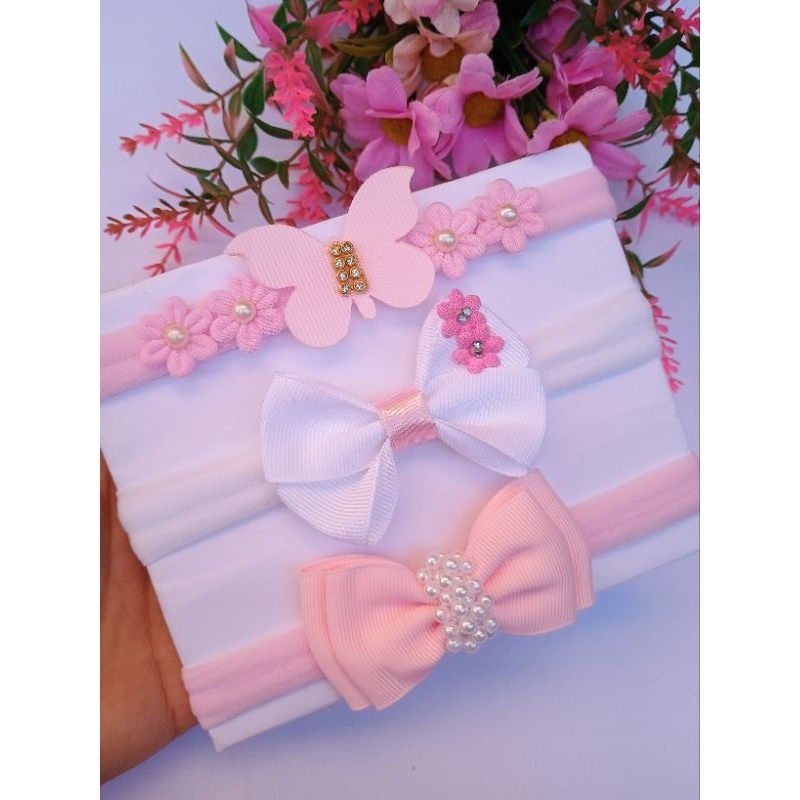 Kit 3 Laços infantil na Faixinha Tiara meia de Seda para bebê menina/Flores é Borboleta é Pérolas