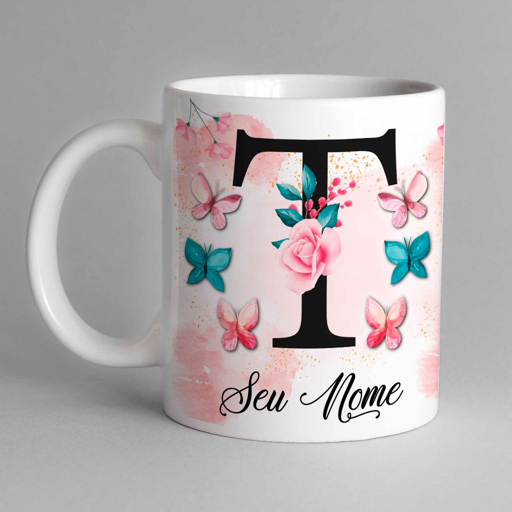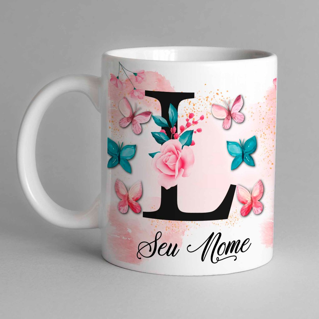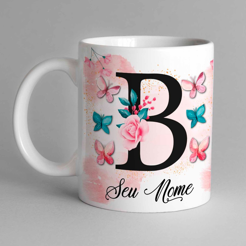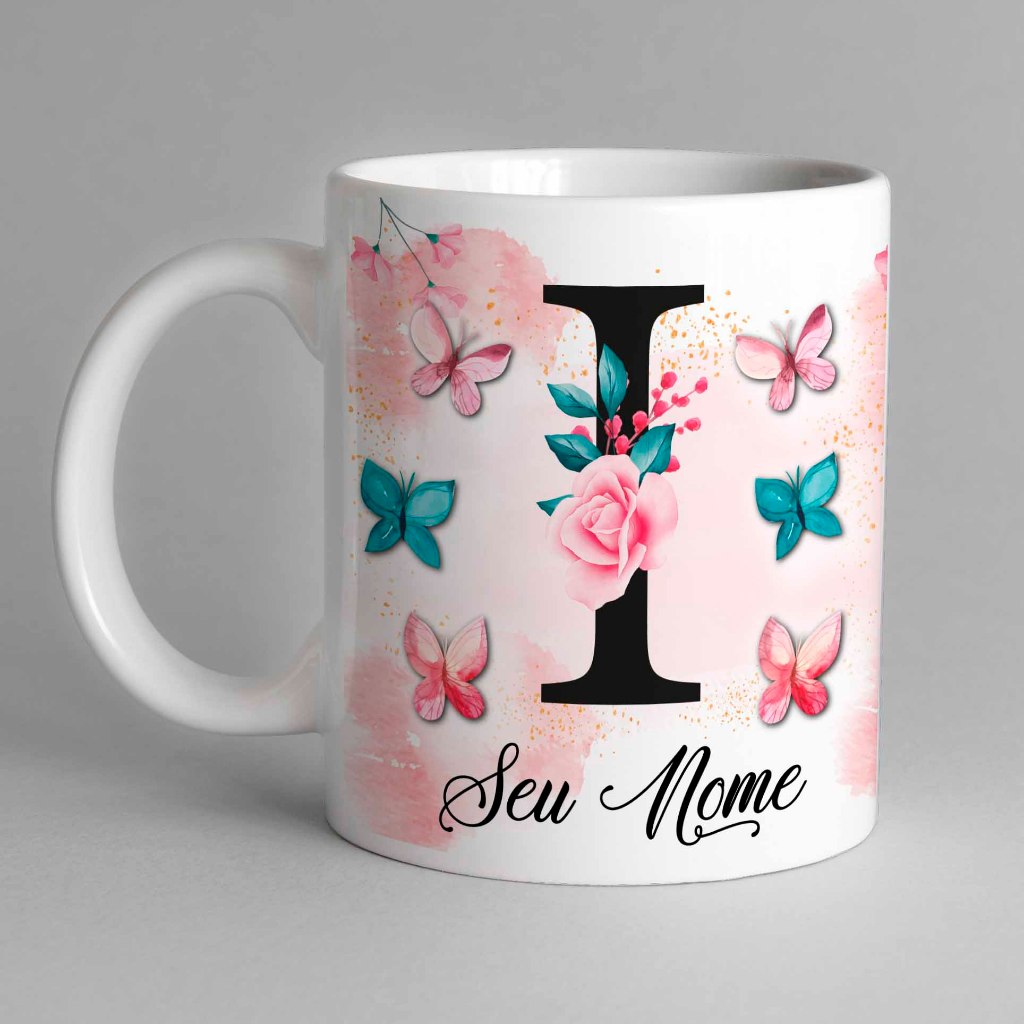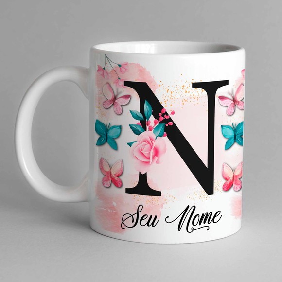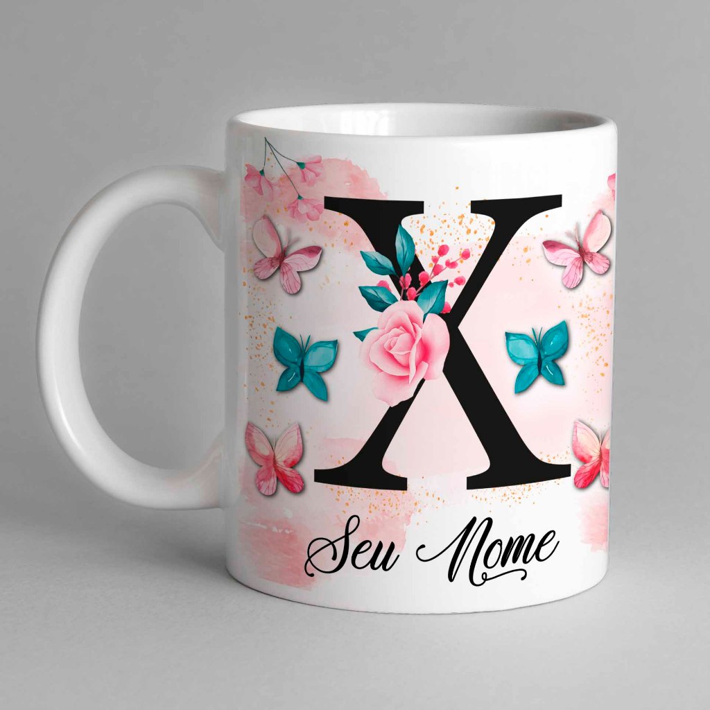 Caneca Com Inicial e Nome Borboleta Porcelana Personalizada - Presente Criativo 325ml Temos Todas as Letras Iniciais
