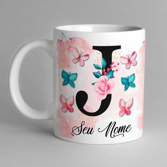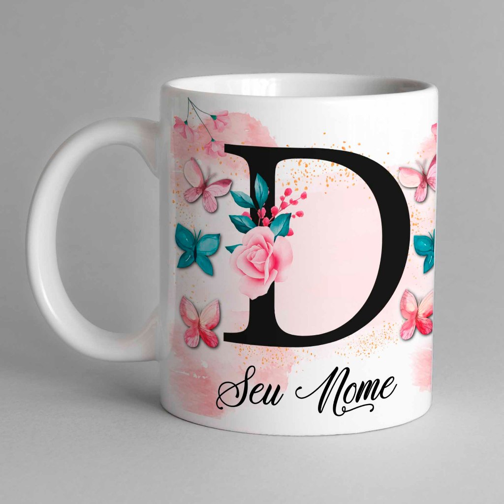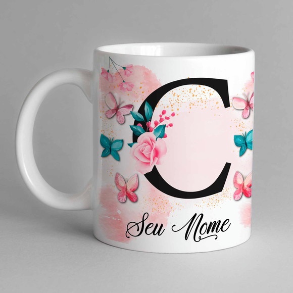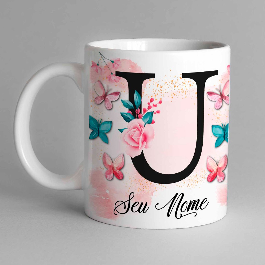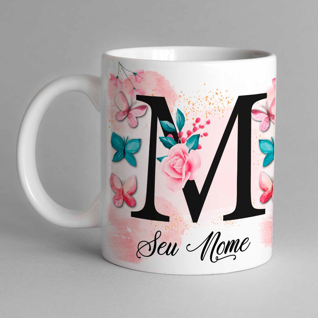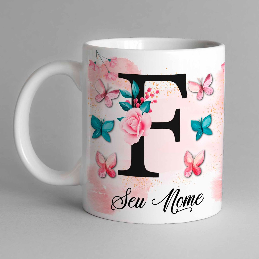 Caneca Com Inicial e Nome Borboleta Porcelana Personalizada - Presente Criativo 325ml Temos Todas as Letras Iniciais