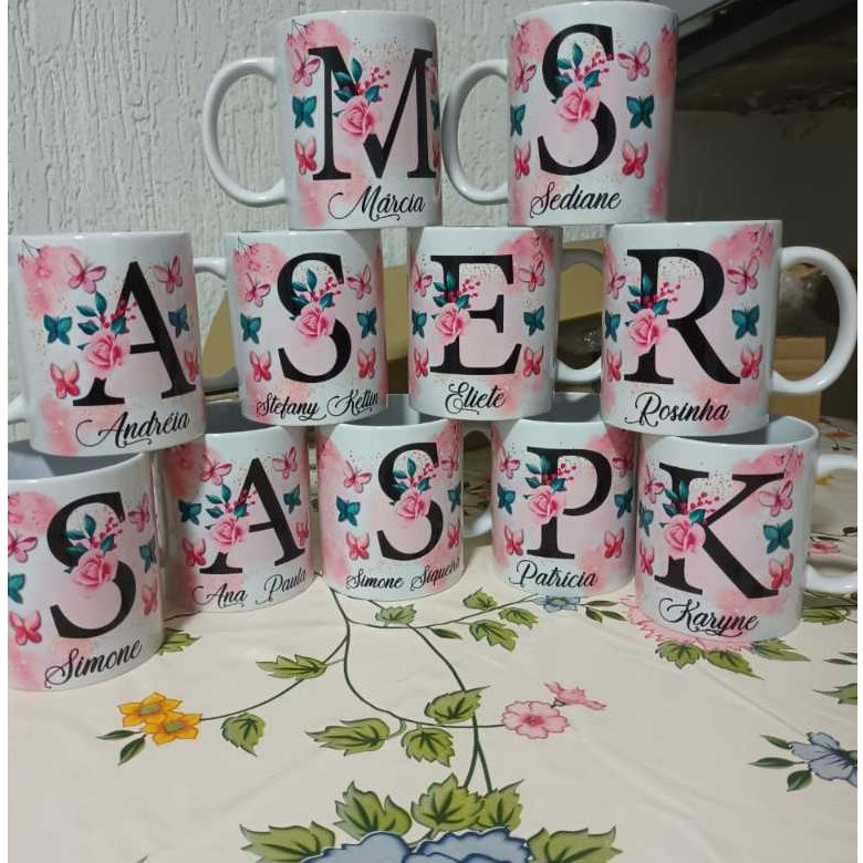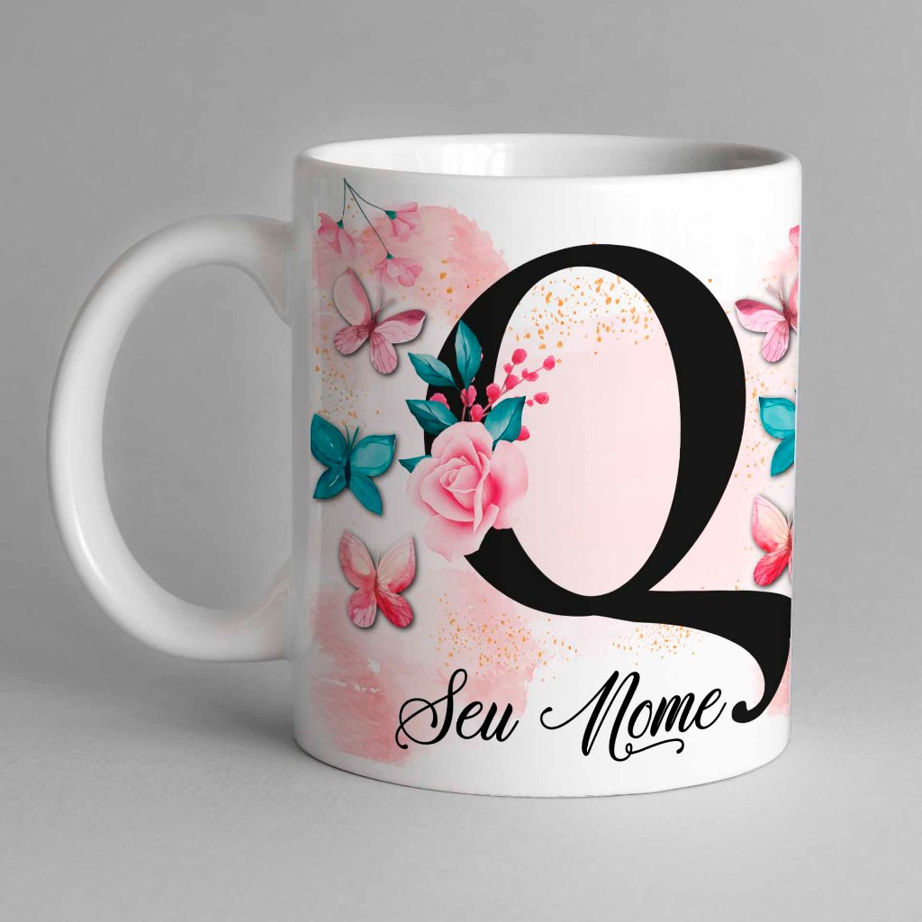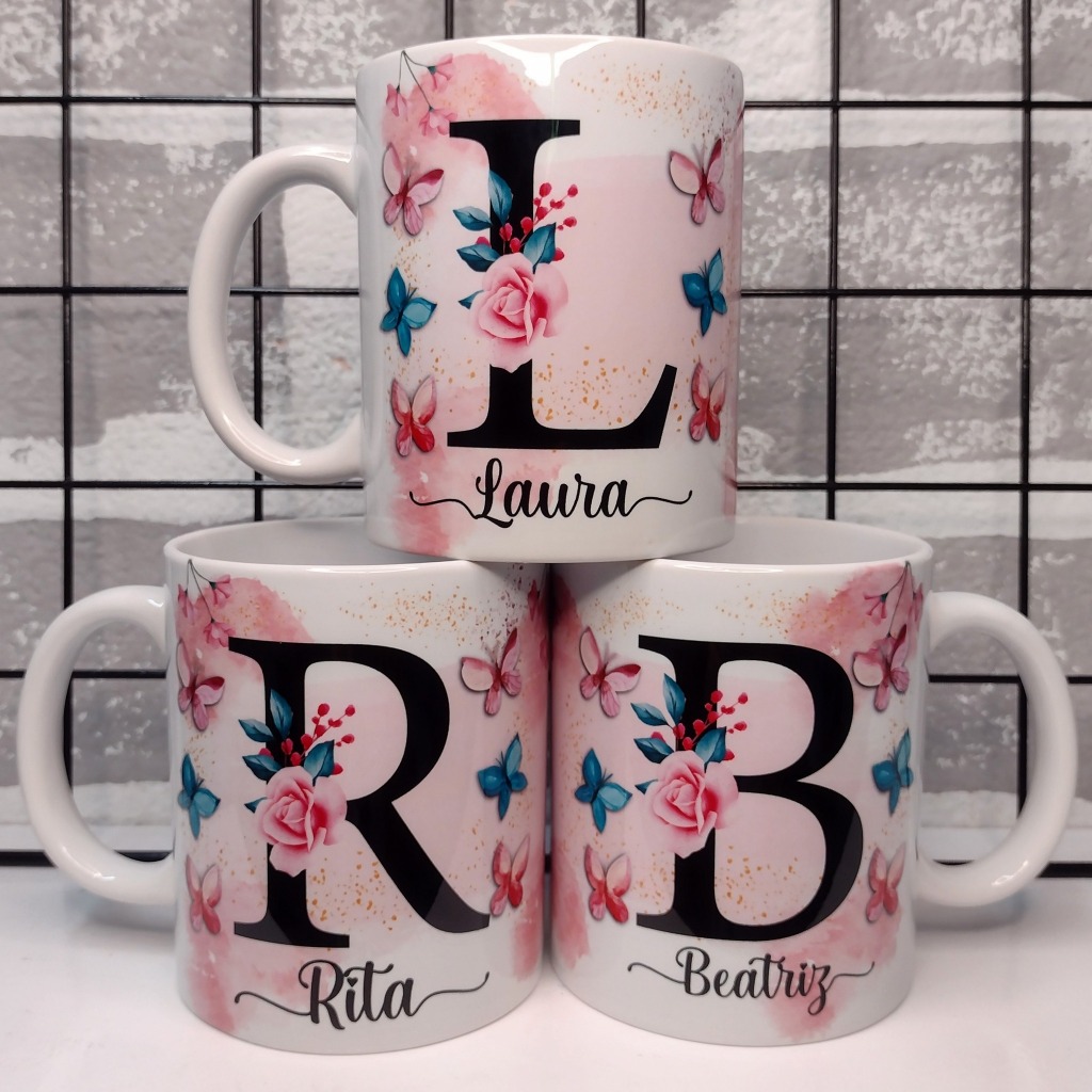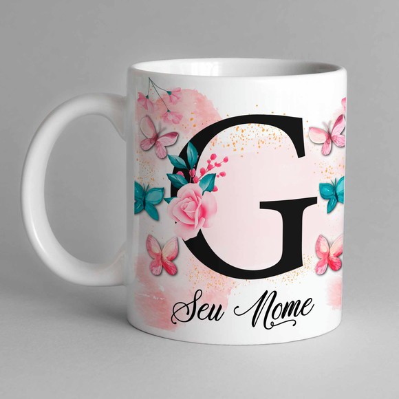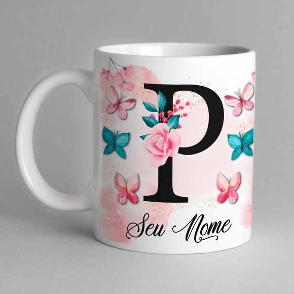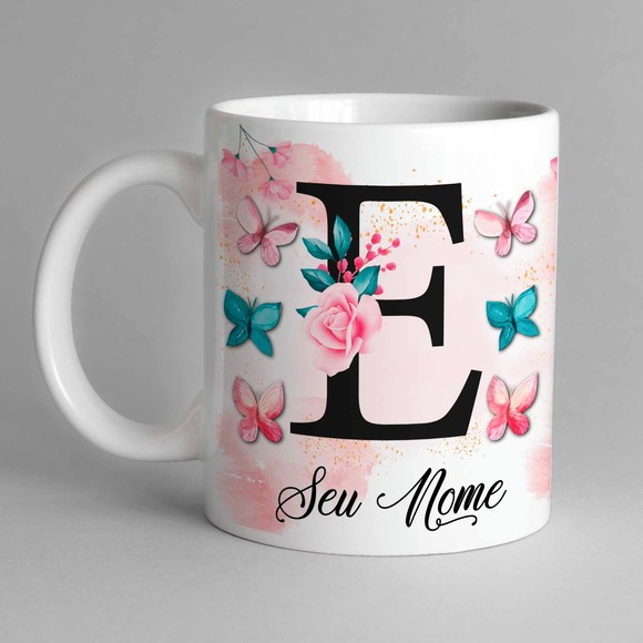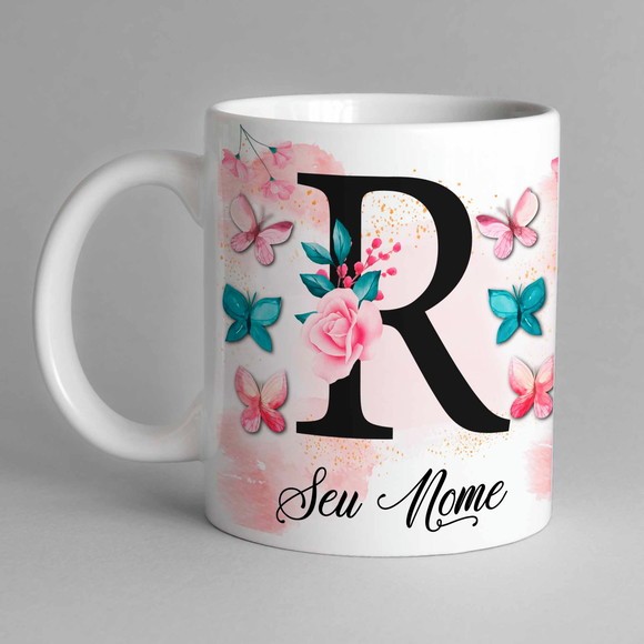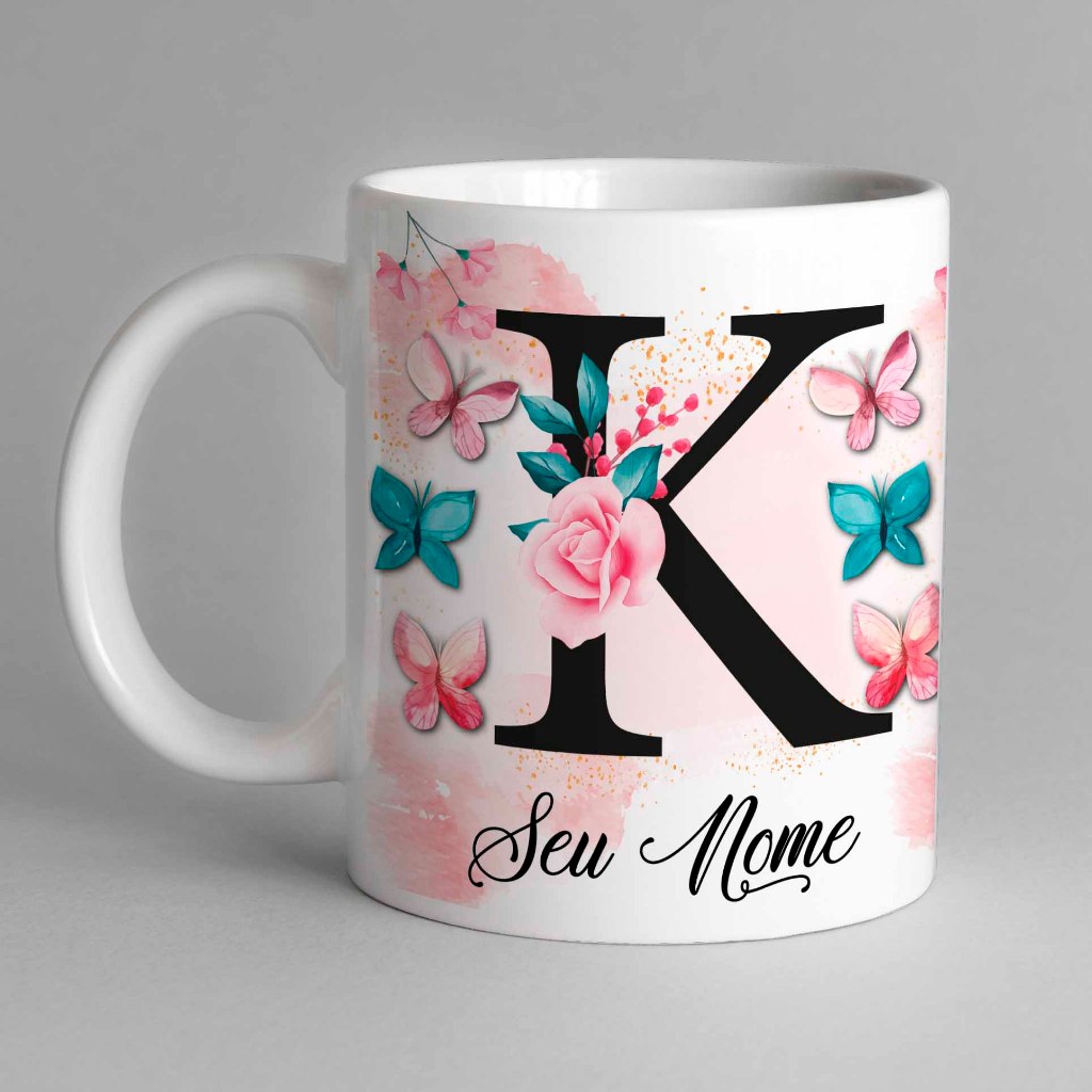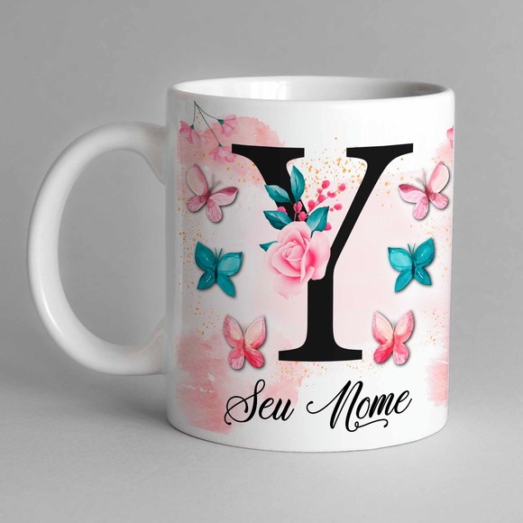 Caneca Com Inicial e Nome Borboleta Porcelana Personalizada - Presente Criativo 325ml Temos Todas as Letras Iniciais