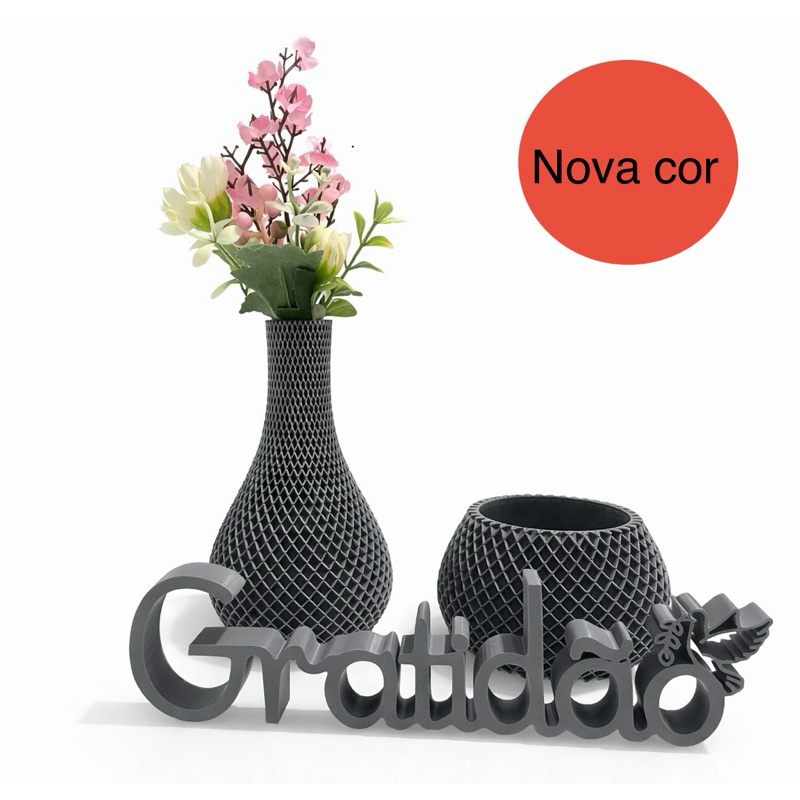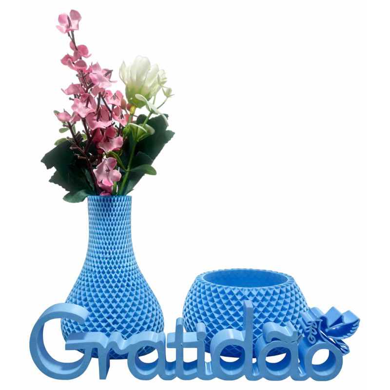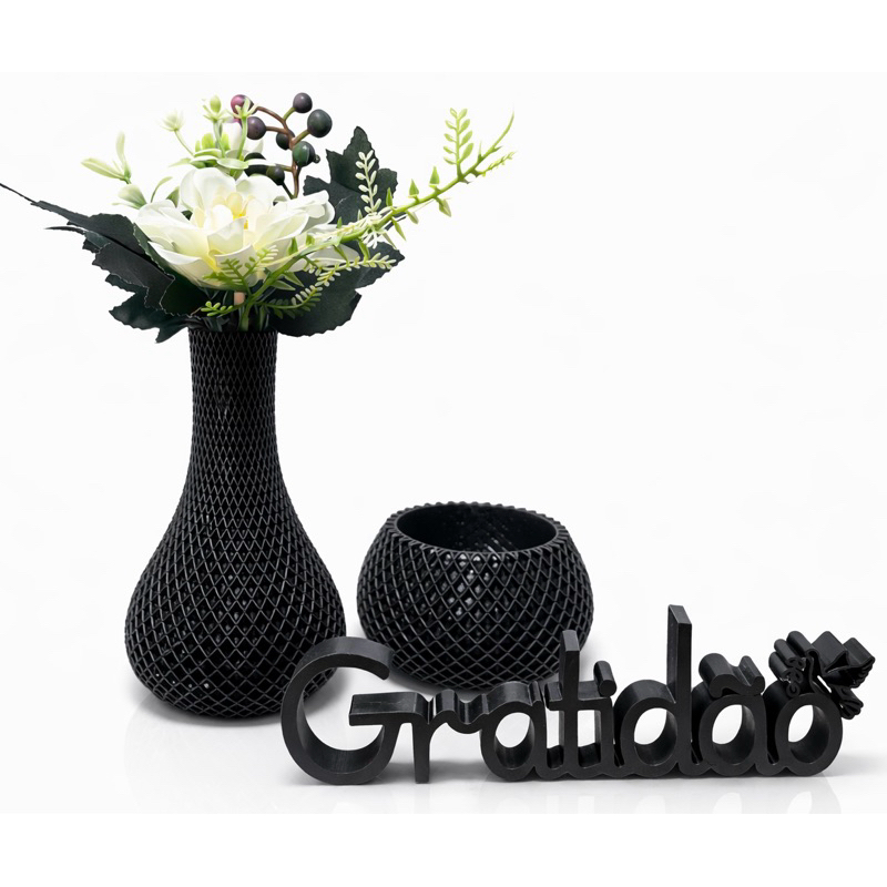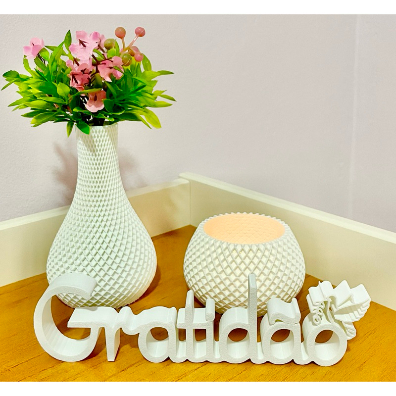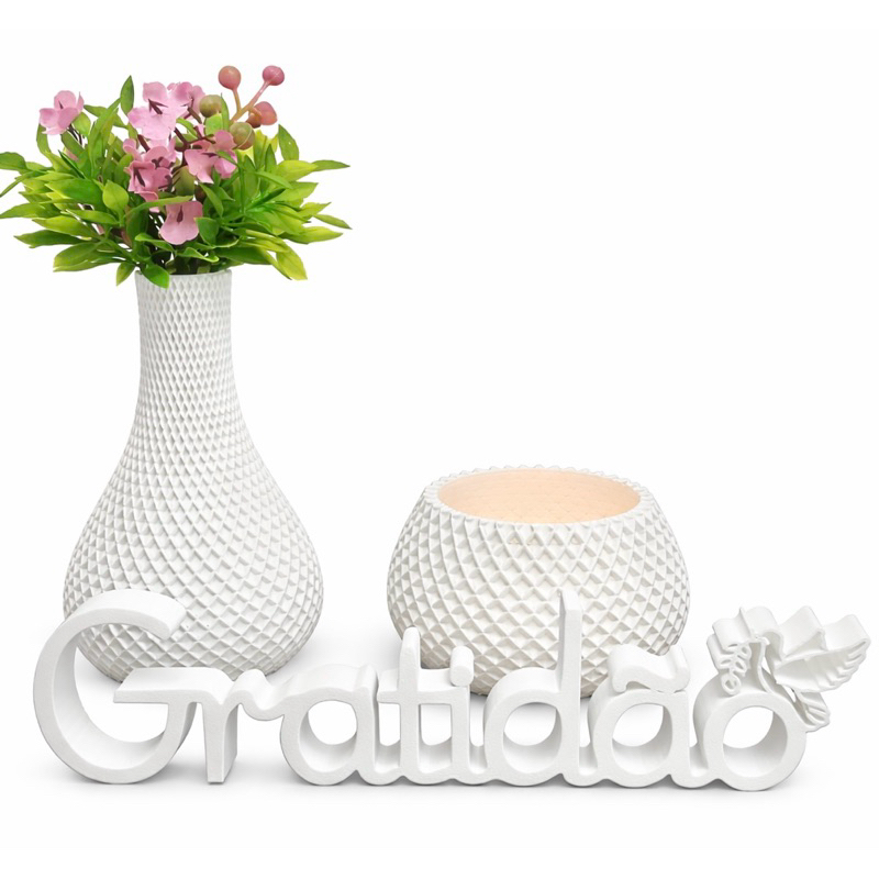 Kit Gratidão decoração minimalista – vaso + porta-velas + letreiro.