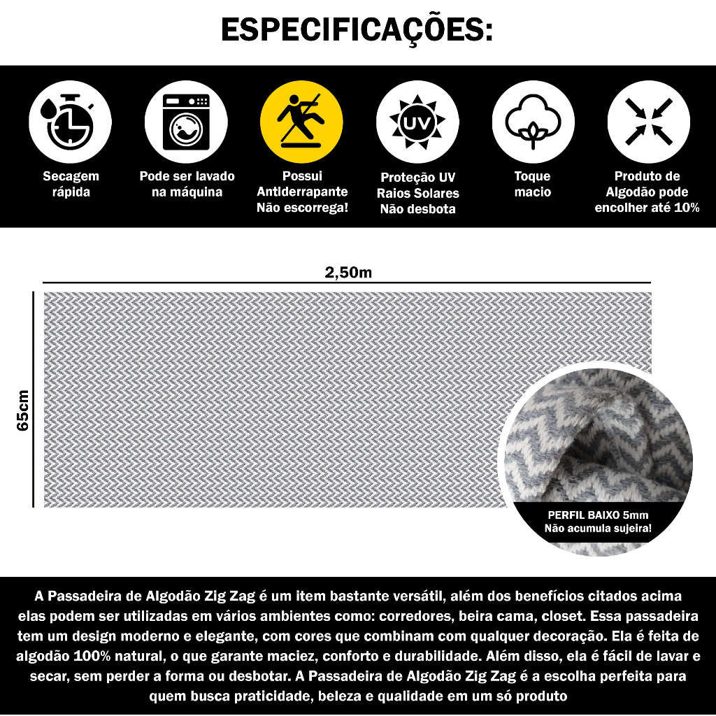 Tapete Passadeira 2,50m x 0,65m Antiderrapante Zig Zag Cozinha Hall Sala Quarto Corredor