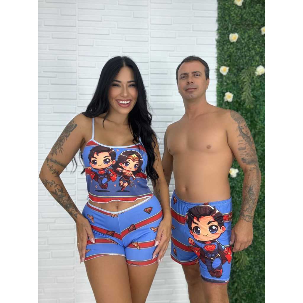 Kit Pijama Casal ShortDoll Cropped Feminino + Samba Canção Masculino Personagem Moda Para Dormir
