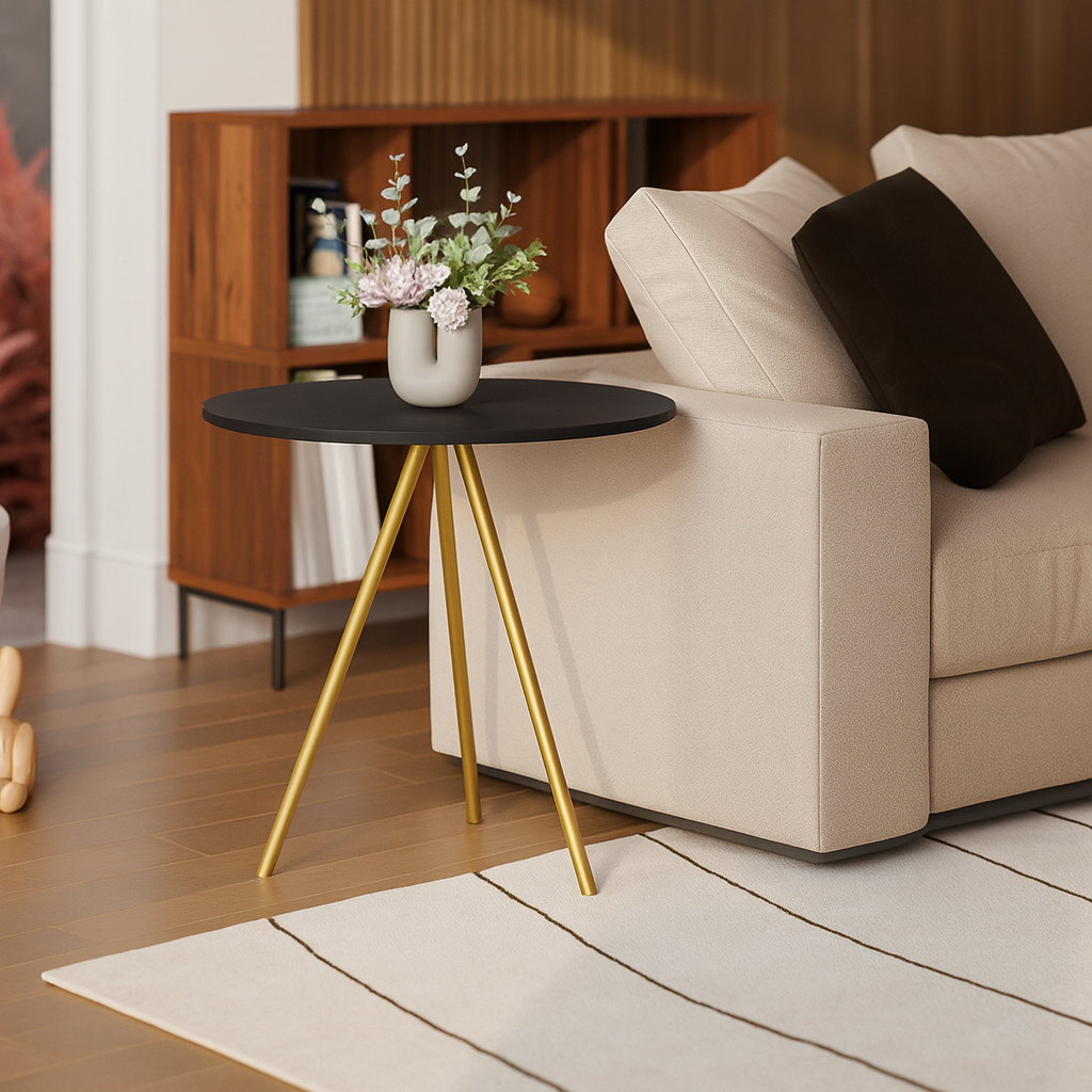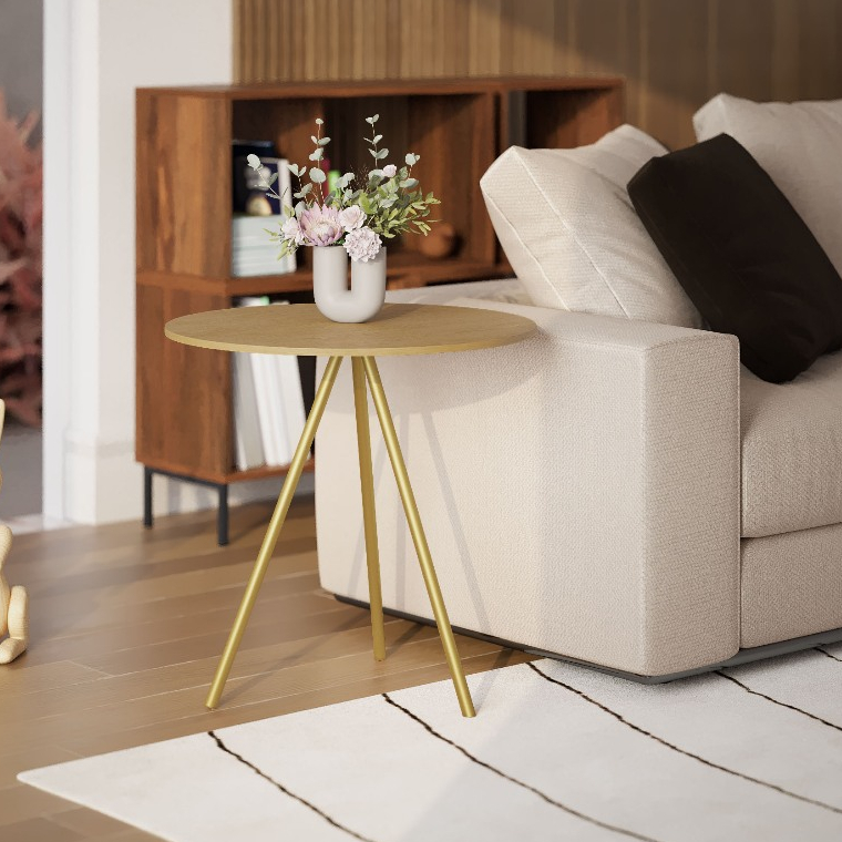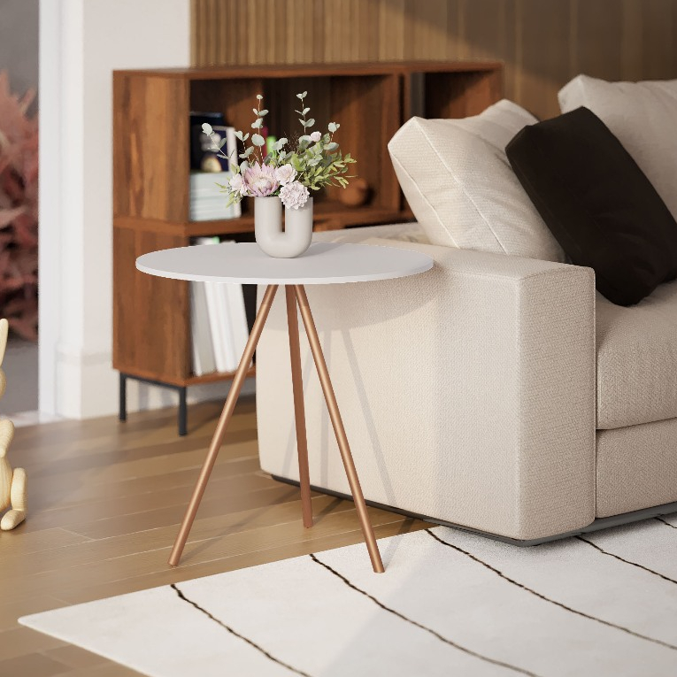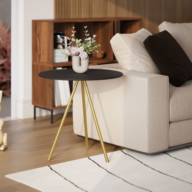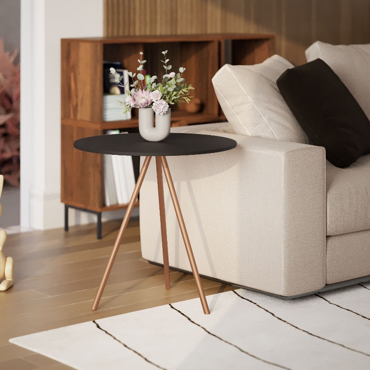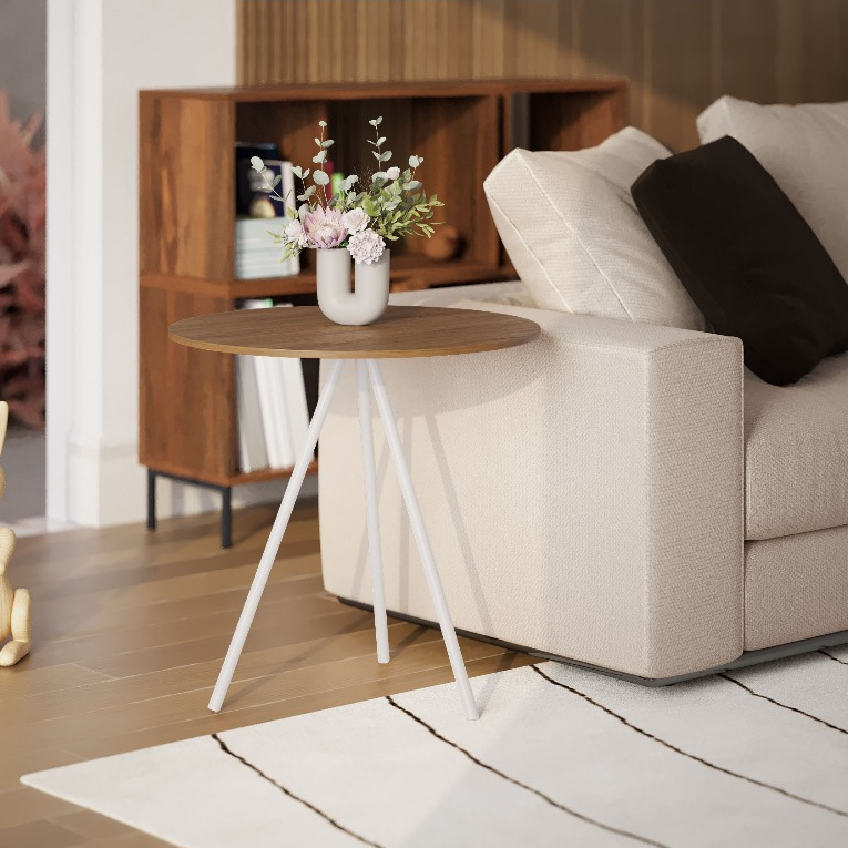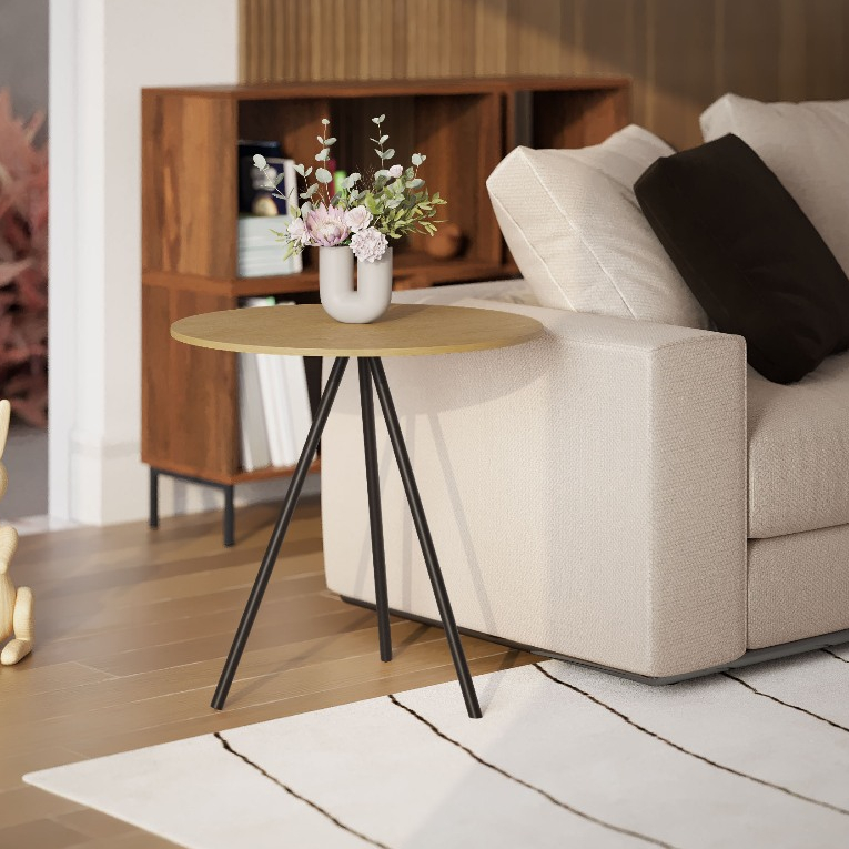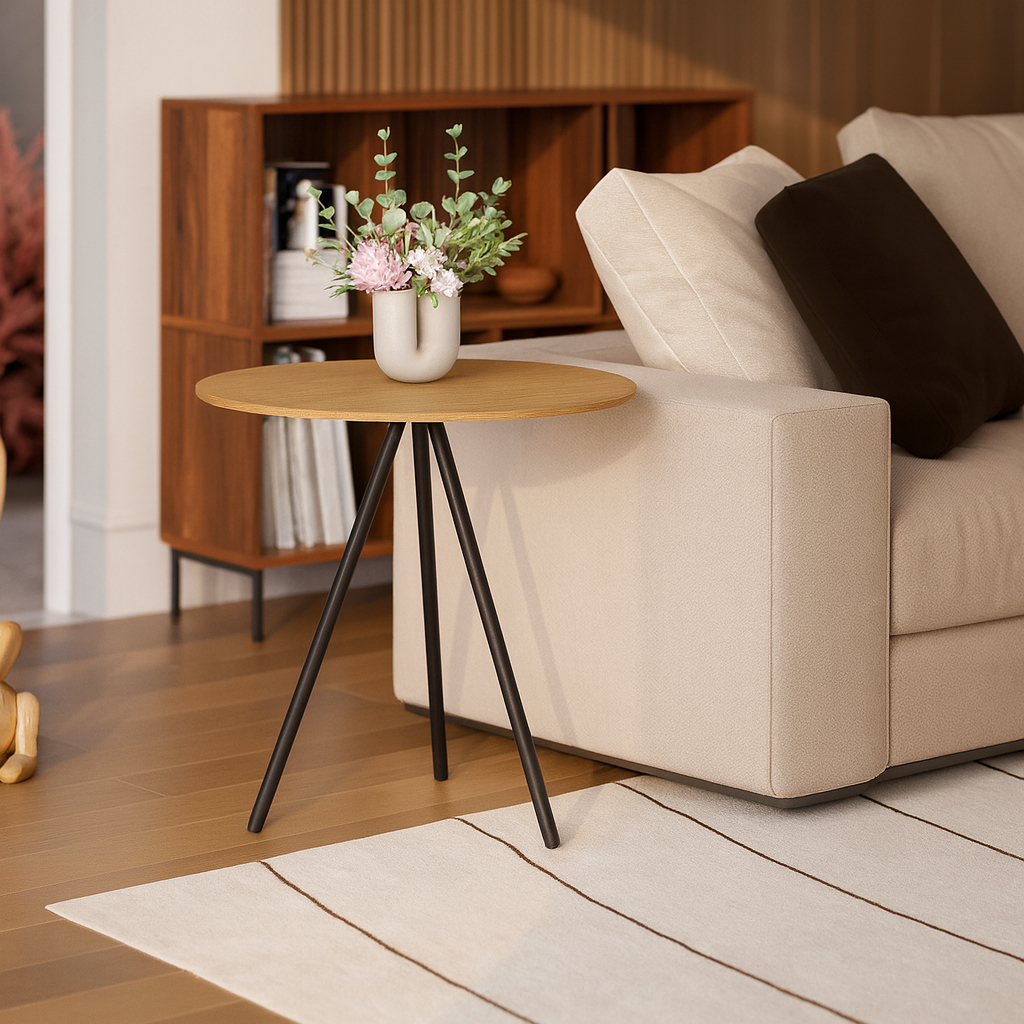 Mesinha Lateral de Canto para Sala Gabriela Base Ferro Tampo Redondo de Madeira Decoração Apoio Sofá