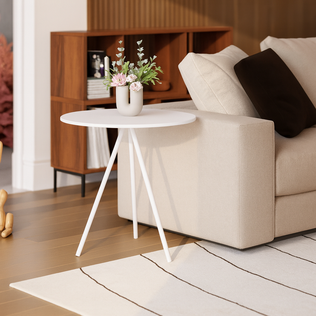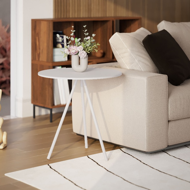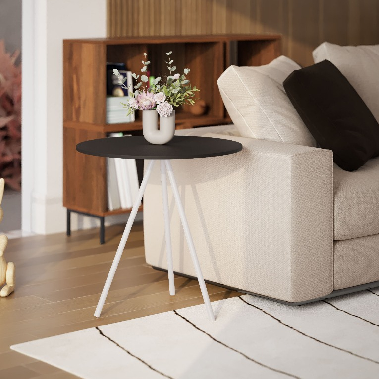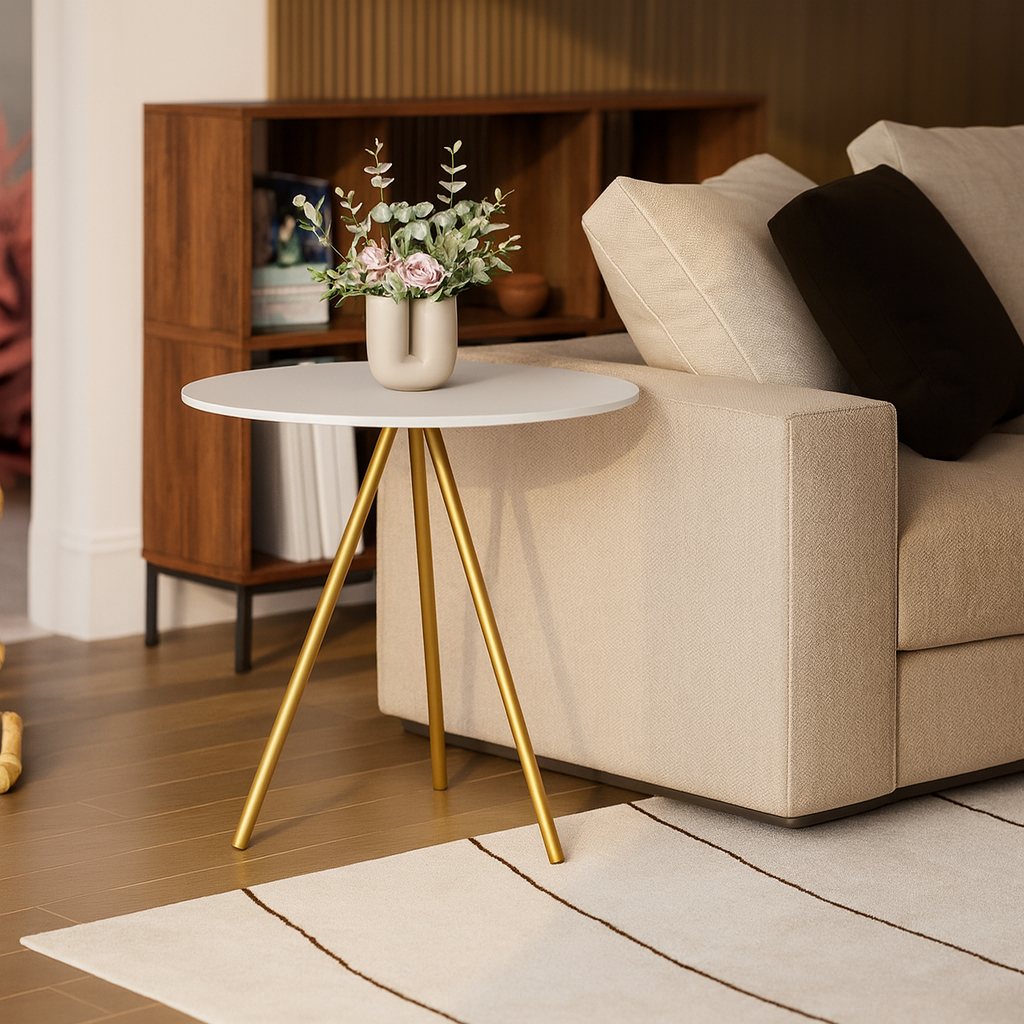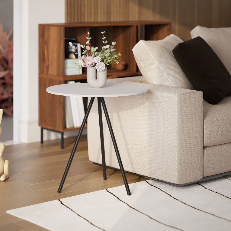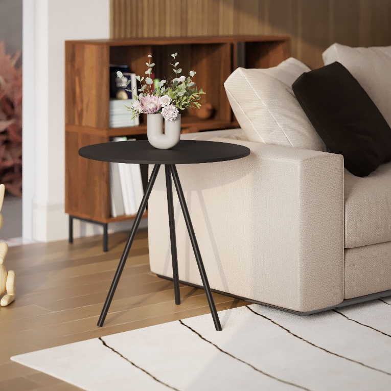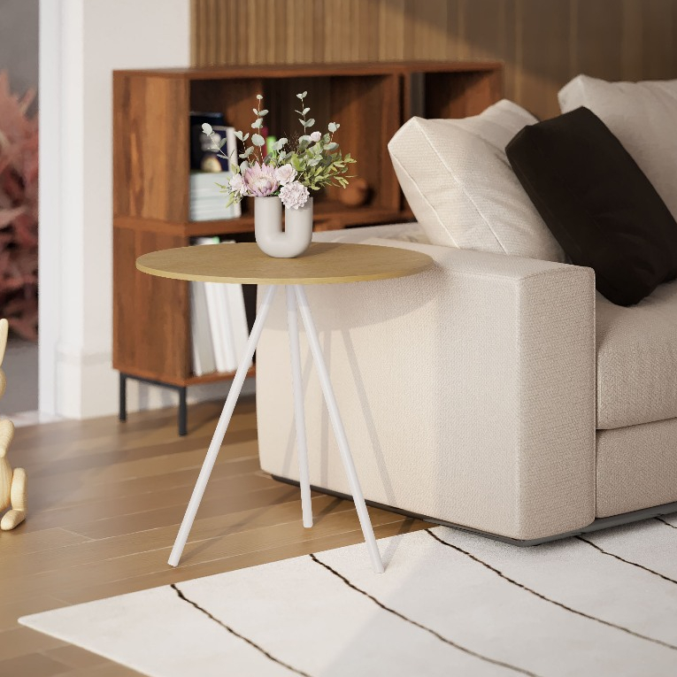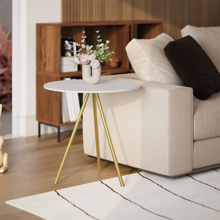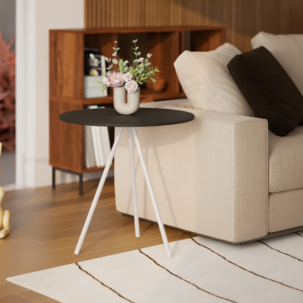 Mesinha Lateral de Canto para Sala Gabriela Base Ferro Tampo Redondo de Madeira Decoração Apoio Sofá