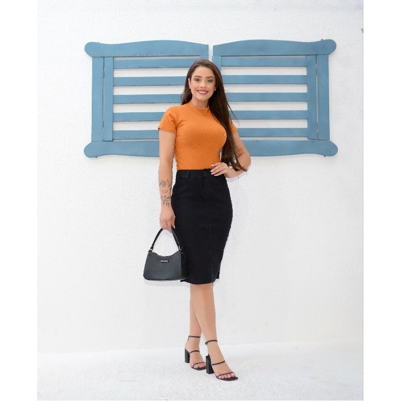 Saia Jeans Mídi Preta Com Elastano Secretaria