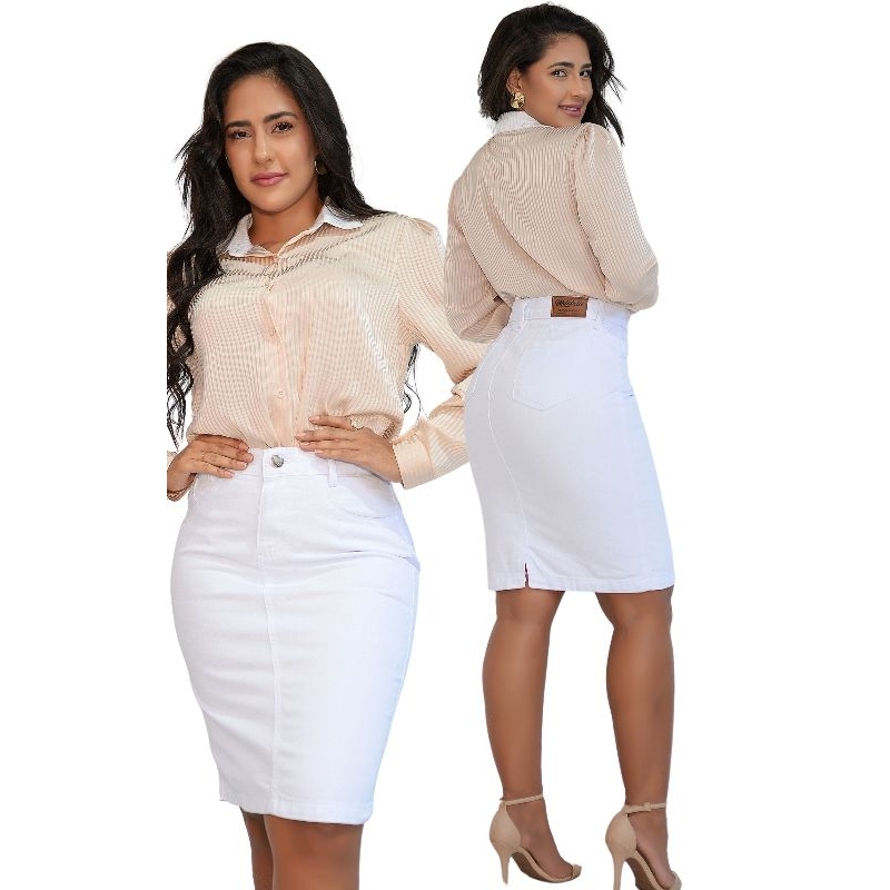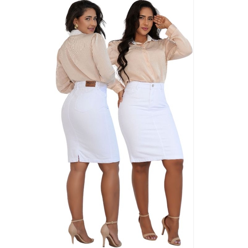 Saia Jeans Branca Secretária Midi Moda Evangélica