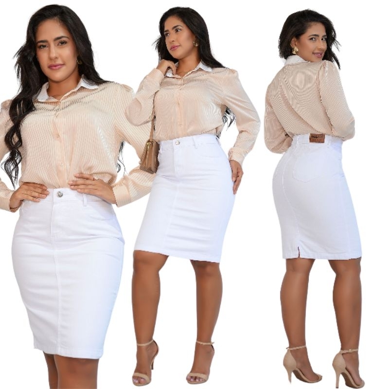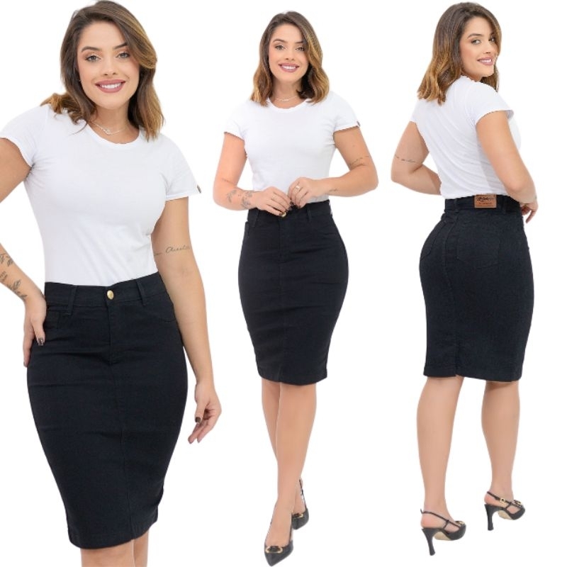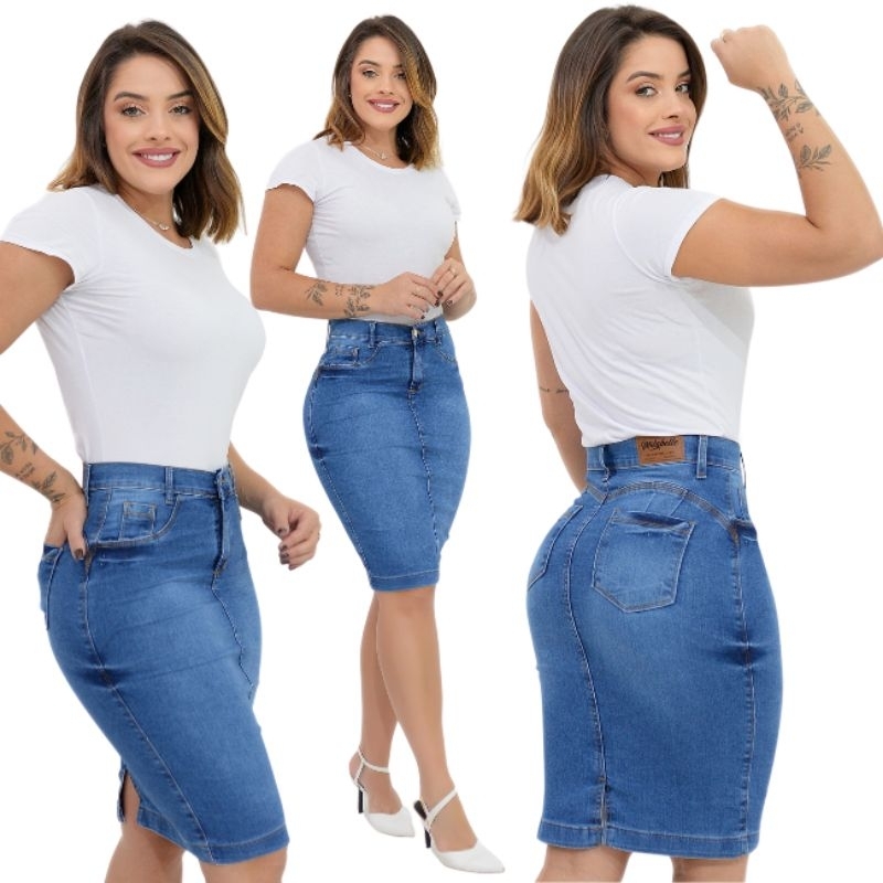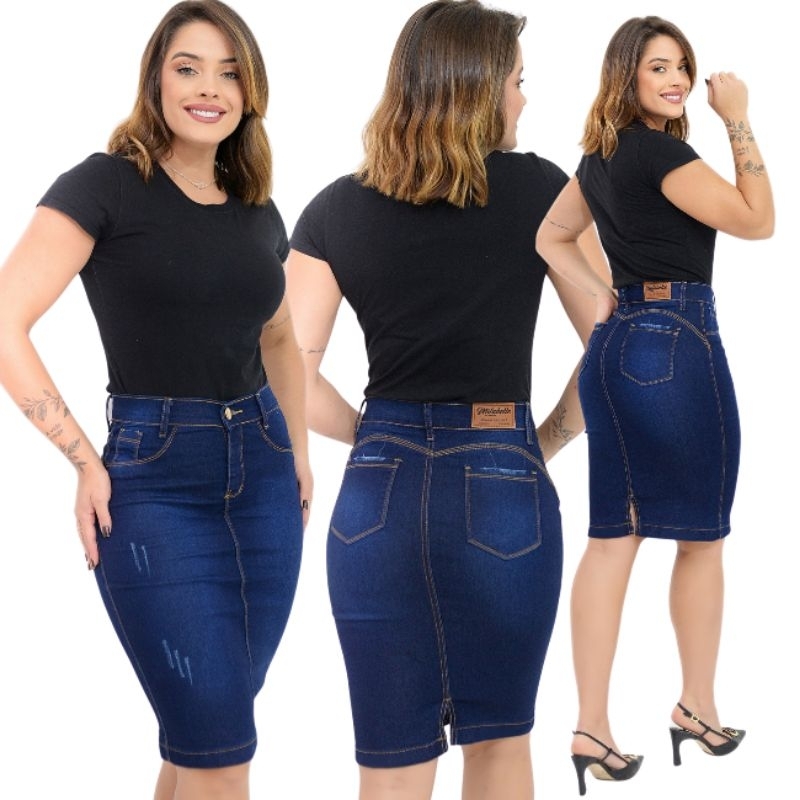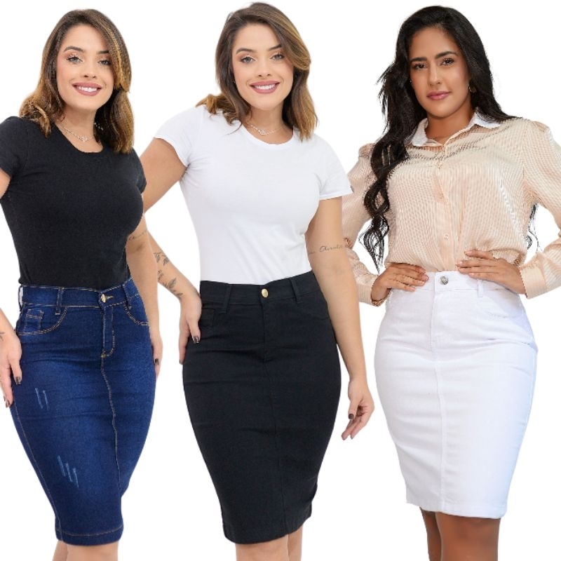 Kit 3 Saias Jeans Midi Com Elastano Cintura Alta Moda Evangélica