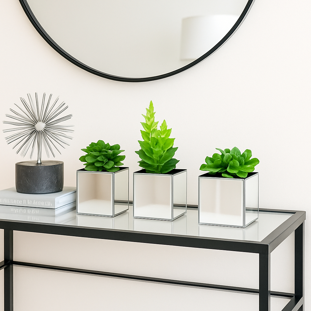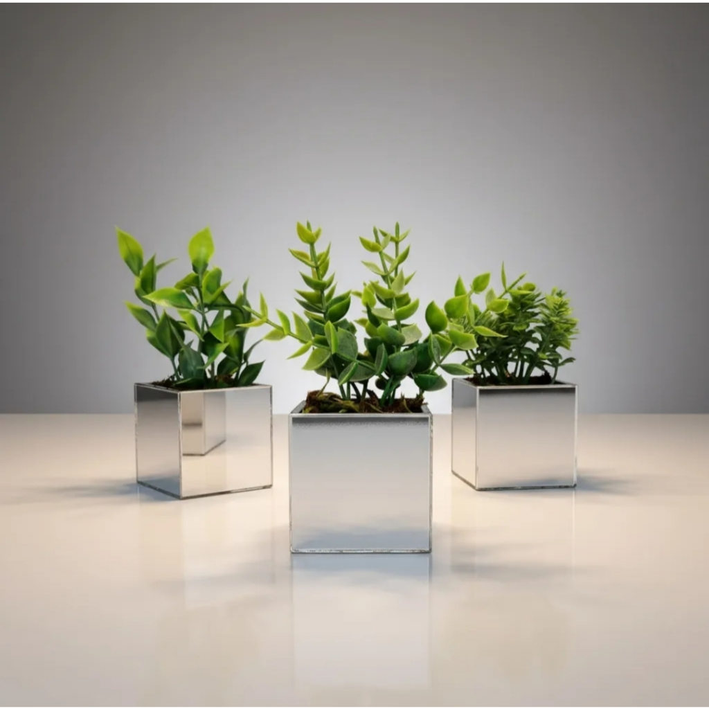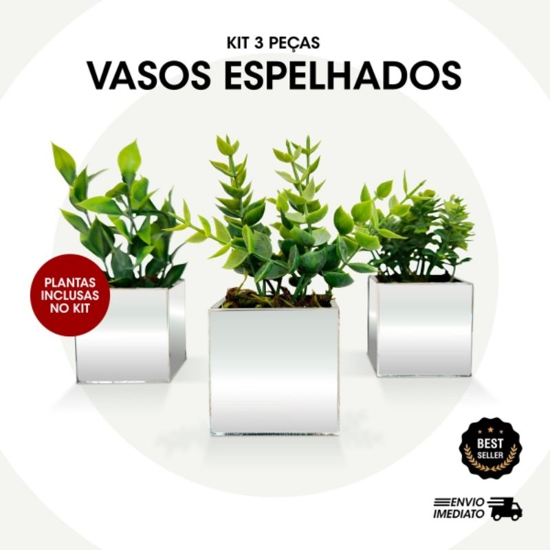 Kit 3 vasinhos espelhados com plantinhas artificiais folhagem decorativa luxo