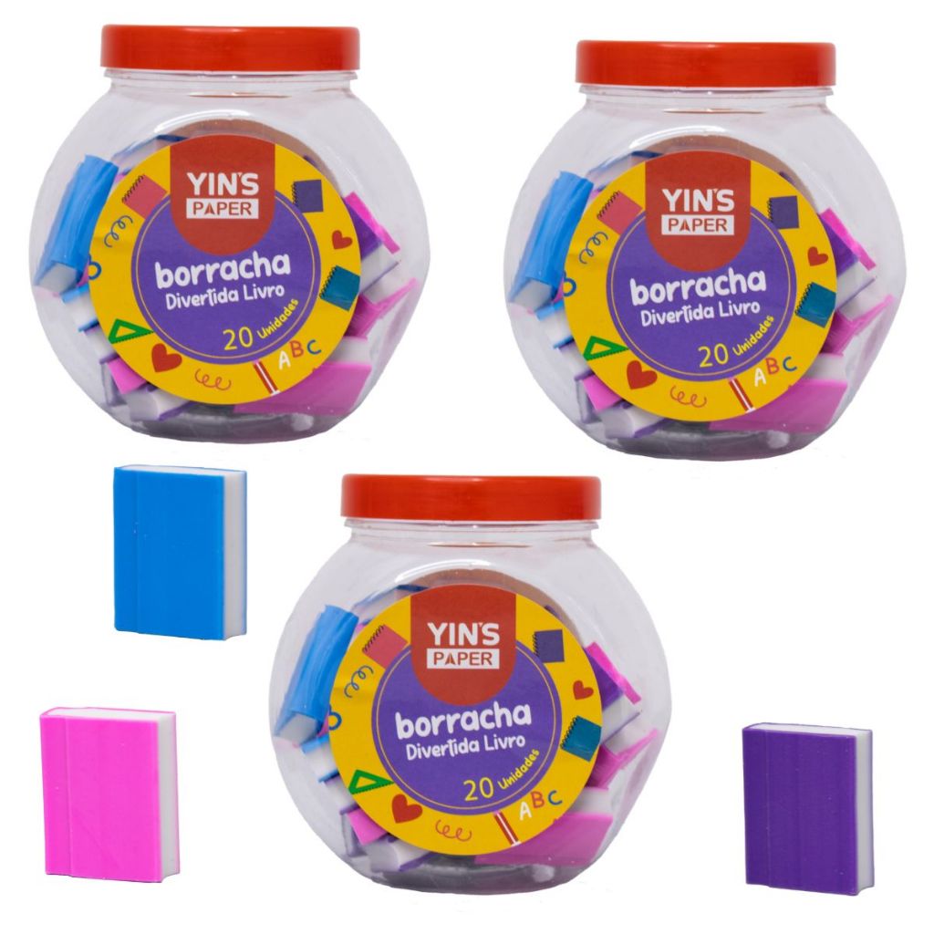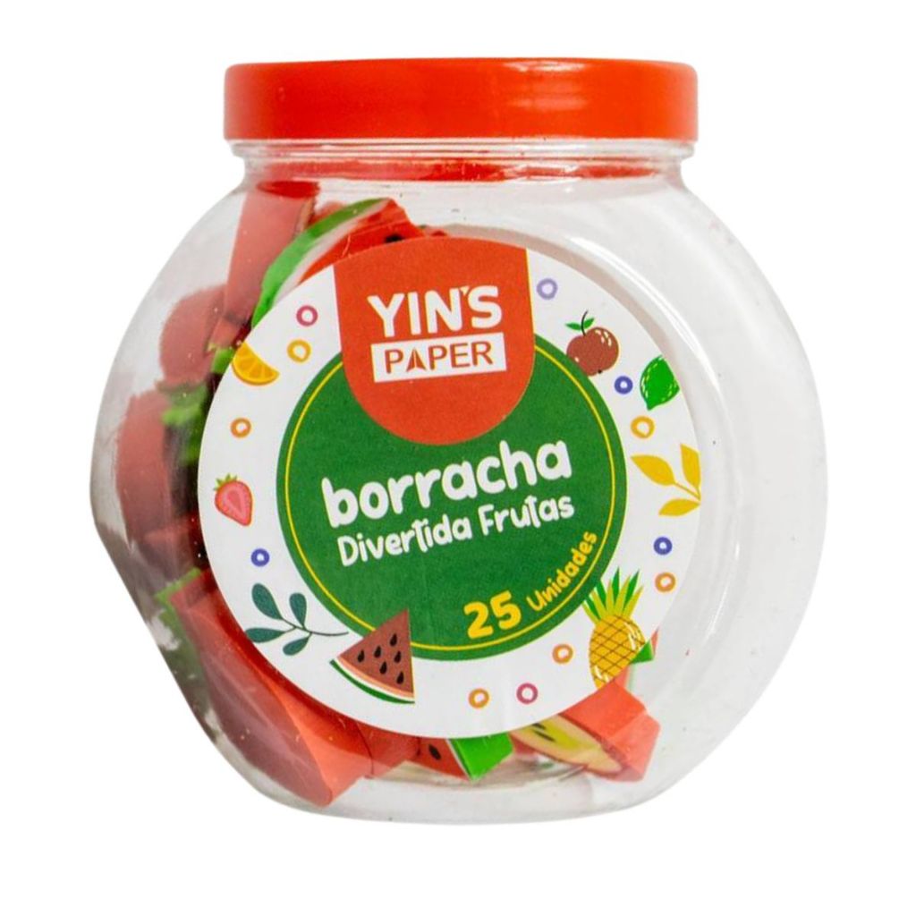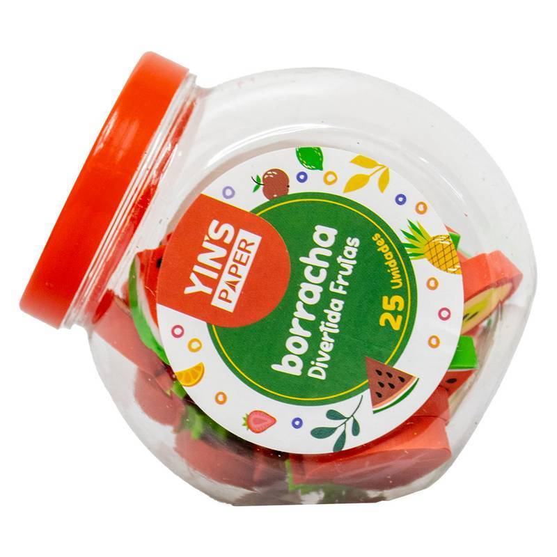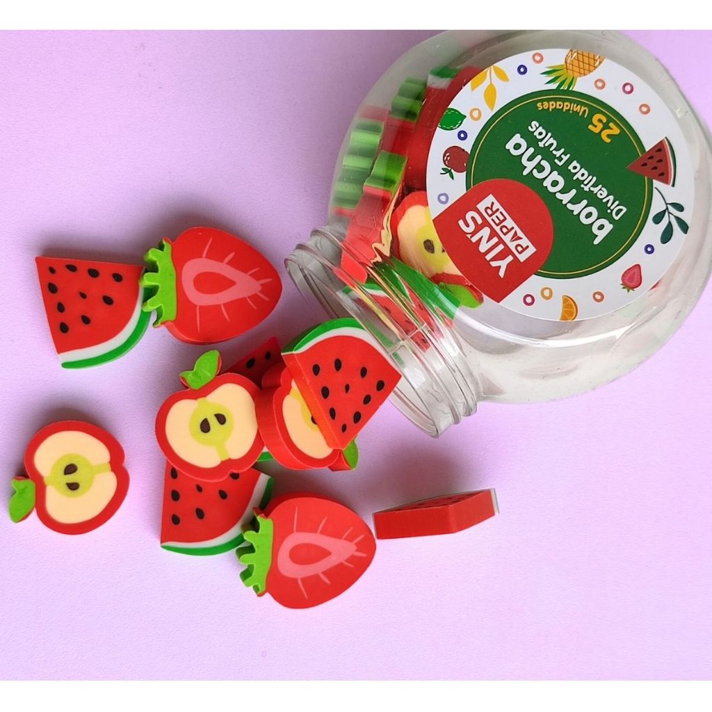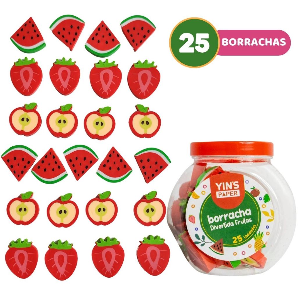 Pote com 25 Borrachas Frutas Fofas Melancia Maçã e Morango
