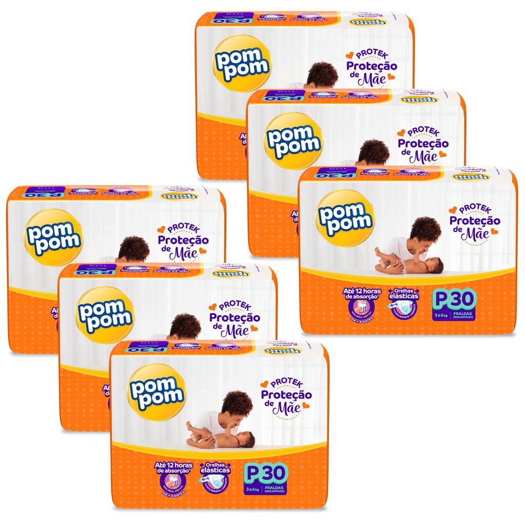Kit 6 Fraldas Pom Pom Protek Proteção de Mãe Jumbo P com 30un cada