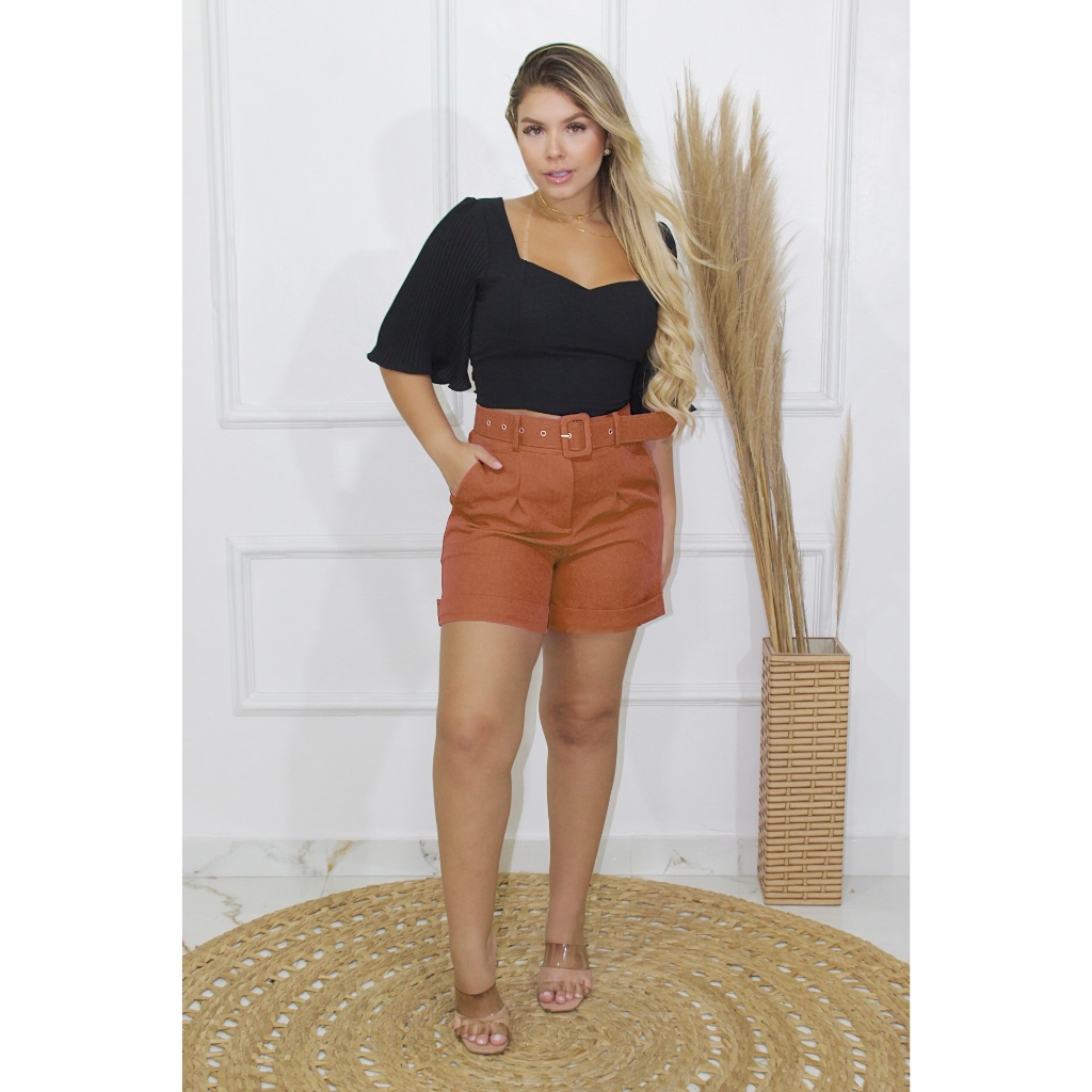 Short Feminino Alfaiataria Premium Plus Size Moda Social Com Cinto Forrado Meia Coxa Elegante