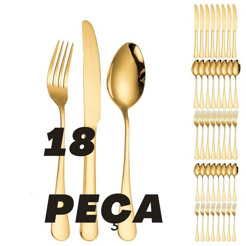 18 Talheres Ouro De Aço Inox Garfo Ou Colher Ou Faca, 6 Peças Faca + 6 Peças Garfo + 6 Peças Colher