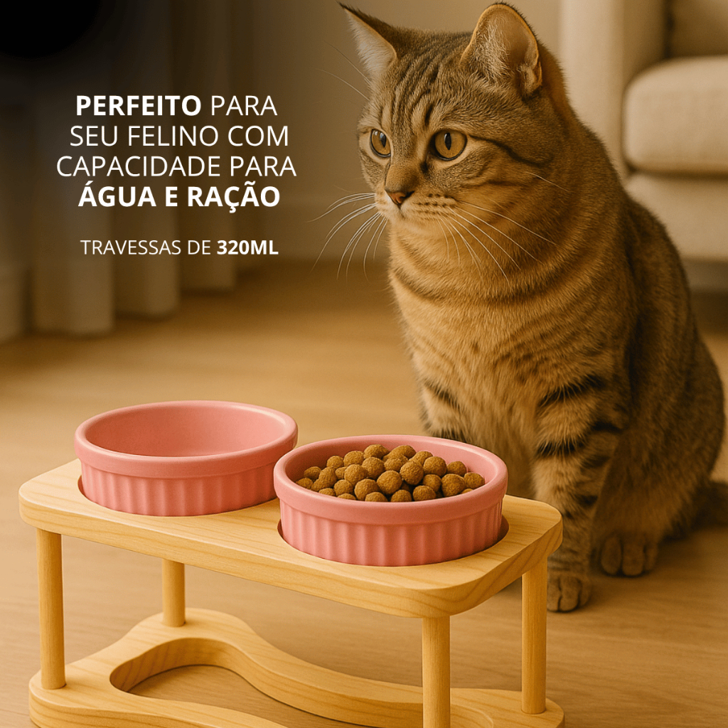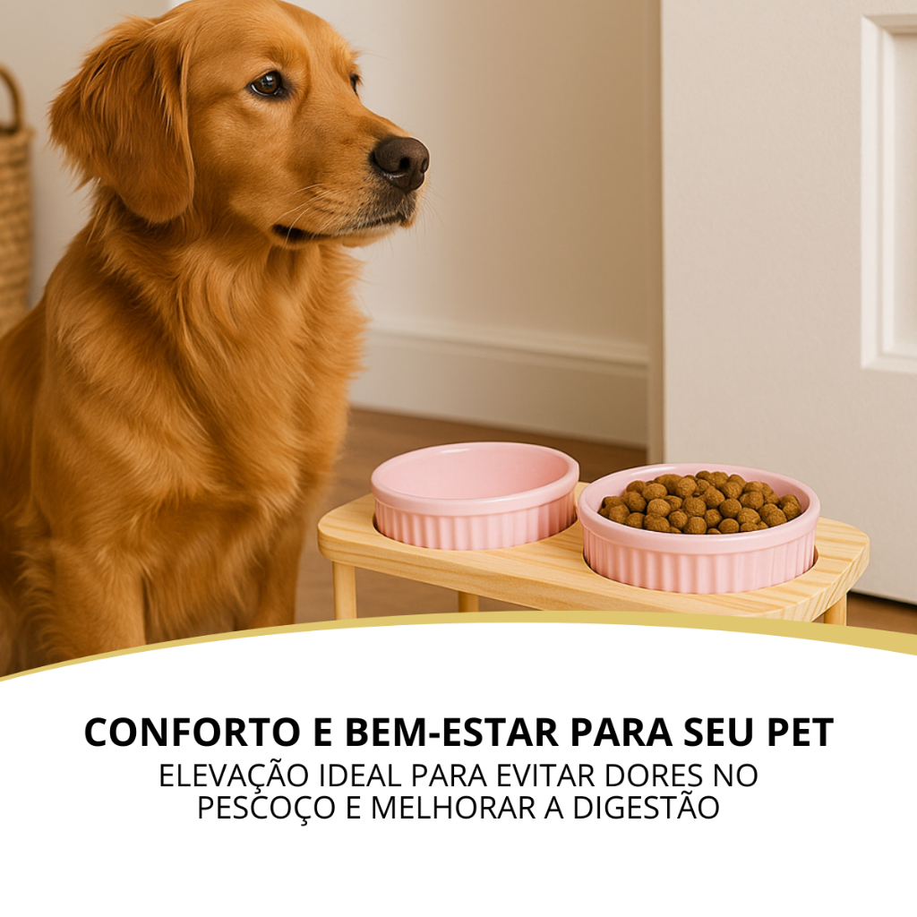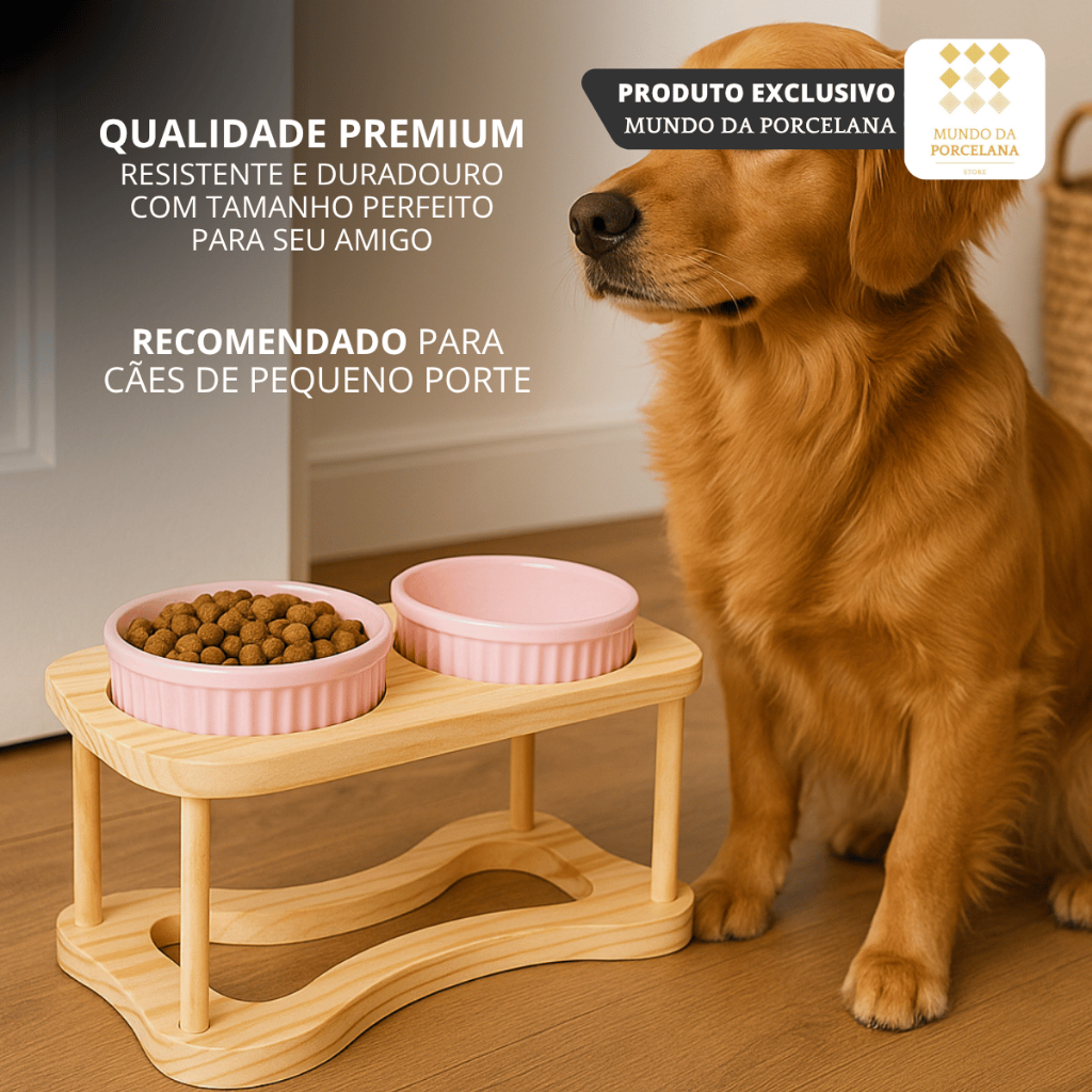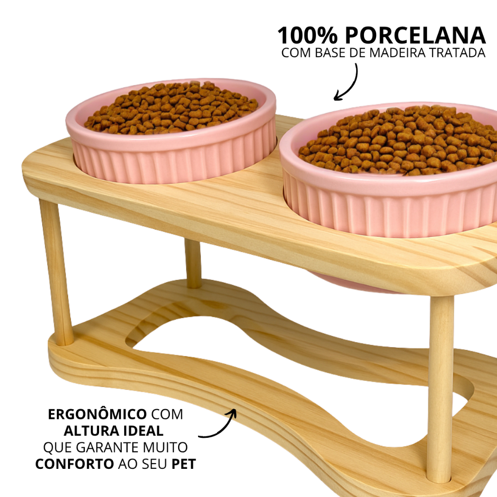 Comedouro Duplo Porcelana Rosa Elevado Gato e Cão Cachorro Bebedouro Petshop