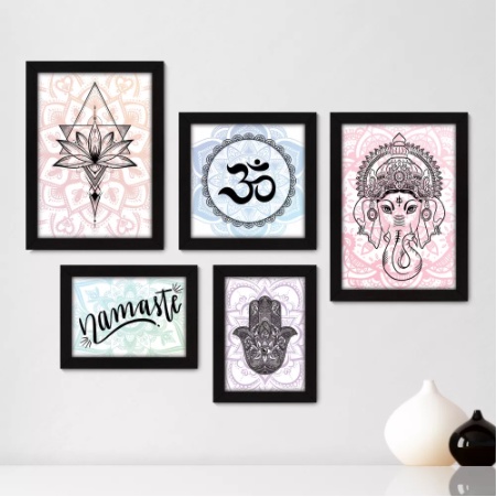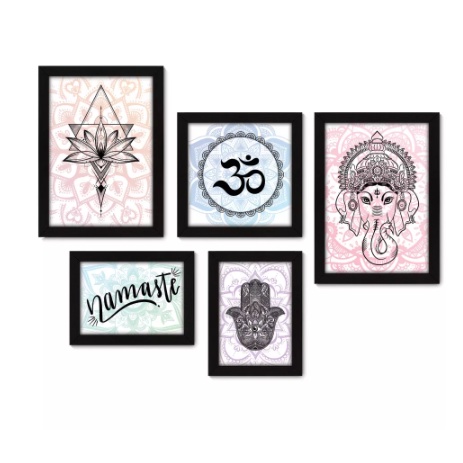 Quadros decorativos 5 peças mosaicos para sua sala ou quarto Ganesha - Flor de Lótus - Om - Namastê - Hamsa Star = 270