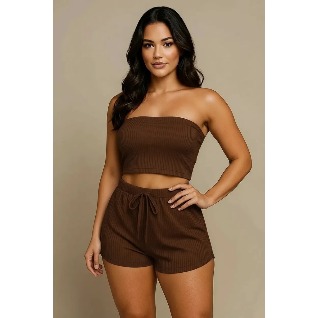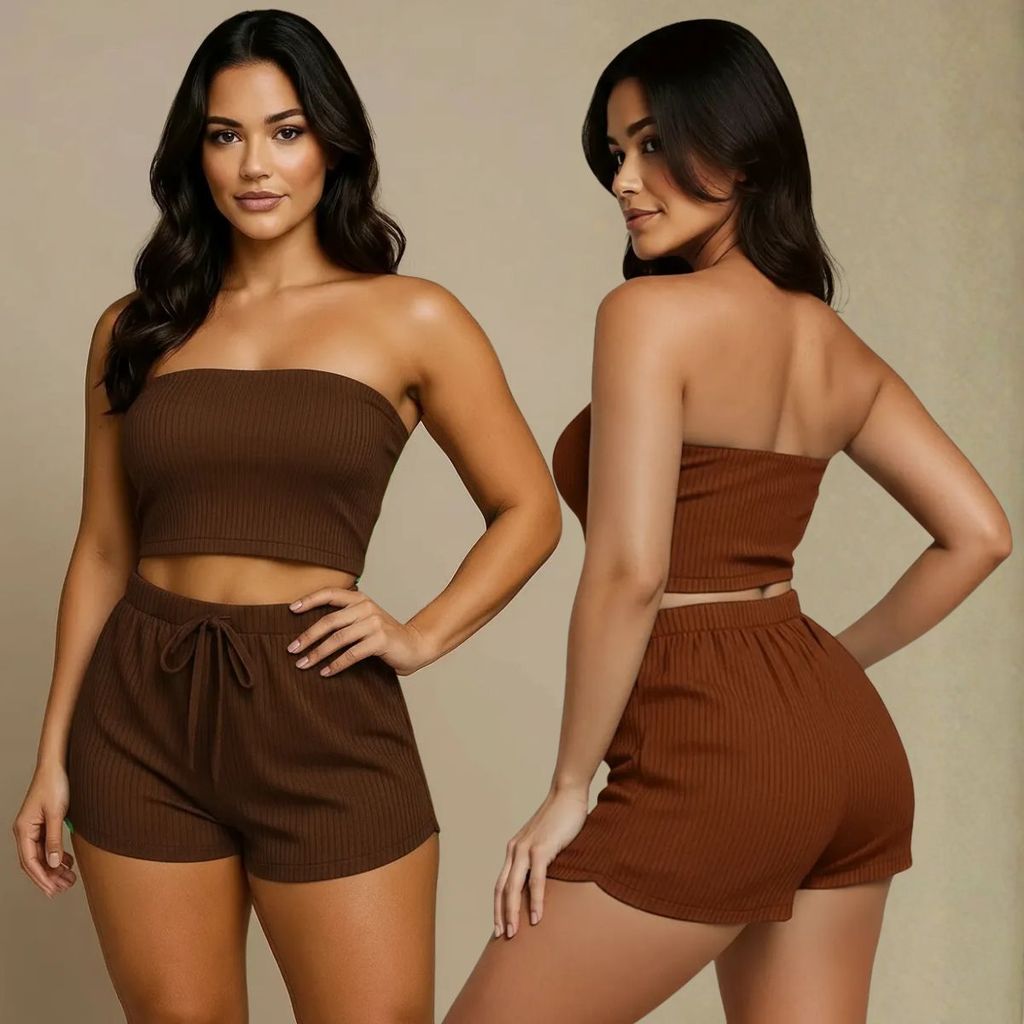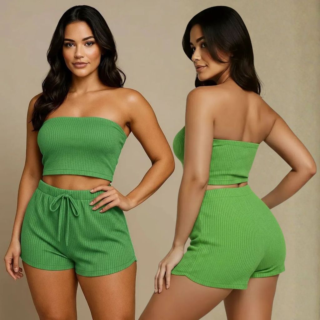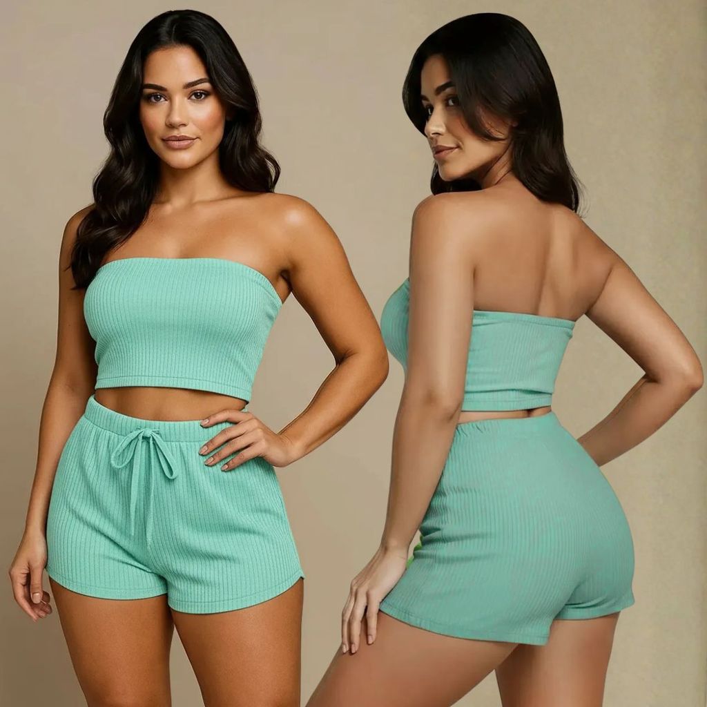 Conjunto Femenino Cropped e Short Conjunto Feminino Verão Canelado Top e Shorts Feninino Duas Peças Tamanho 36 ao 58
