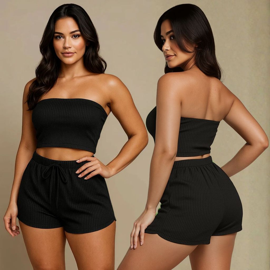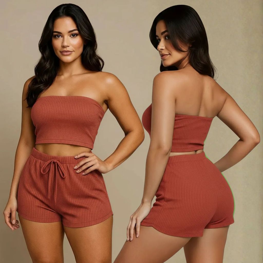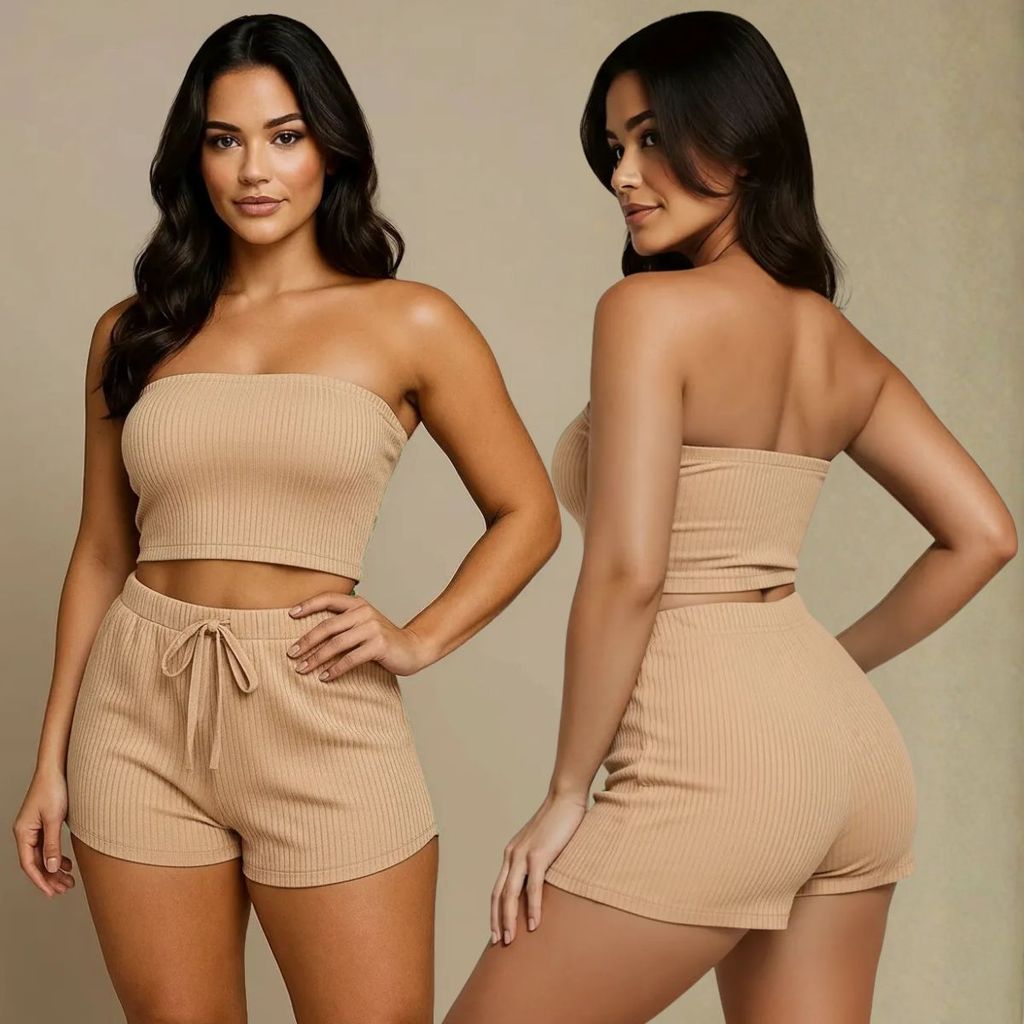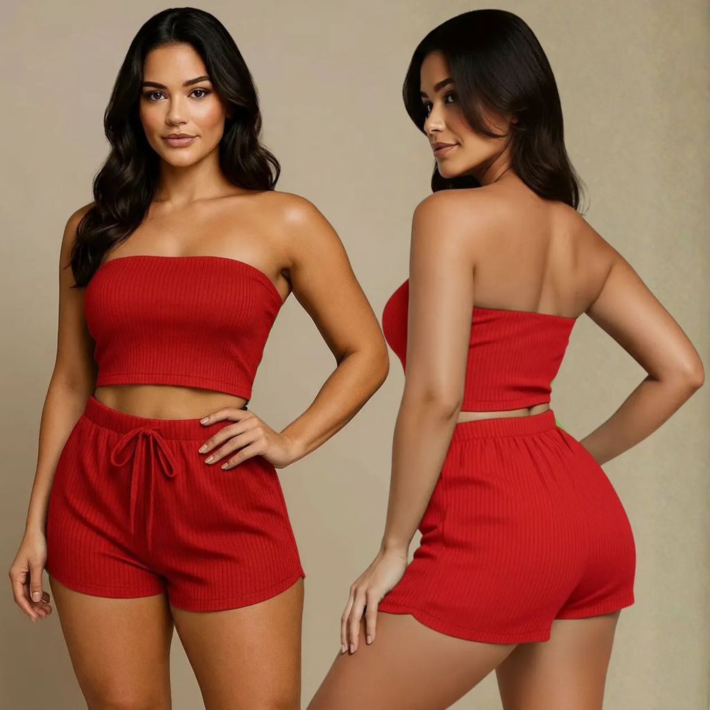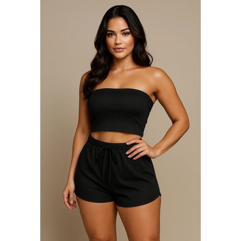 Conjunto Femenino Cropped e Short Conjunto Feminino Verão Canelado Top e Shorts Feninino Duas Peças Tamanho 36 ao 58