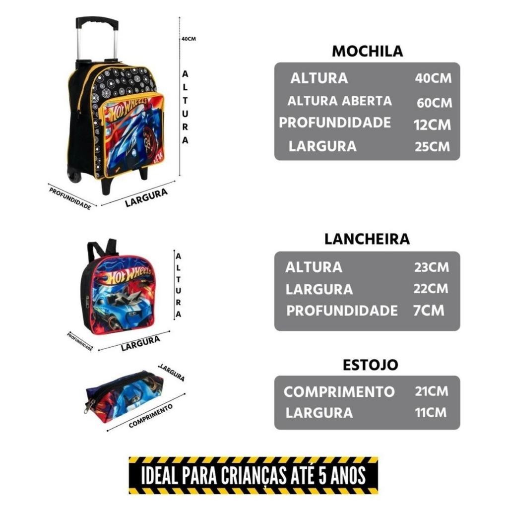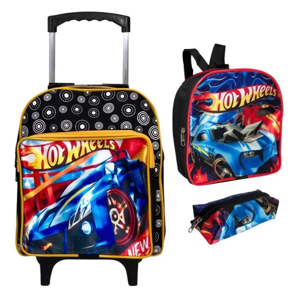 KIT Creche Bolsa Escolar com Rodinhas Resistente Dois Bolsos Grandes Hotwheels Para Meninos com Lancheira e estojo