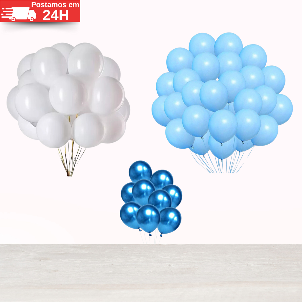 Kit 125 Balões Azul Claro + Branco + Azul Cromado - Bexiga Liso Metalizado Festas Aniversários