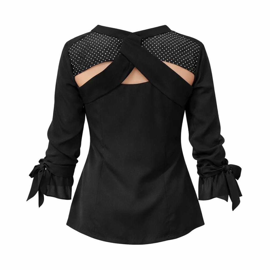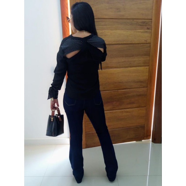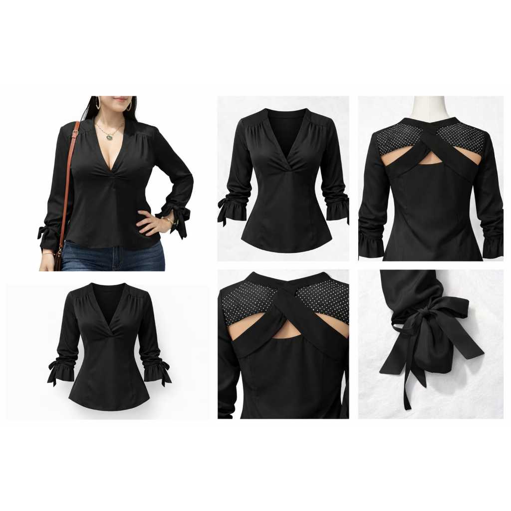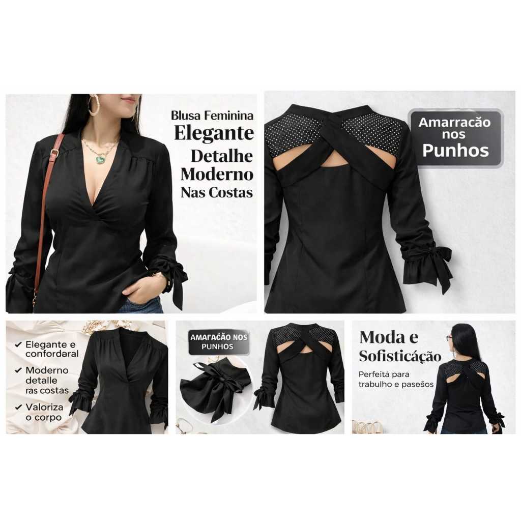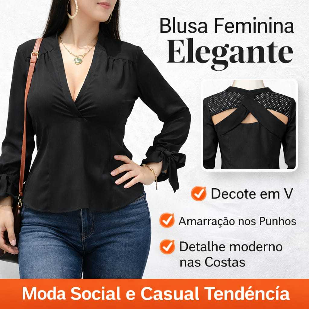 Blusa Feminina Elegante Manga Longa Decote V com Detalhe nas Costas Moda Social e Casual Tendência