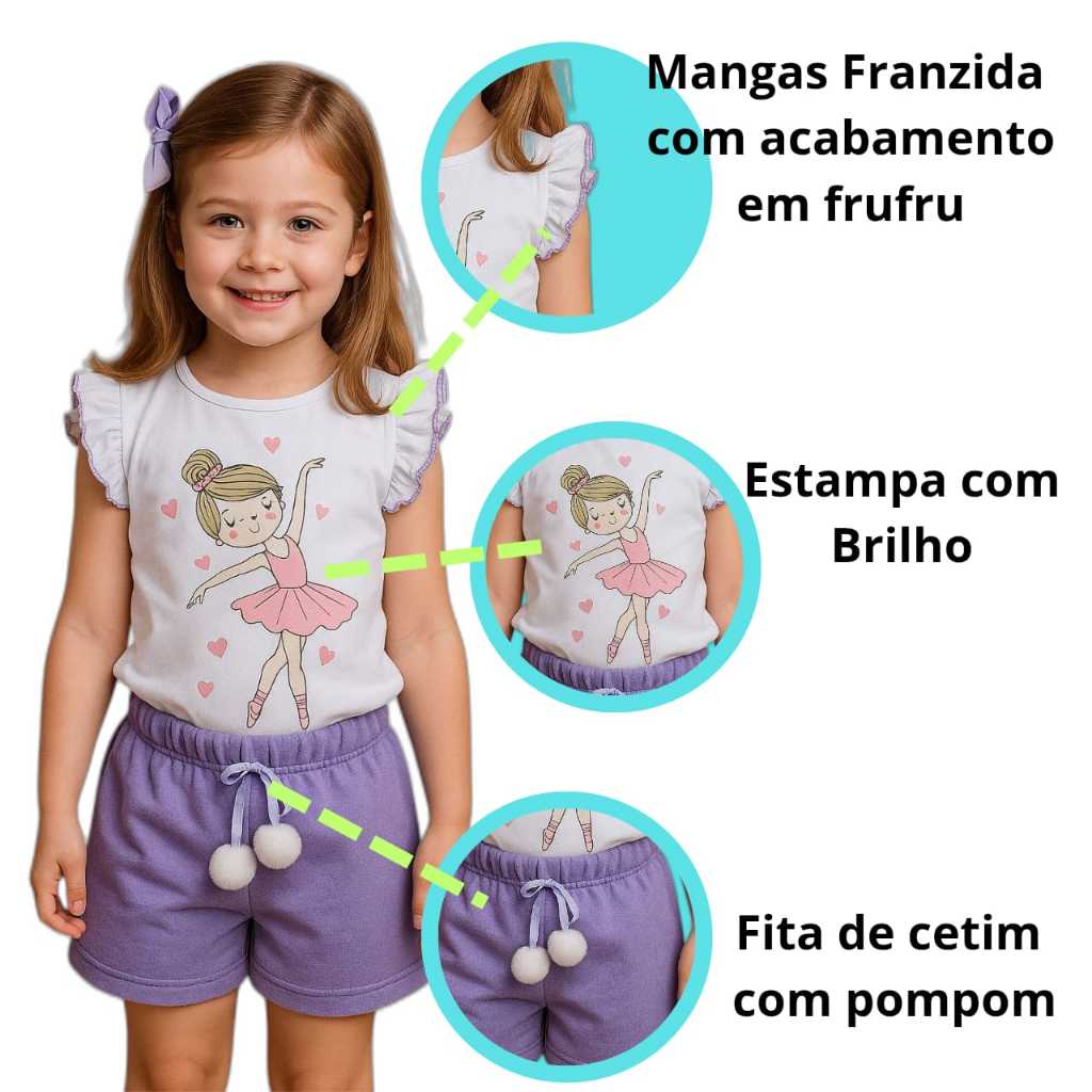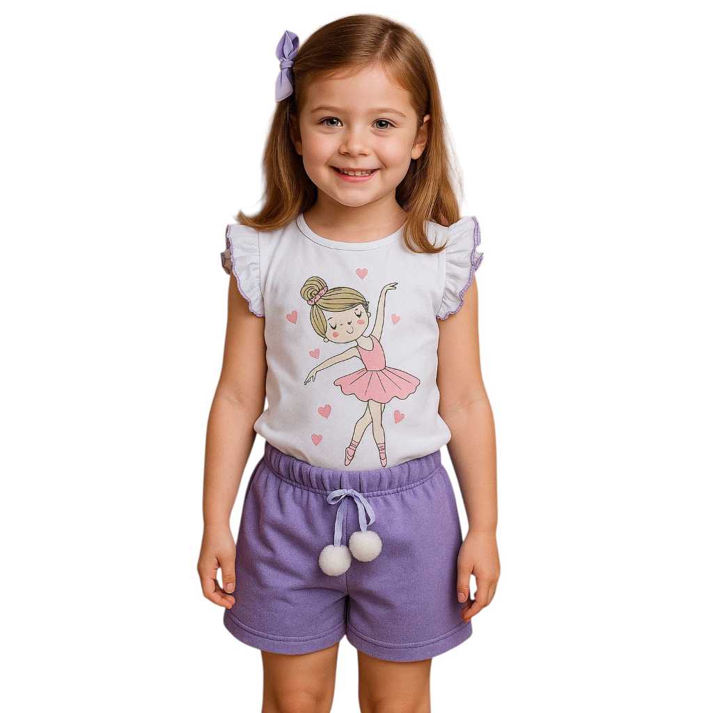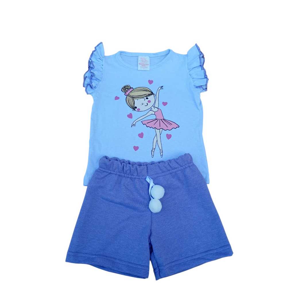 Conjunto de verão infantil menina .Blusa com manga franzida +Bermuda com pompom 2 ao 10 anos