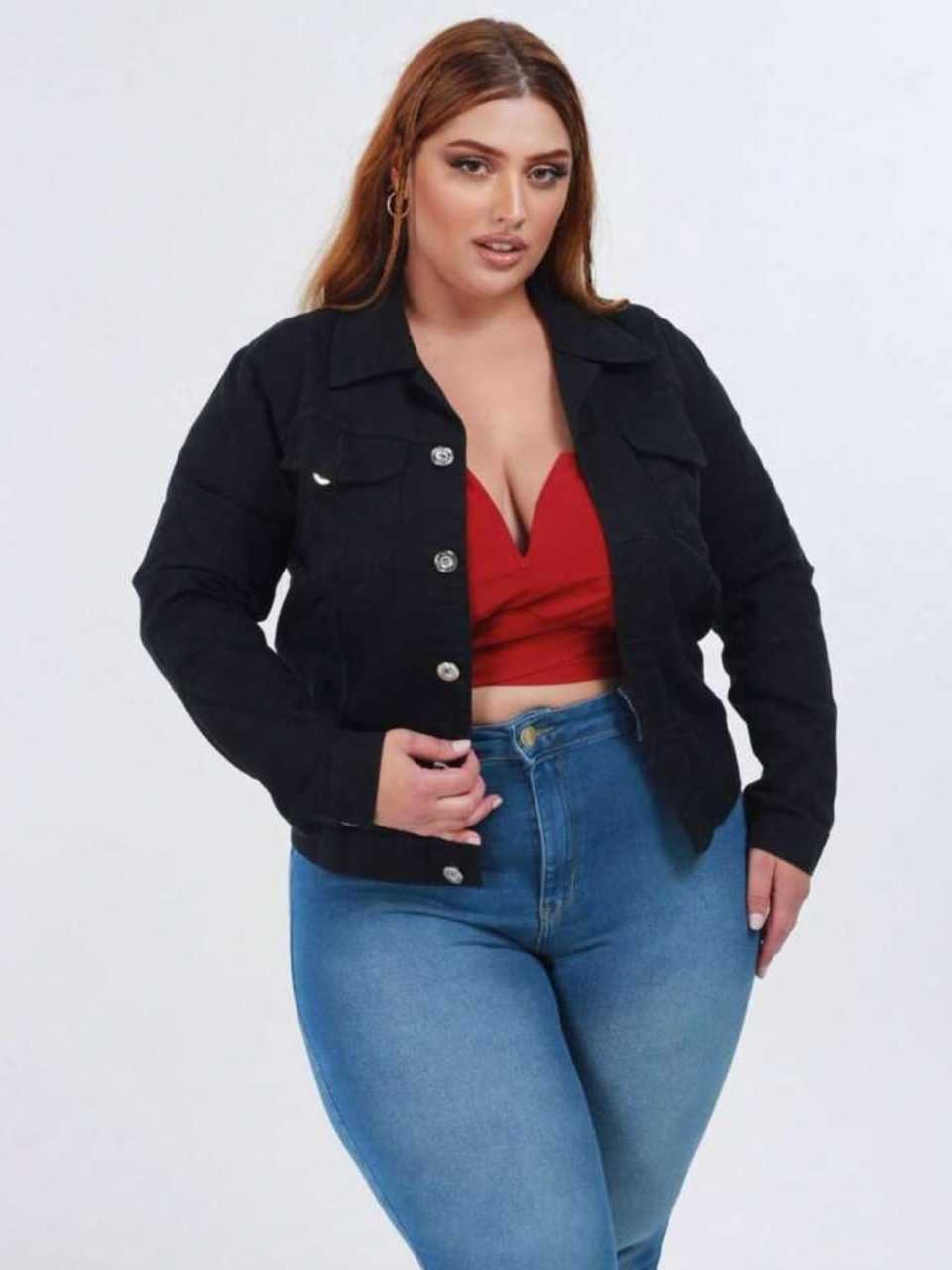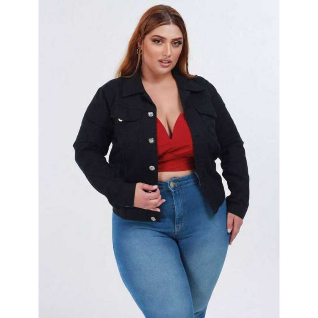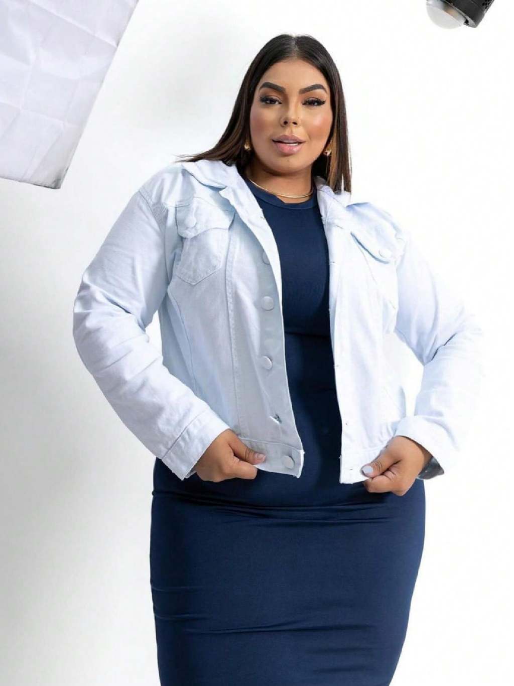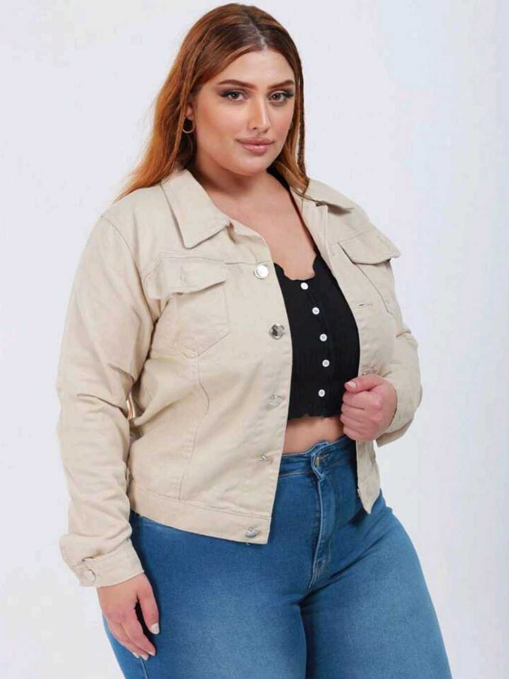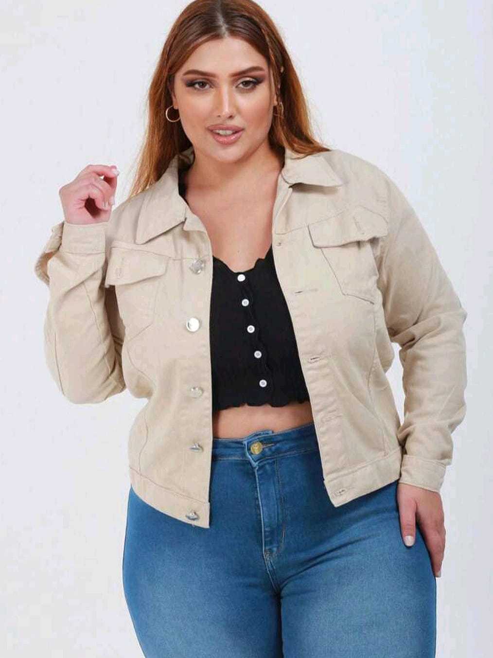 Jaqueta Jeans Feminina Plus Size com Bolso e Barra Branco, Bege e Preto Moda Outono Inverno