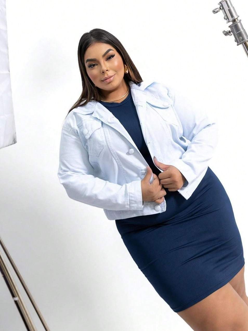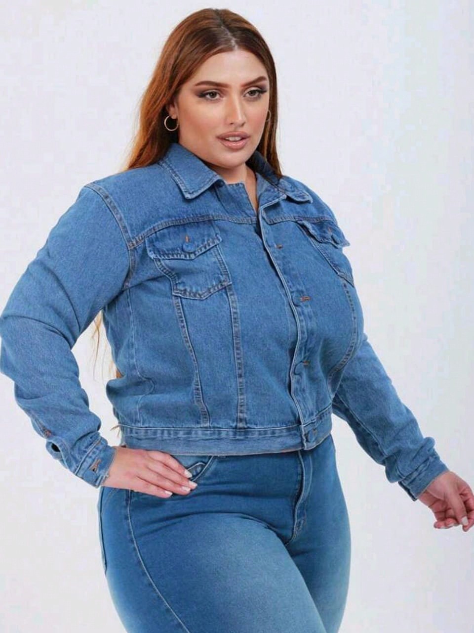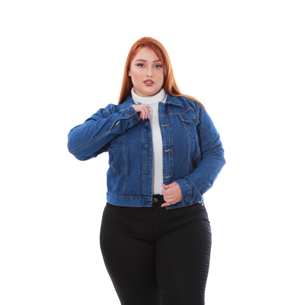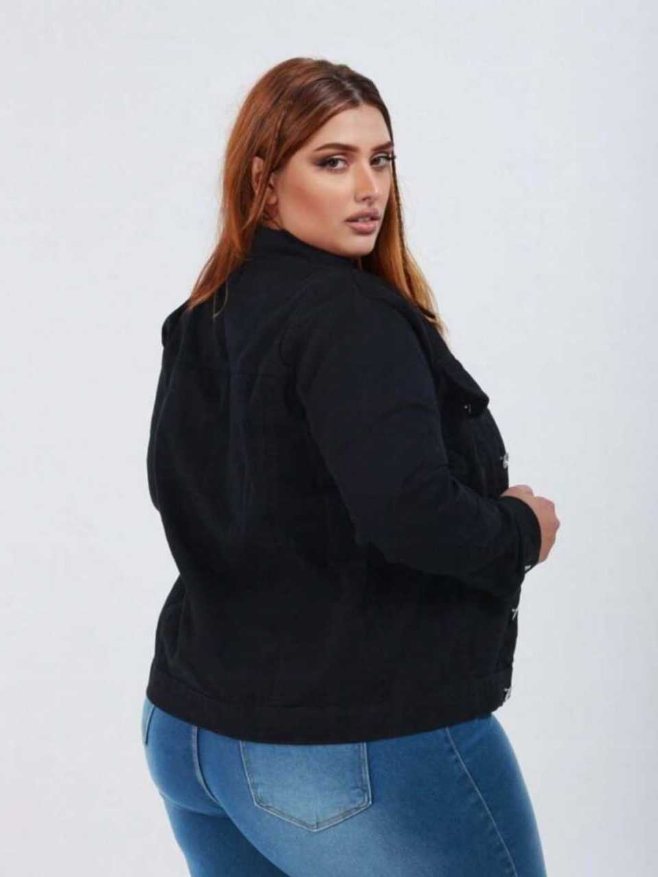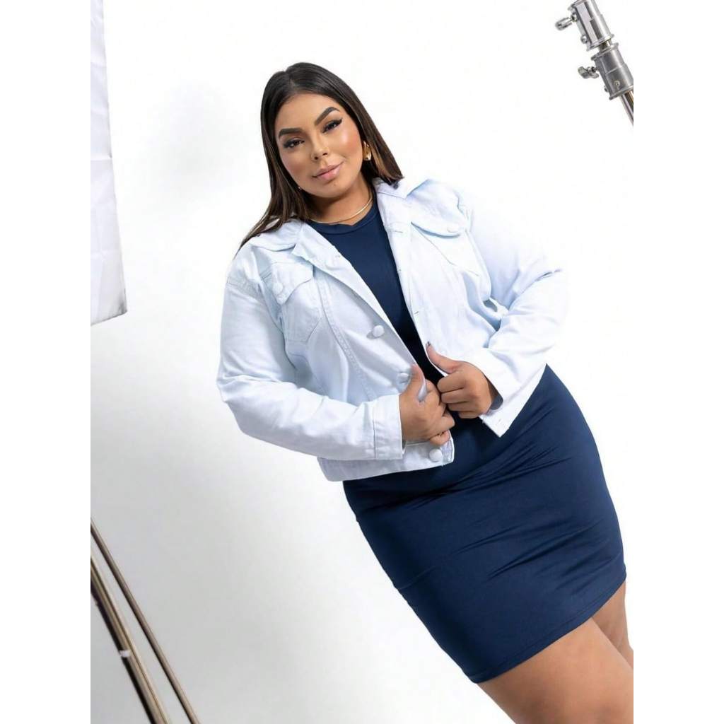 Jaqueta Jeans Feminina Plus Size com Bolso e Barra Branco, Bege e Preto Moda Outono Inverno
